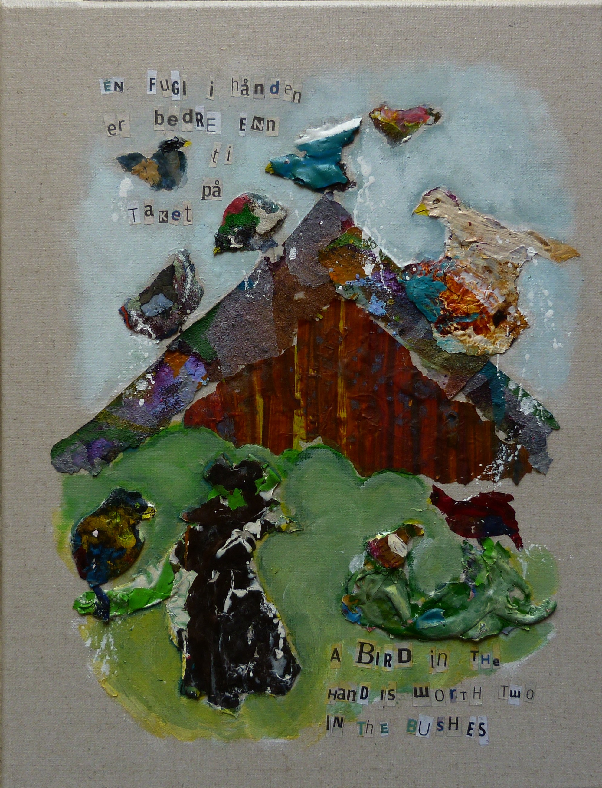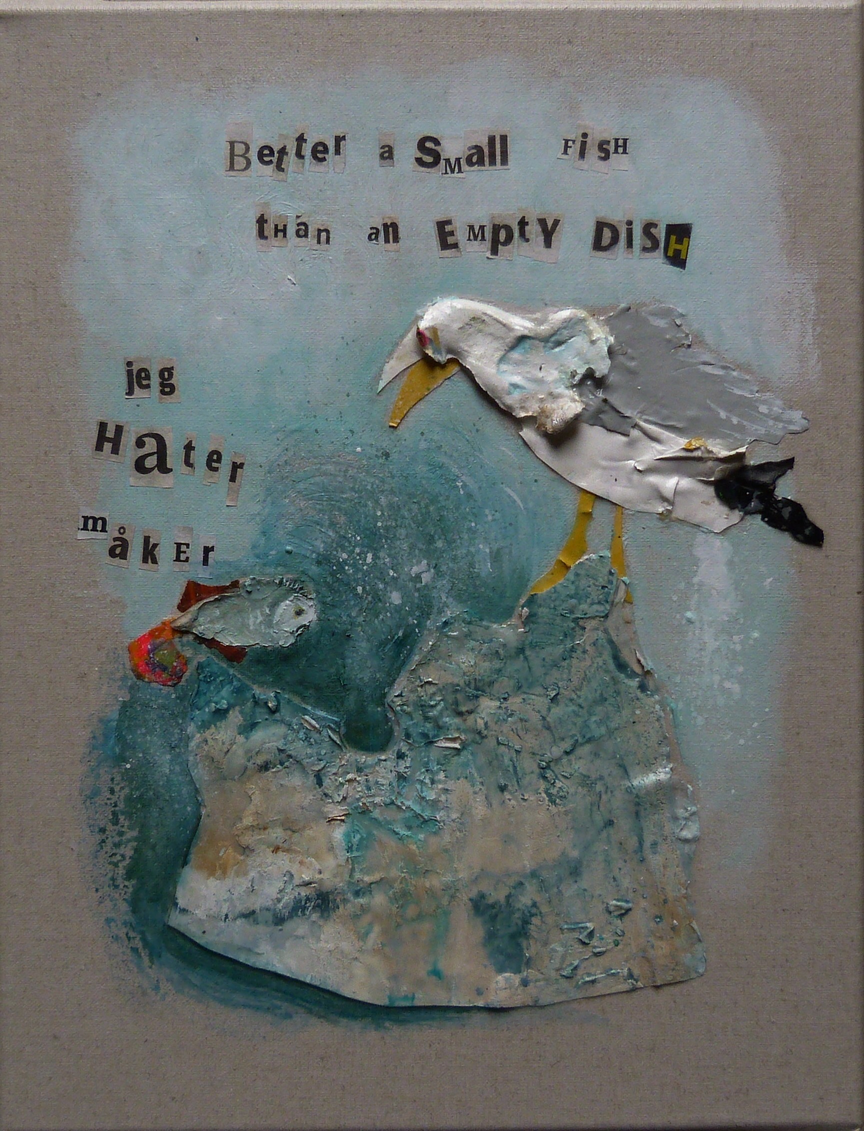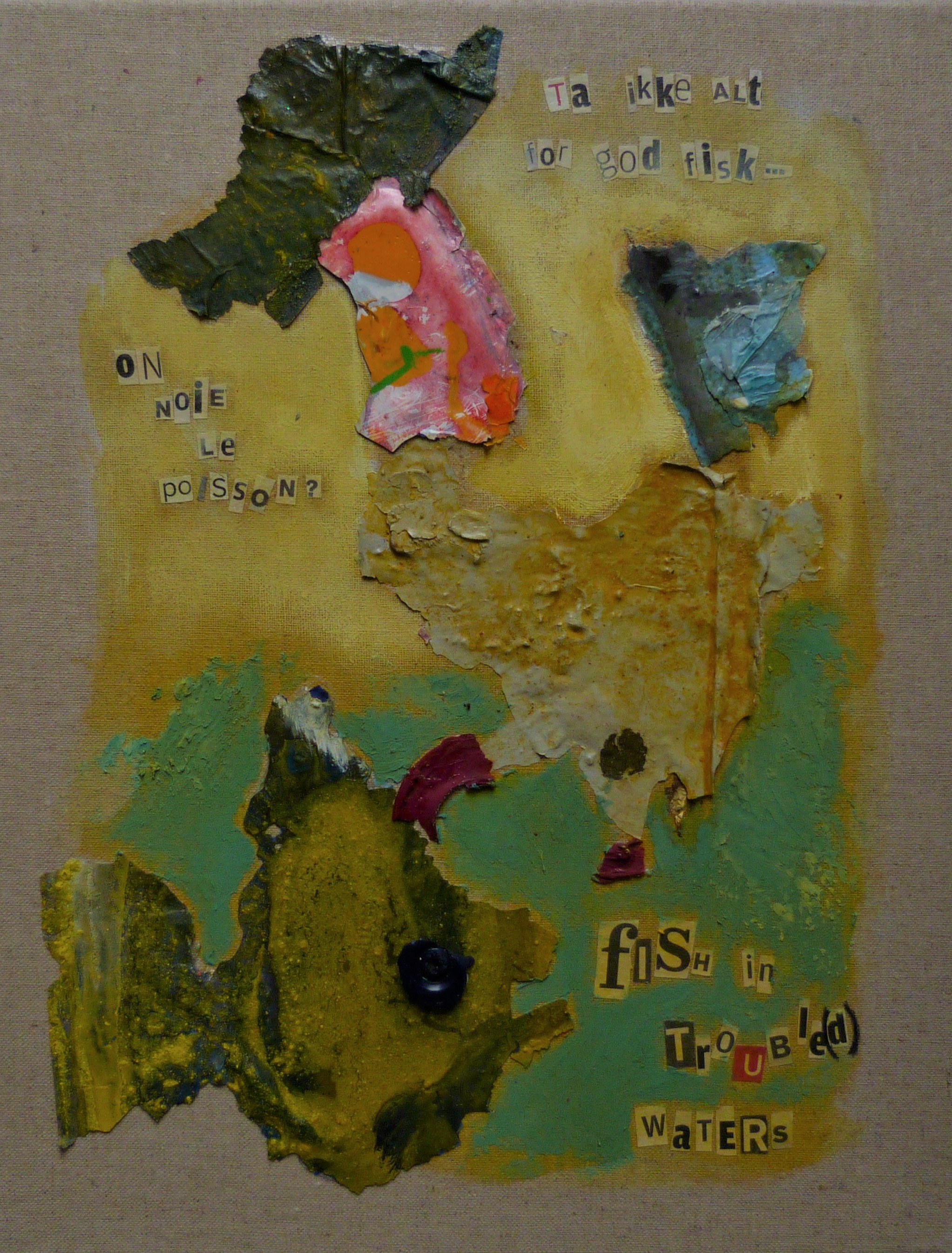 Pour une exposition entre mer et terre, au phare Ryvarden en Norvège en 2017, j’ai créé une série de collages sur toiles de lin que j'ai intitulée Impressions et expressions anonymes / Neither Fish nor Fowl en utilisant et en comparant des expressions et dictons norvégiens, anglophones et / ou français autour de poissons et d'oiseaux.