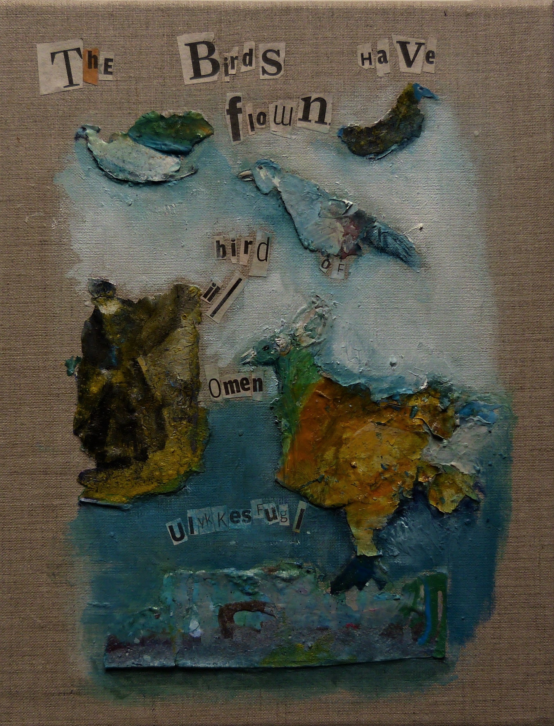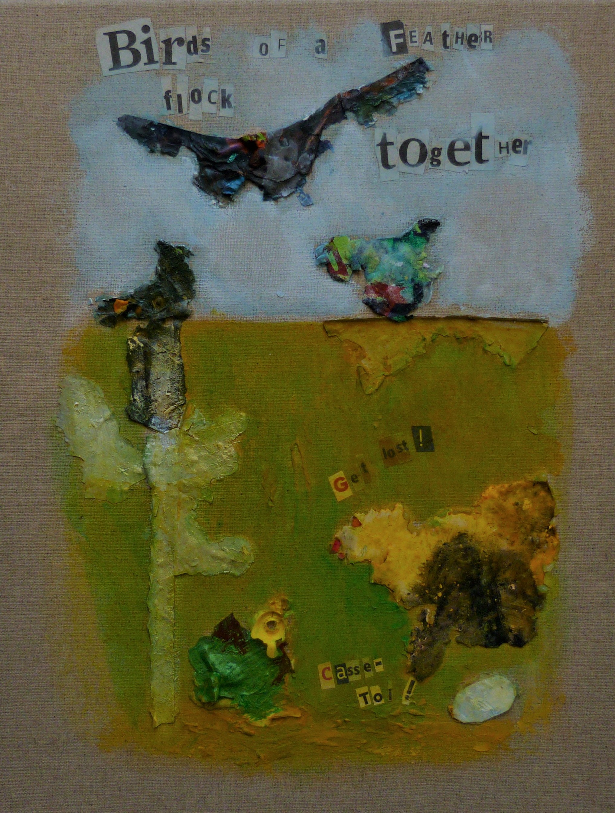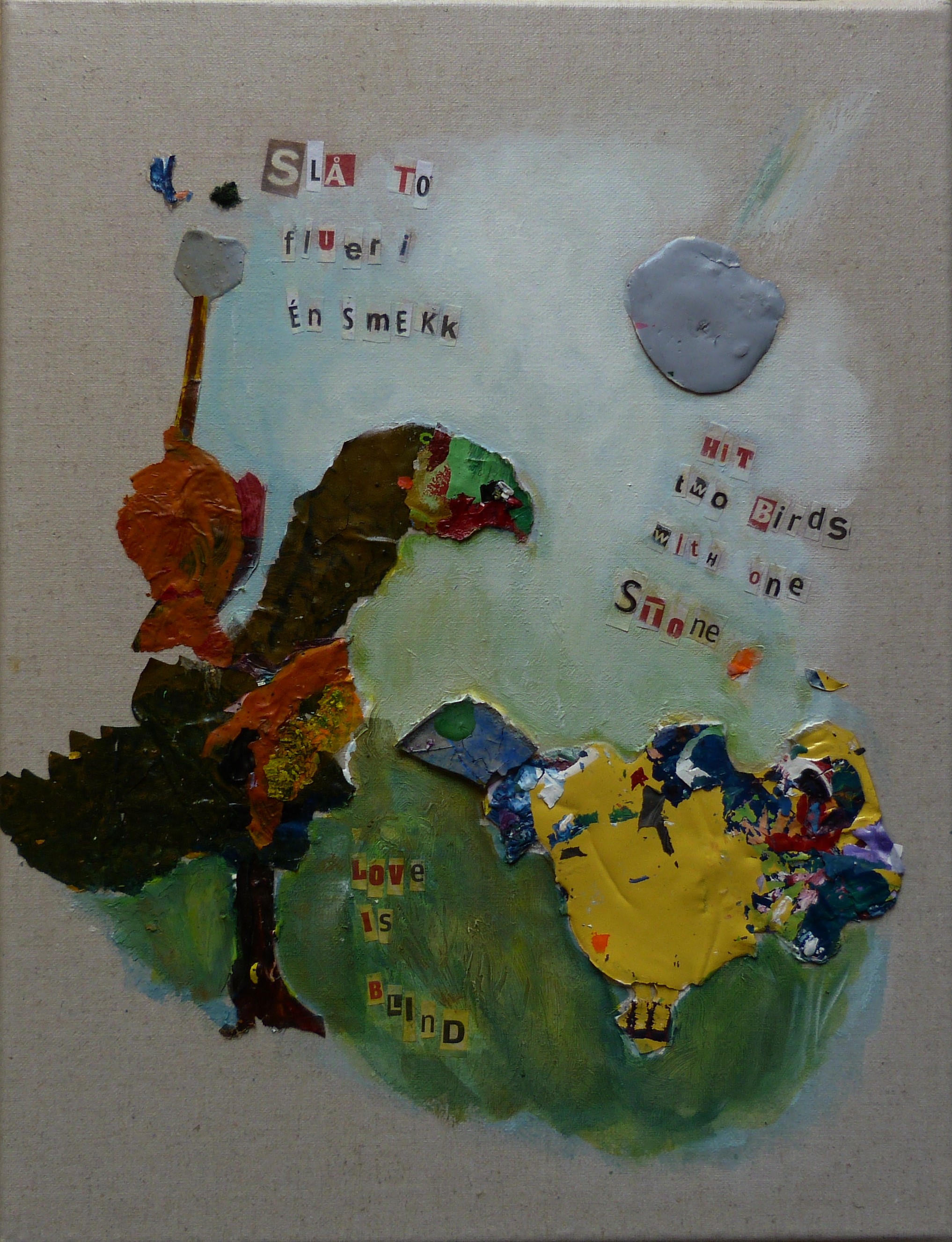 Pour une exposition entre mer et terre, au phare Ryvarden en Norvège en 2017, j’ai créé une série de collages sur toiles de lin que j'ai intitulée Impressions et expressions anonymes / Neither Fish nor Fowl en utilisant et en comparant des expressions et dictons norvégiens, anglophones et / ou français autour de poissons et d'oiseaux.