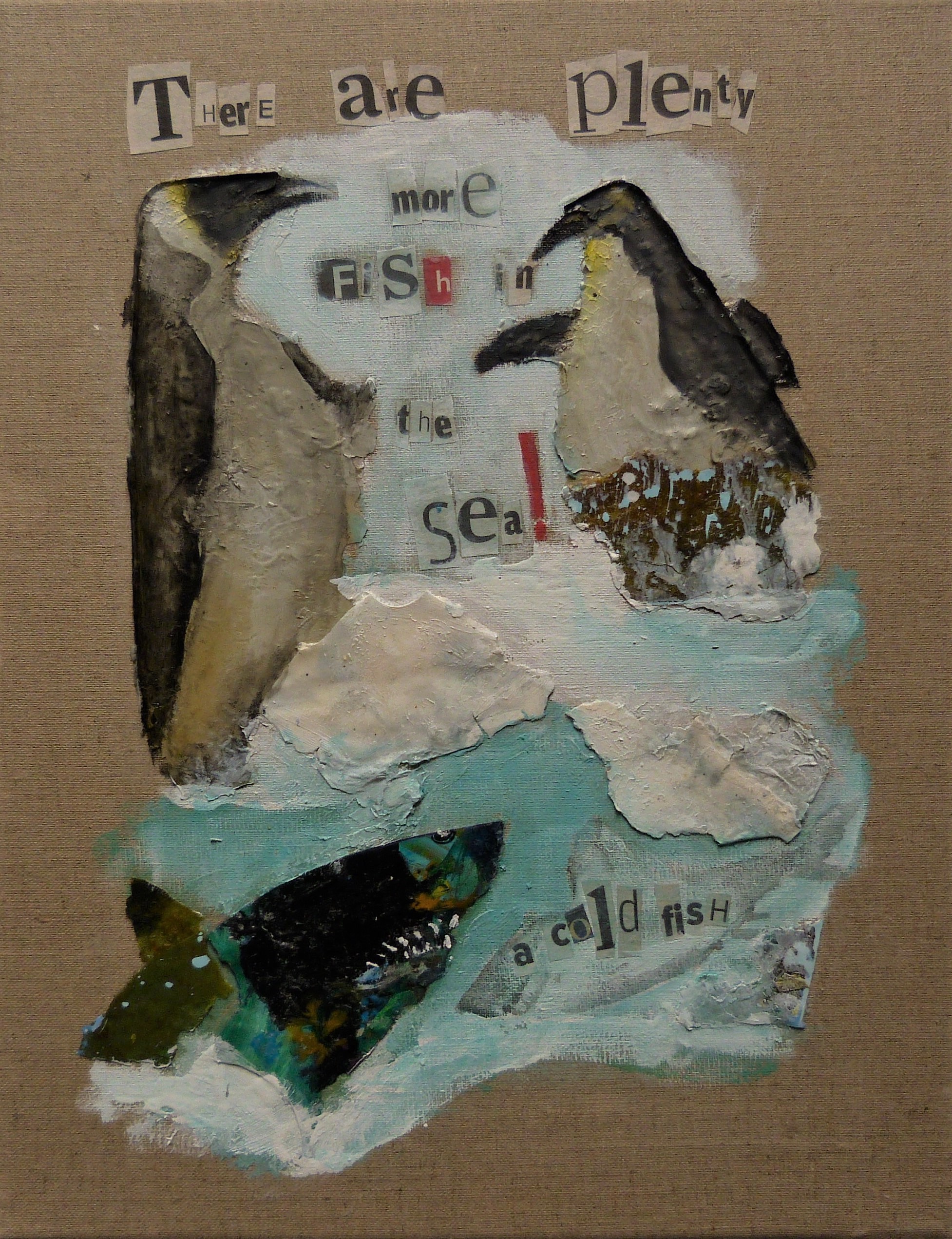 Til utstillingen Innsikt | Utsikt, mellom hav og land, på Ryvarden Kulturfyr i 2017, lekte jeg med en serie collage på linlerret som jeg kalte Inntrykk og anonyme uttrykk / Hverken Fugl eller Fisk hvor jeg tok utgangspunkt i norske, engelske og /eller franske uttrykk og ordtak rundt fisker og fugler. Jeg brukte de formene tilfeldighetene ga meg fra lag av tørket plast - akrylmaling - med håp om at de aldri havner i havet.