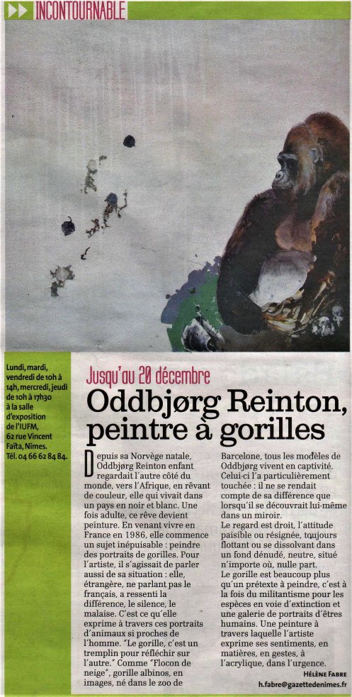 Le travail d’Oddbjørg Reinton est une histoire d’oppositions répétées. De pôles extrêmes, de noir et de blanc, de présence et d’absence. L’hémisphère Sud et l’hémisphère Nord, le gorille et l’ours blanc. Selon l’artiste, inclure les animaux dans le champ du tableau, c’est à la fois les protéger et symboliquement les multiplier.