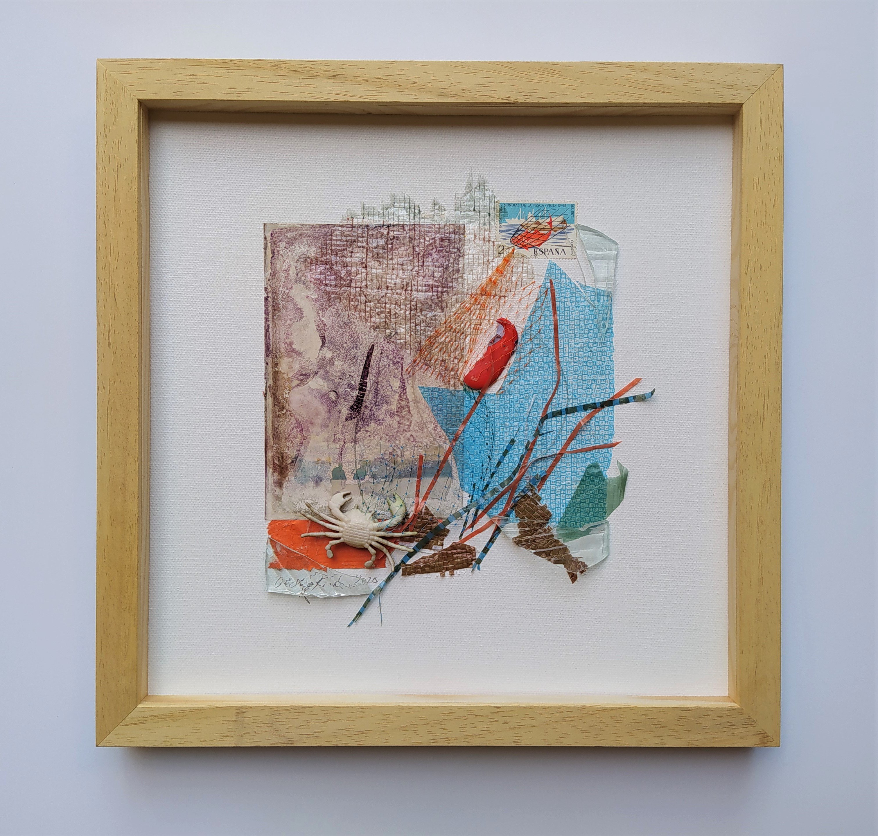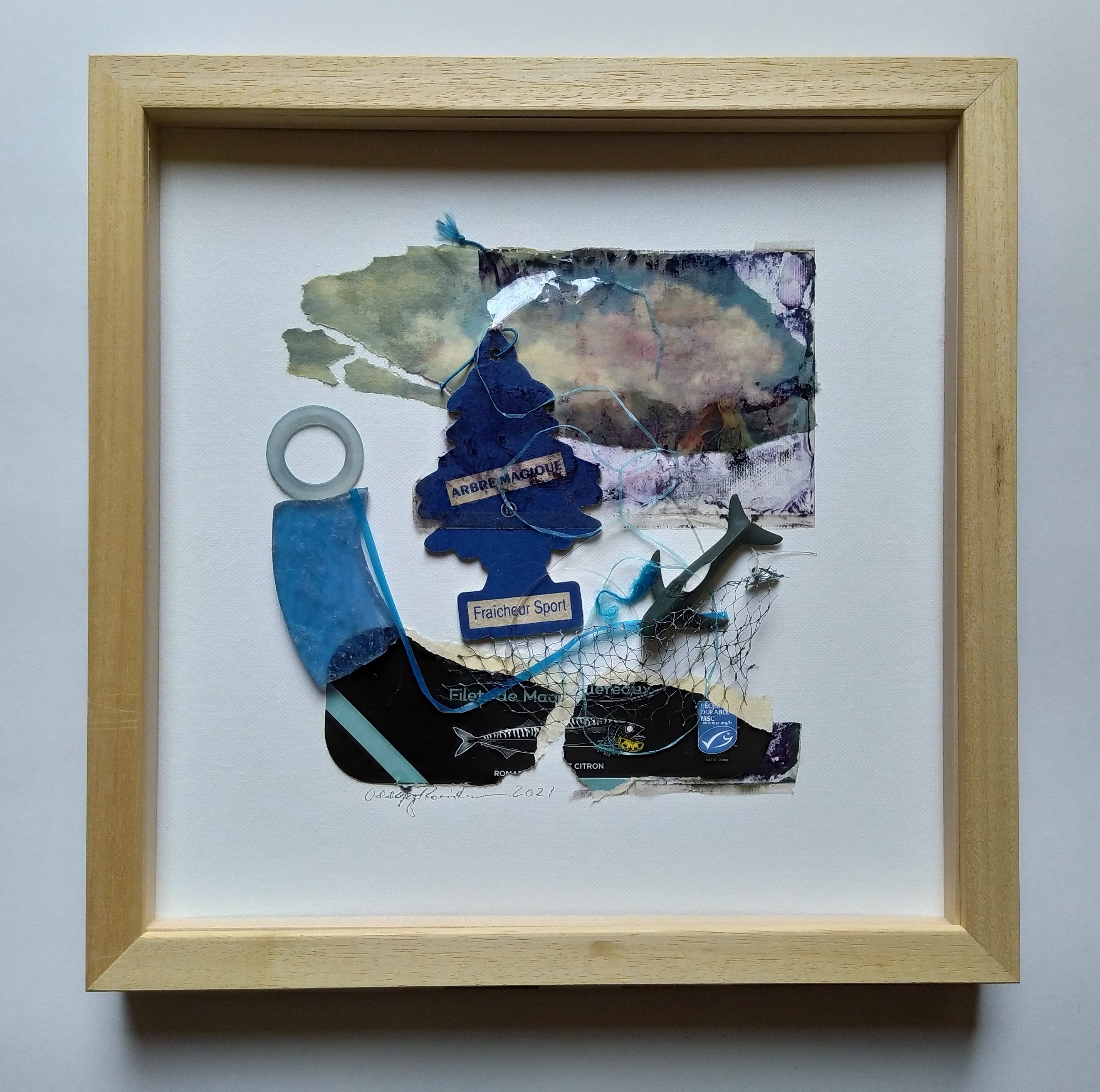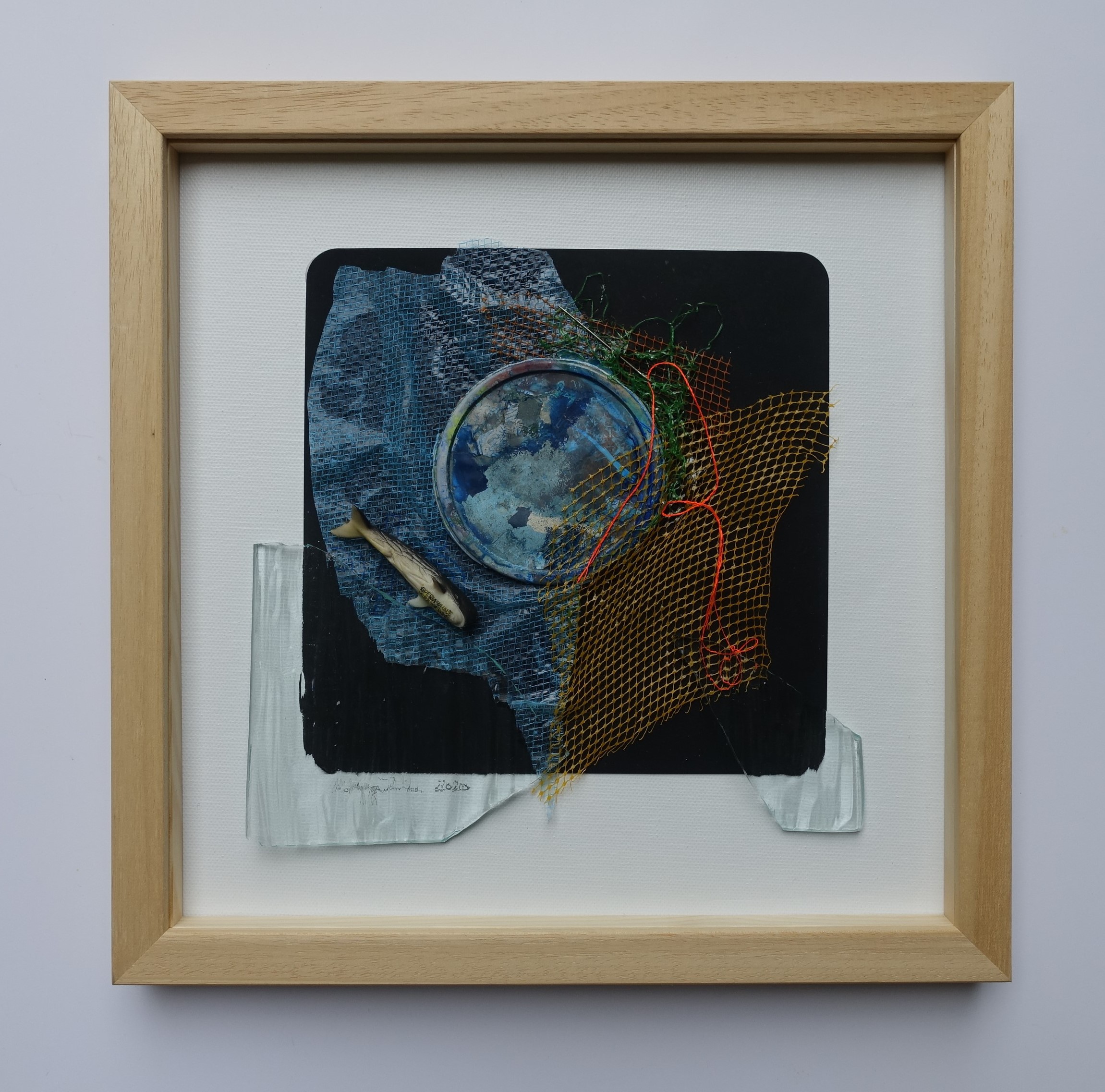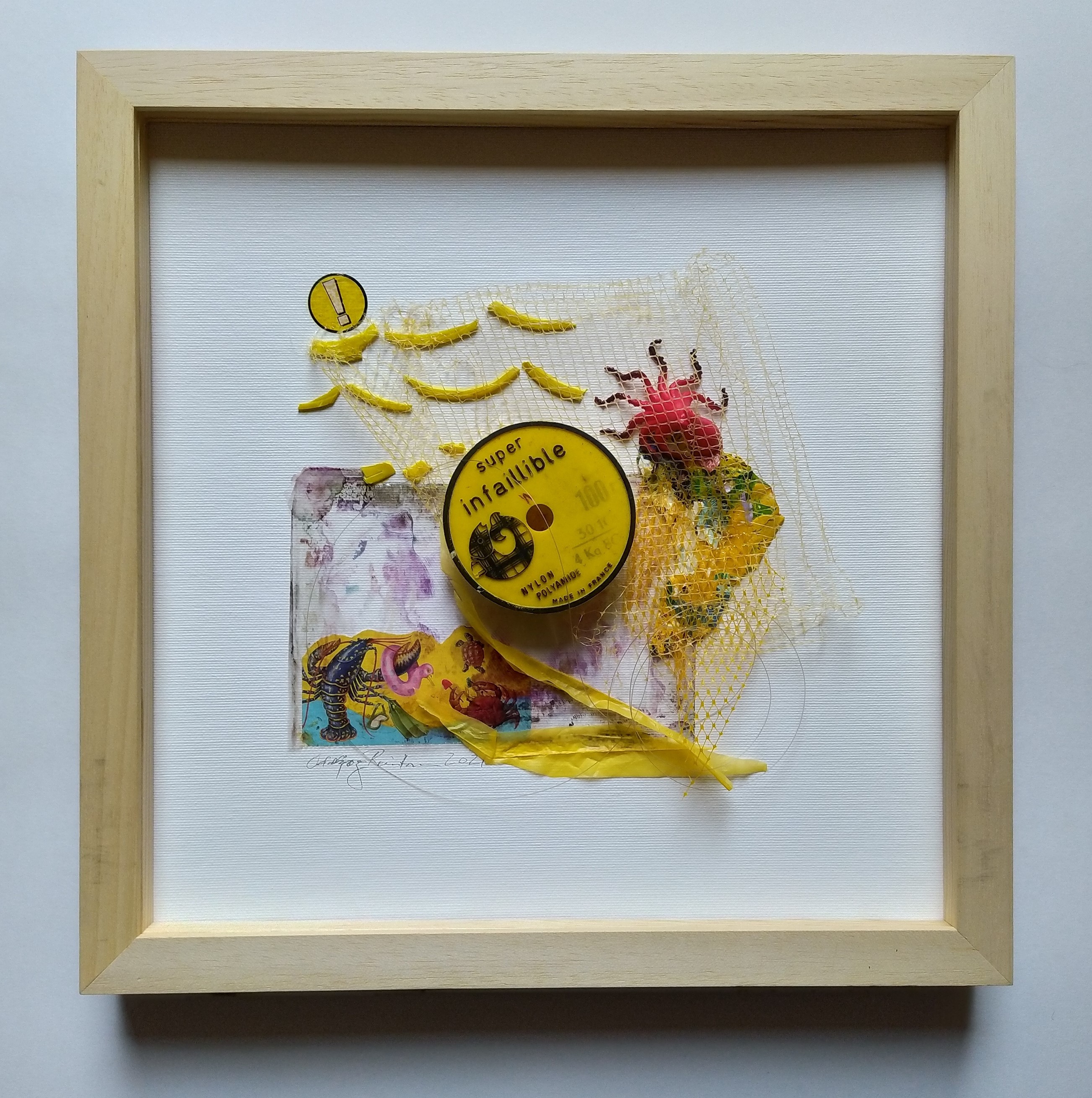In recent years, I have set myself an overarching goal of producing as little waste as possible through recycling and transforming the various materials that I have found or received: paint scraps, broken glass and window frames, metal or mosquito nettings, lids, fabric, as well as plastic bits collected from walks along the beaches in the area where I live. These are two series made according to the recycling principle.
