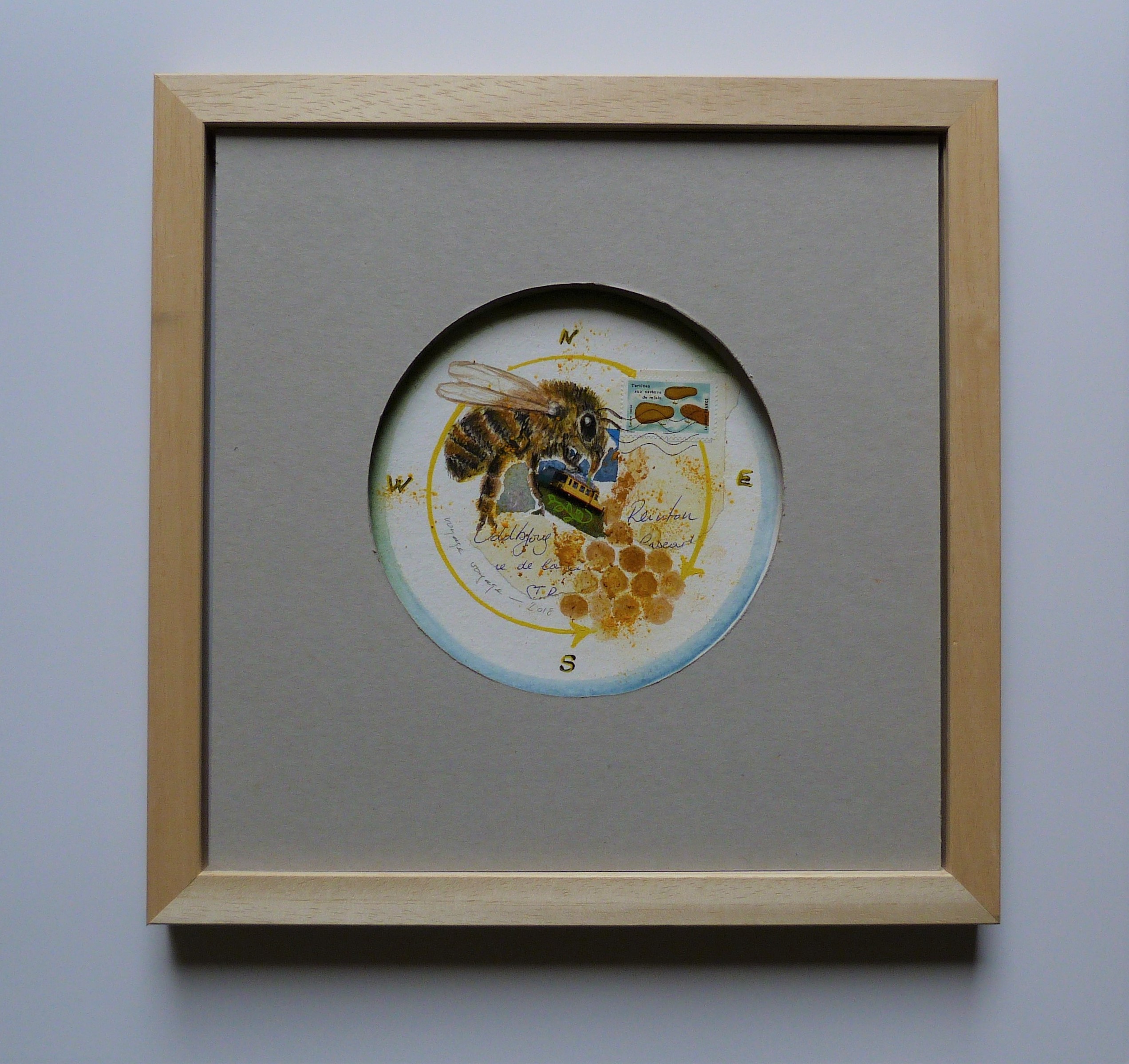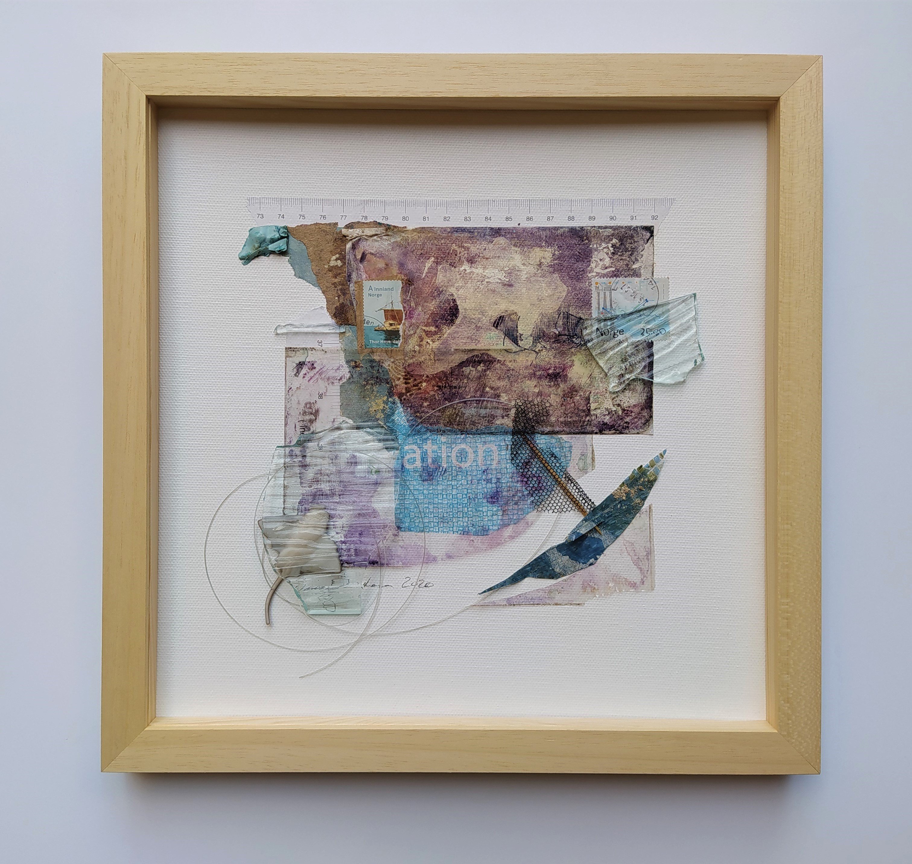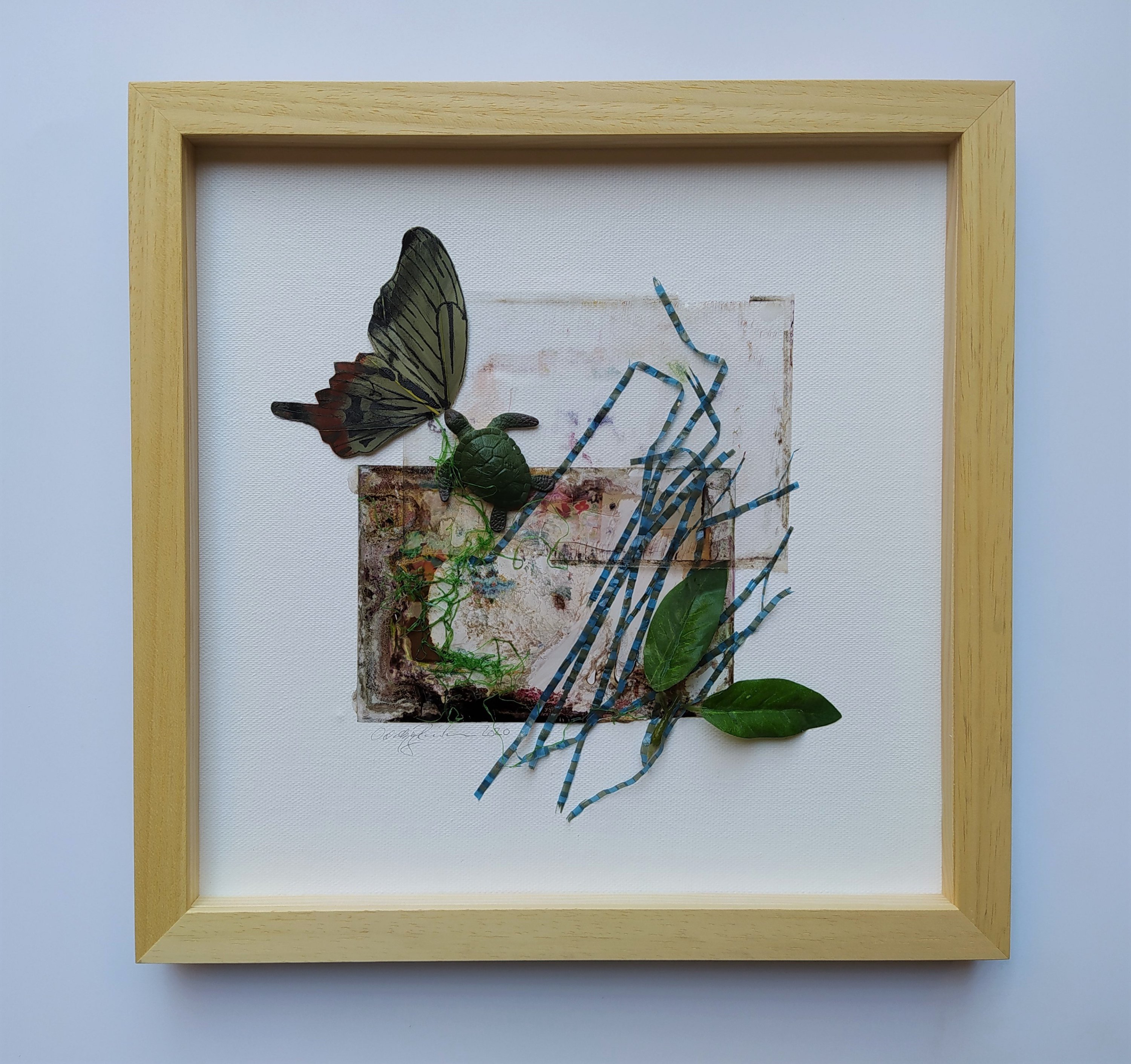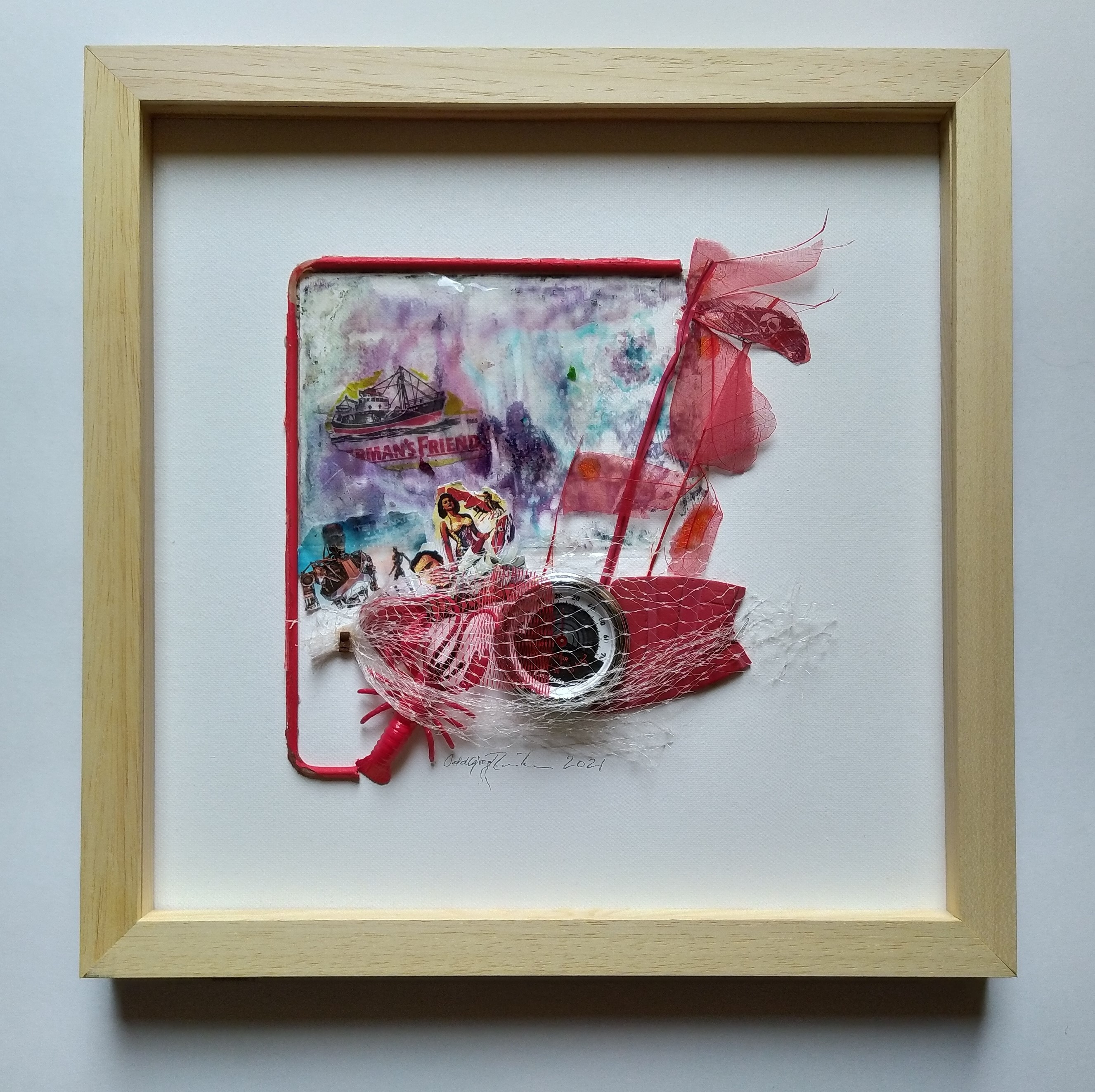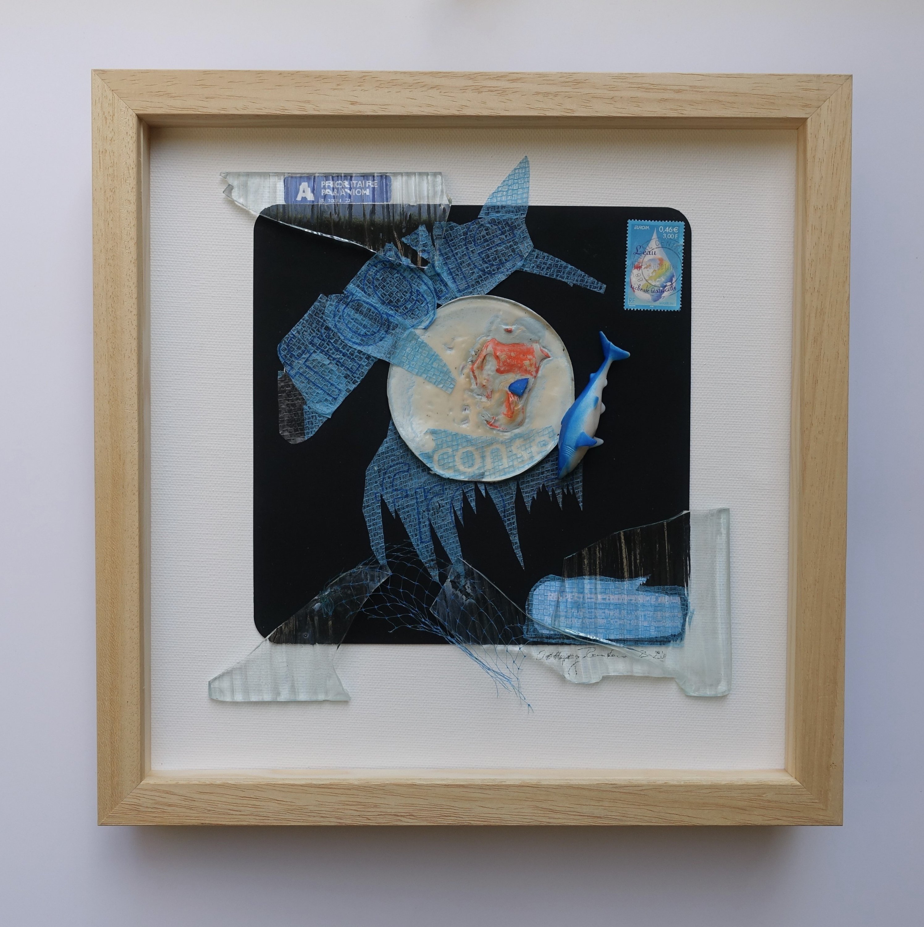 In recent years, I have set myself an overarching goal of producing as little waste as possible through recycling and transforming the various materials that I have found or received: paint scraps, broken glass and window frames, metal or mosquito nettings, lids, fabric, as well as plastic bits collected from walks along the beaches in the area where I live. These are two series made according to the recycling principle.