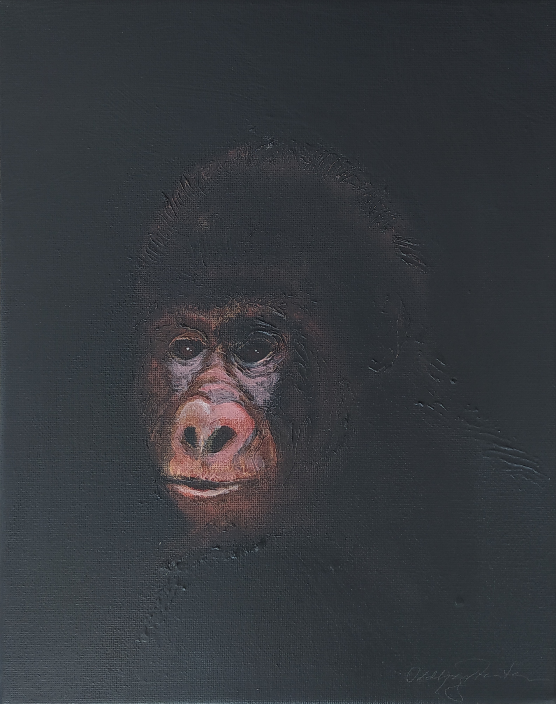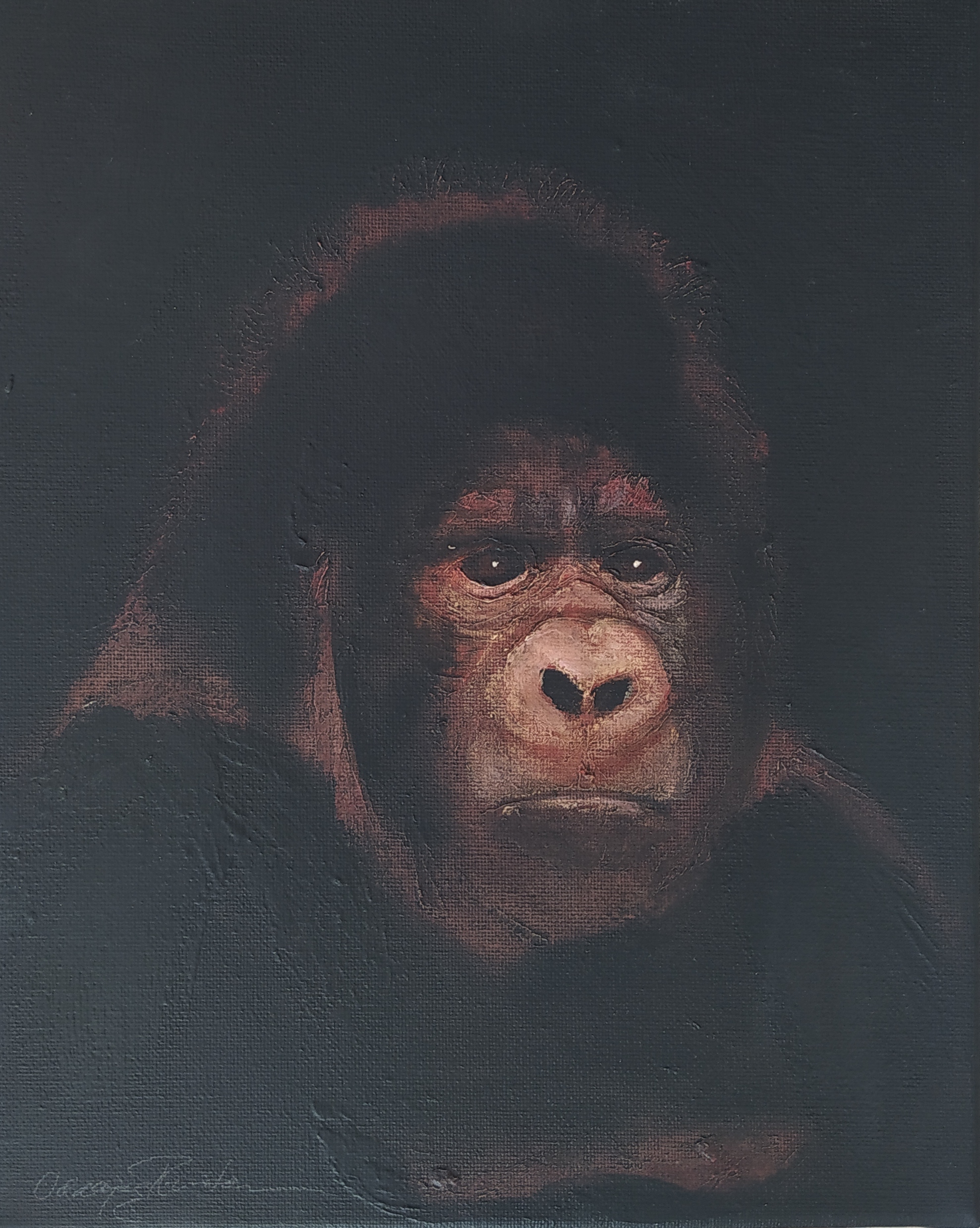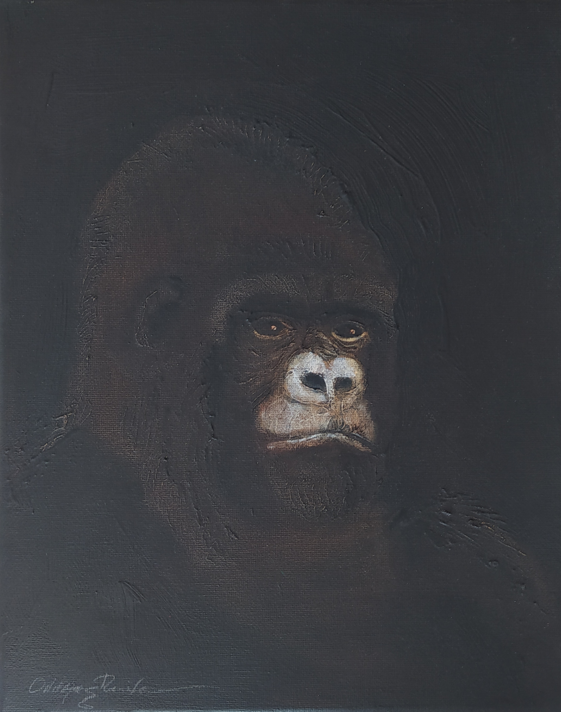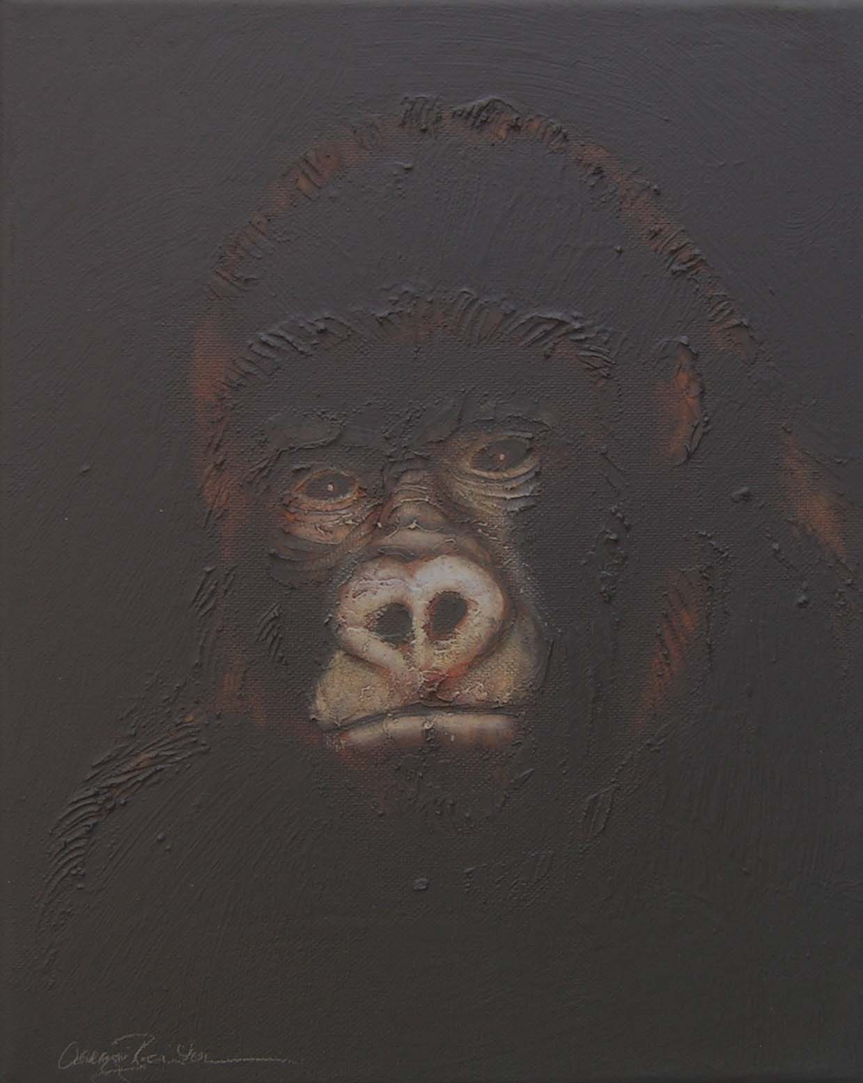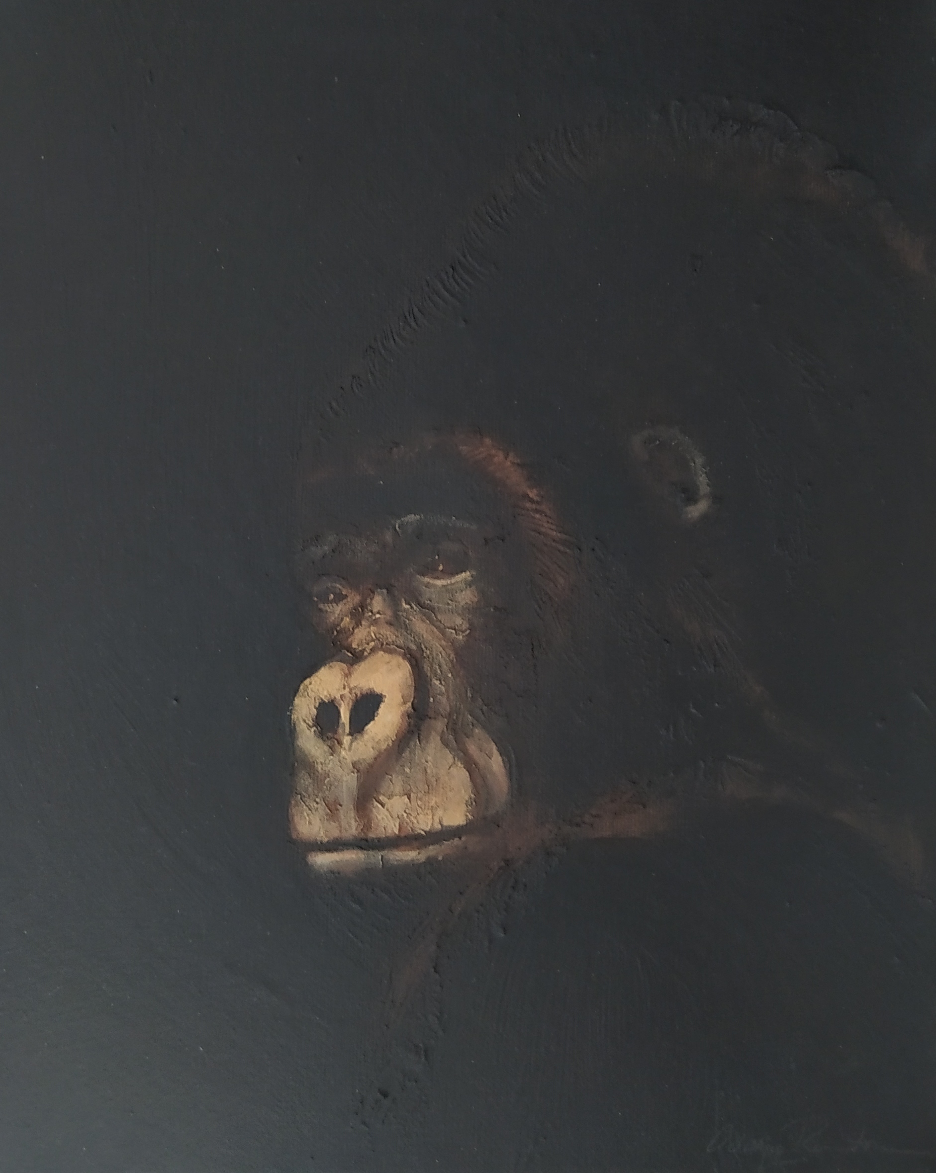 (...) Each painting pertains to a tradition of the portrait that painting notably passed on to photography at the turn of the 18th century – the composition, the pause, the light, focused on a part of the face, the gentle or intense look give the visitor the impression that every gorilla emerges from an endless dream or from a mysterious stasis magnified by the sublime black backgrounds which defines them all. O. Reinton thus honors each face like a notable member of a family who would care about telling their generational history thanks to the so-called “family portraits”. But, paradoxically, each portrait is also a print, the painting facsimile of a more ordinary kind of images – the photo ID, the one that you can get at a photo-robot for instance. Emotion then bursts out from this discrepancy between the two categories of images (...)