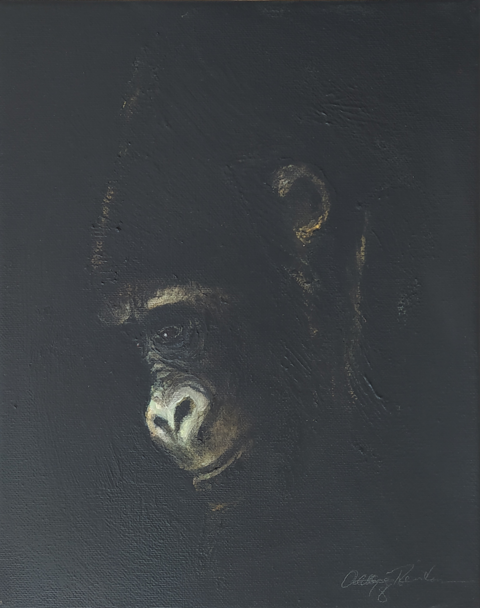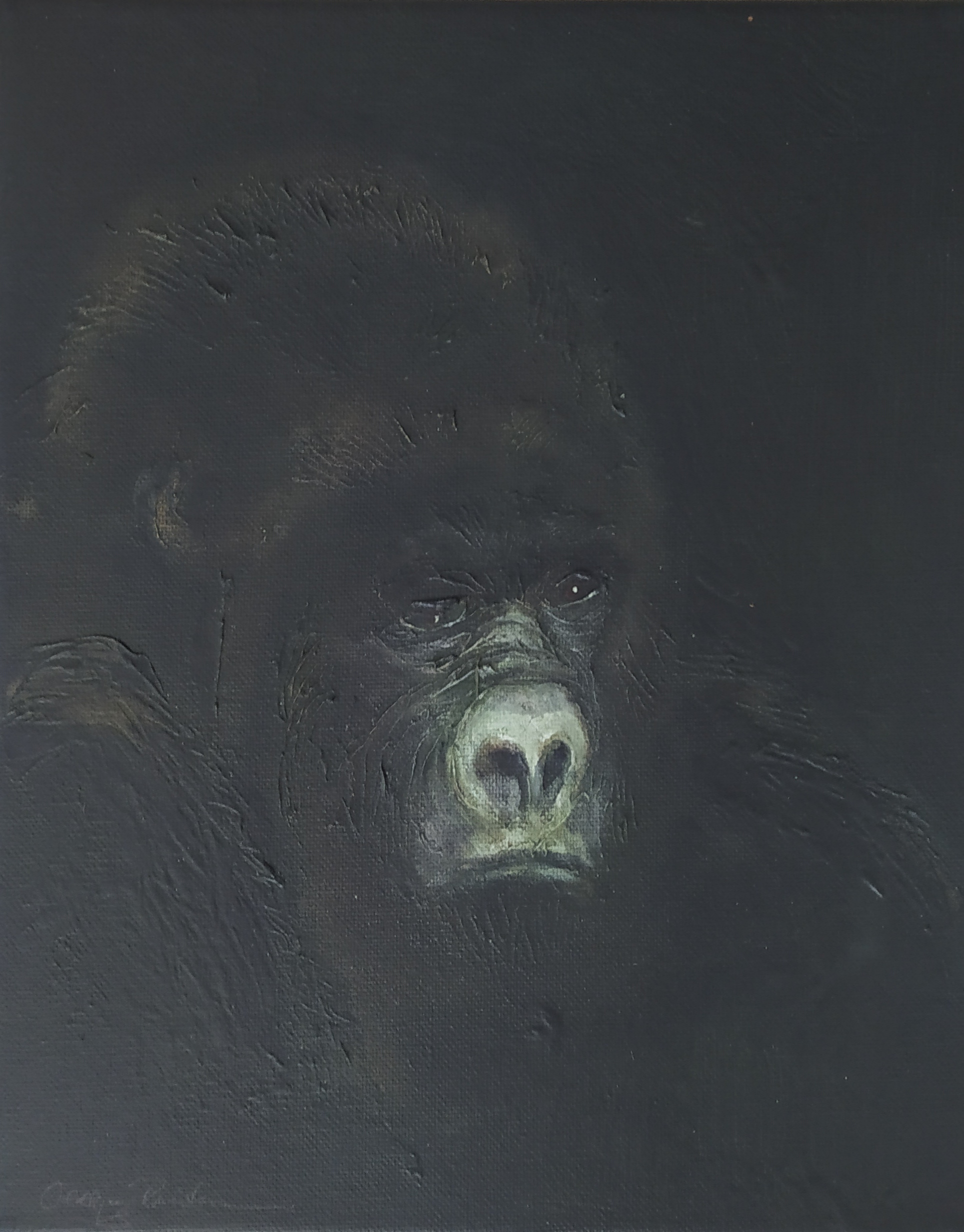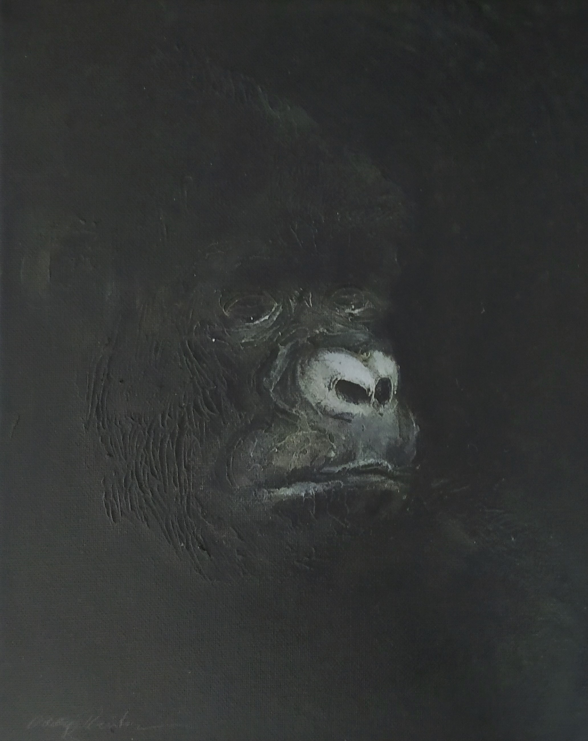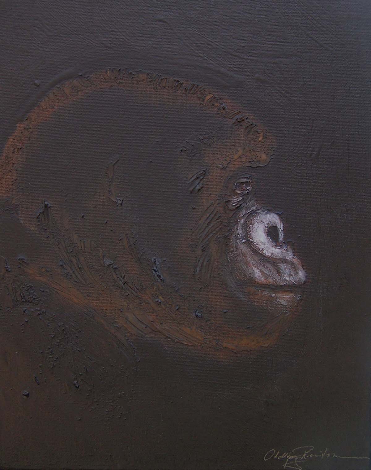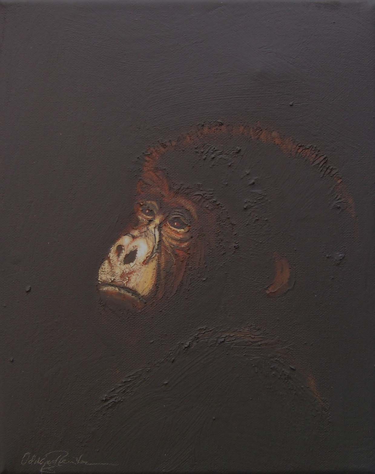 (...) Each painting pertains to a tradition of the portrait that painting notably passed on to photography at the turn of the 18th century – the composition, the pause, the light, focused on a part of the face, the gentle or intense look give the visitor the impression that every gorilla emerges from an endless dream or from a mysterious stasis magnified by the sublime black backgrounds which defines them all. O. Reinton thus honors each face like a notable member of a family who would care about telling their generational history thanks to the so-called “family portraits”. But, paradoxically, each portrait is also a print, the painting facsimile of a more ordinary kind of images – the photo ID, the one that you can get at a photo-robot for instance. Emotion then bursts out from this discrepancy between the two categories of images (...)