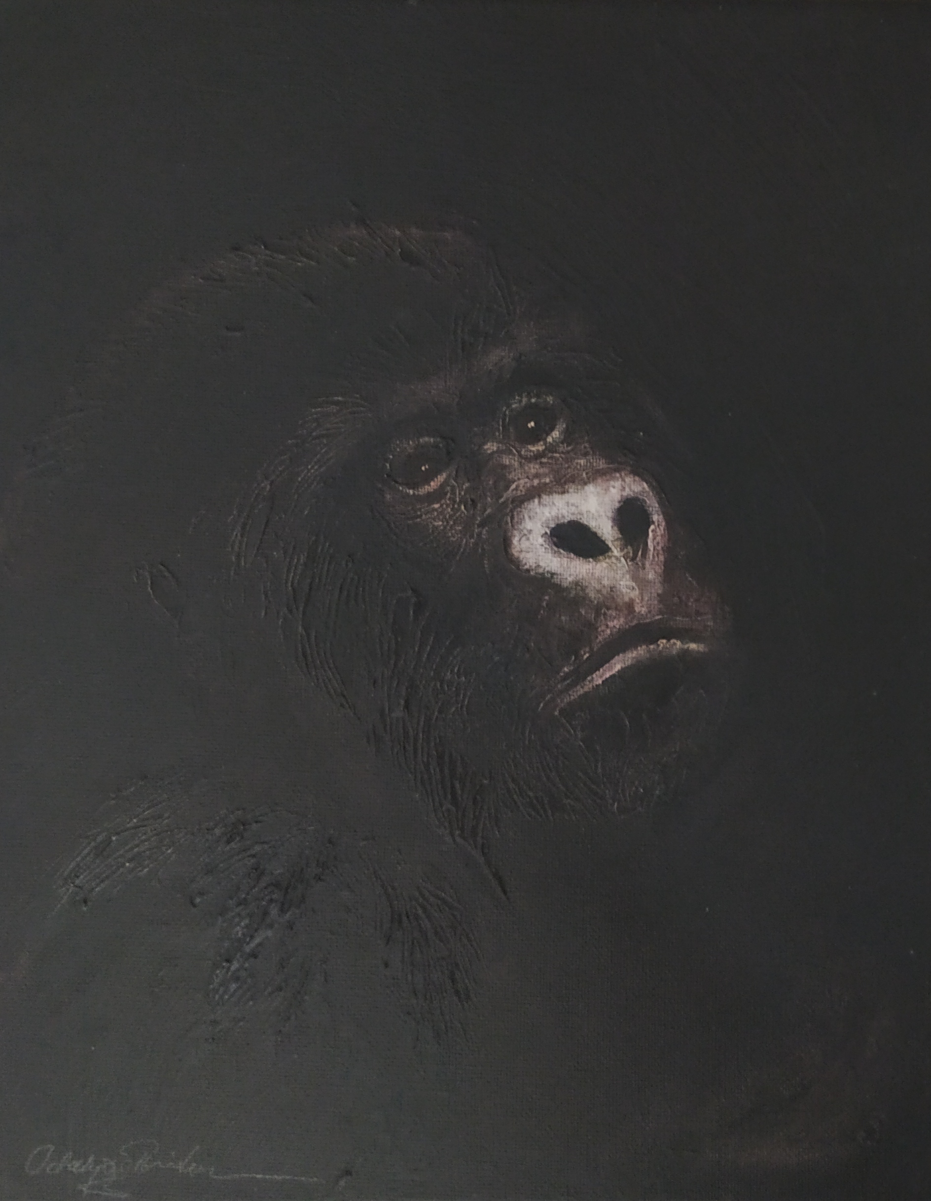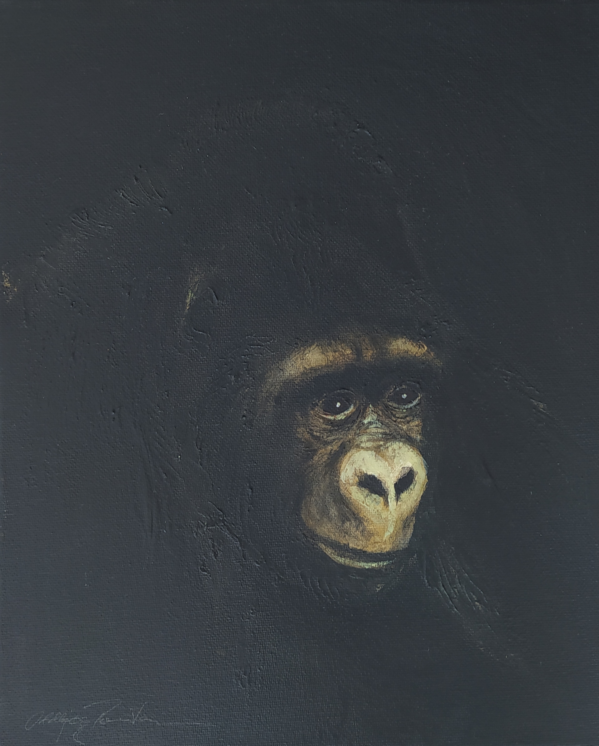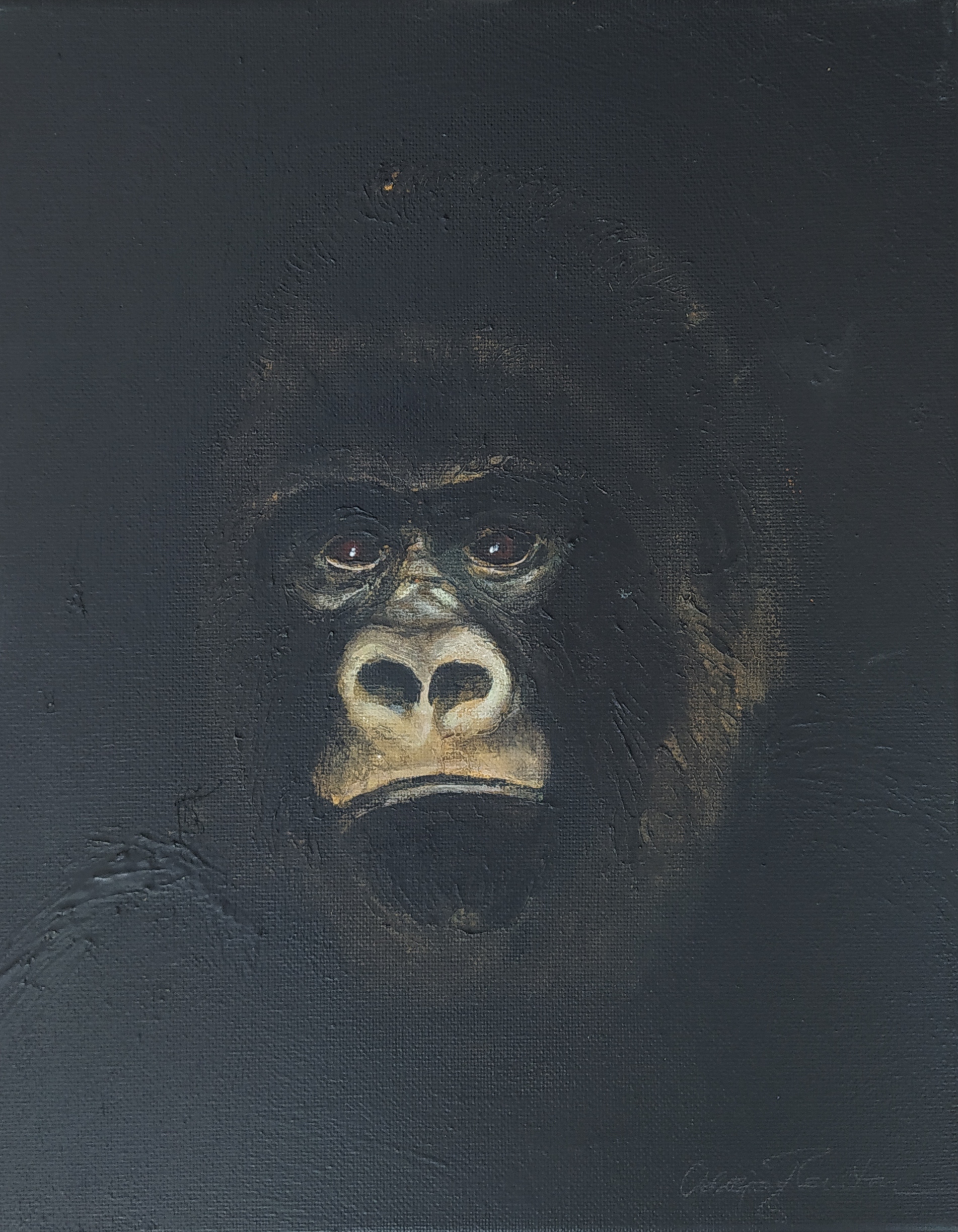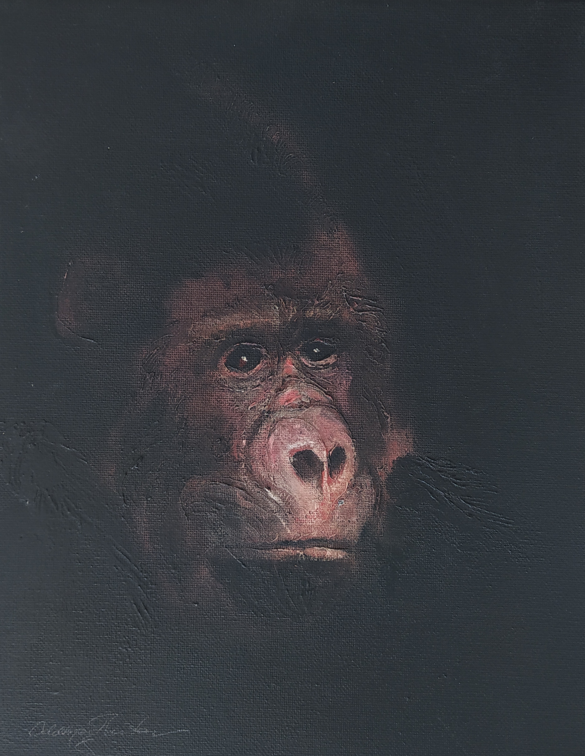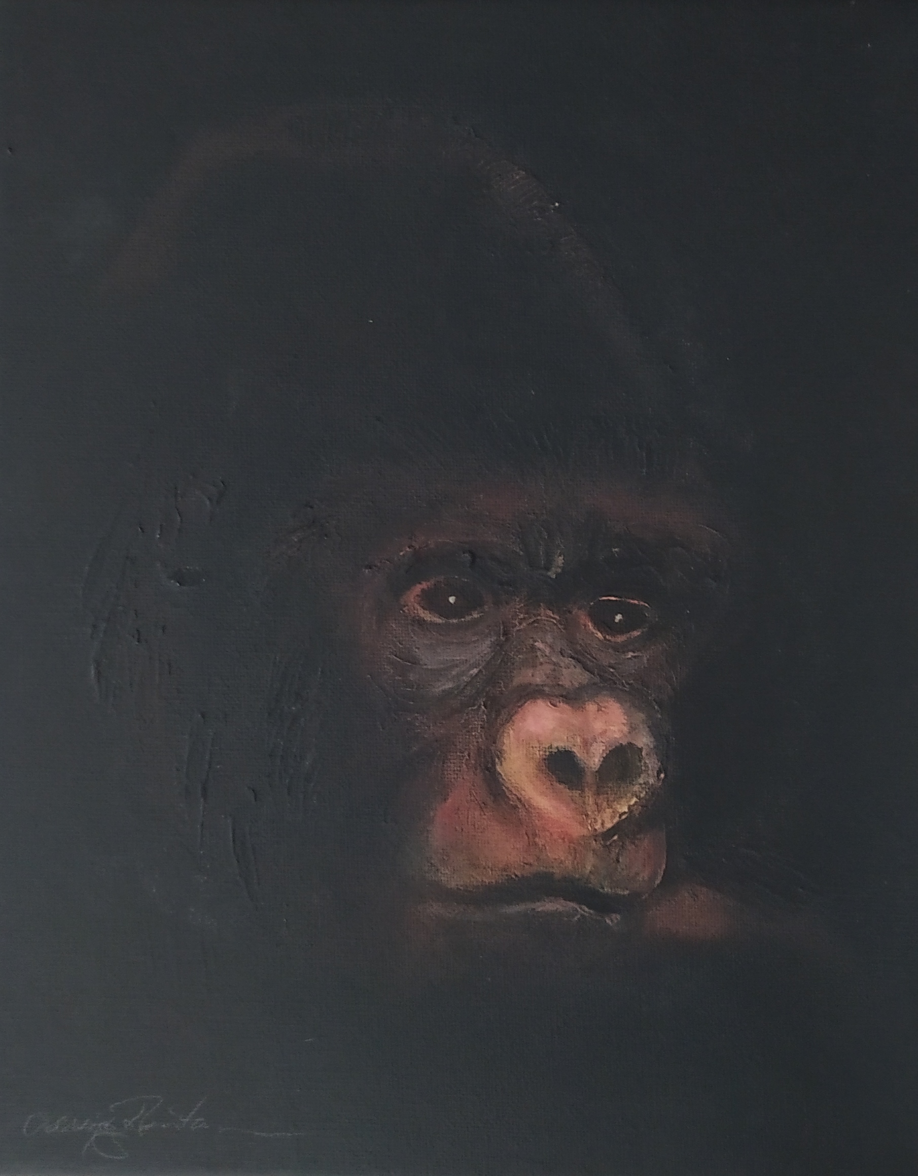 (...) Each painting pertains to a tradition of the portrait that painting notably passed on to photography at the turn of the 18th century – the composition, the pause, the light, focused on a part of the face, the gentle or intense look give the visitor the impression that every gorilla emerges from an endless dream or from a mysterious stasis magnified by the sublime black backgrounds which defines them all. O. Reinton thus honors each face like a notable member of a family who would care about telling their generational history thanks to the so-called “family portraits”. But, paradoxically, each portrait is also a print, the painting facsimile of a more ordinary kind of images – the photo ID, the one that you can get at a photo-robot for instance. Emotion then bursts out from this discrepancy between the two categories of images (...)
