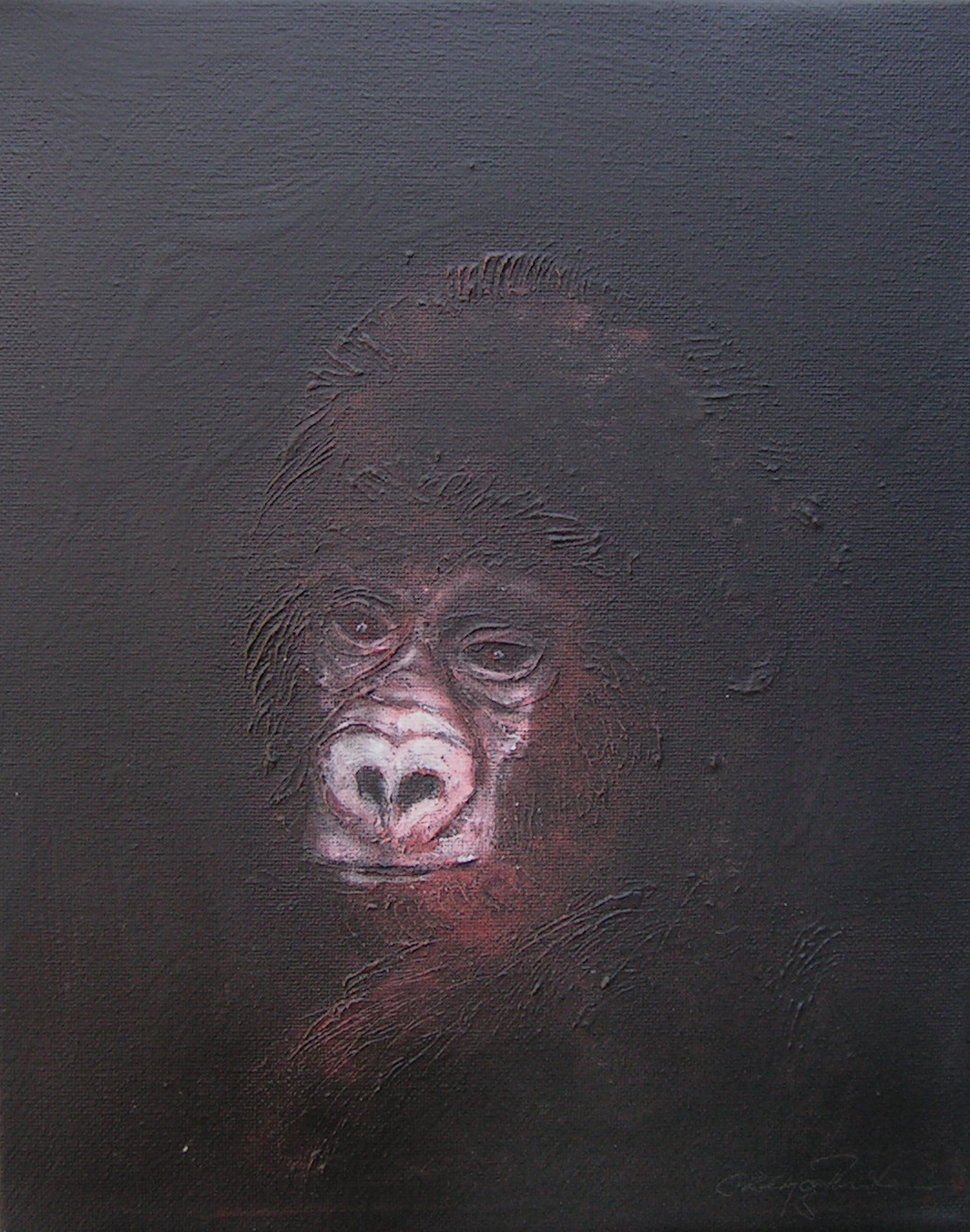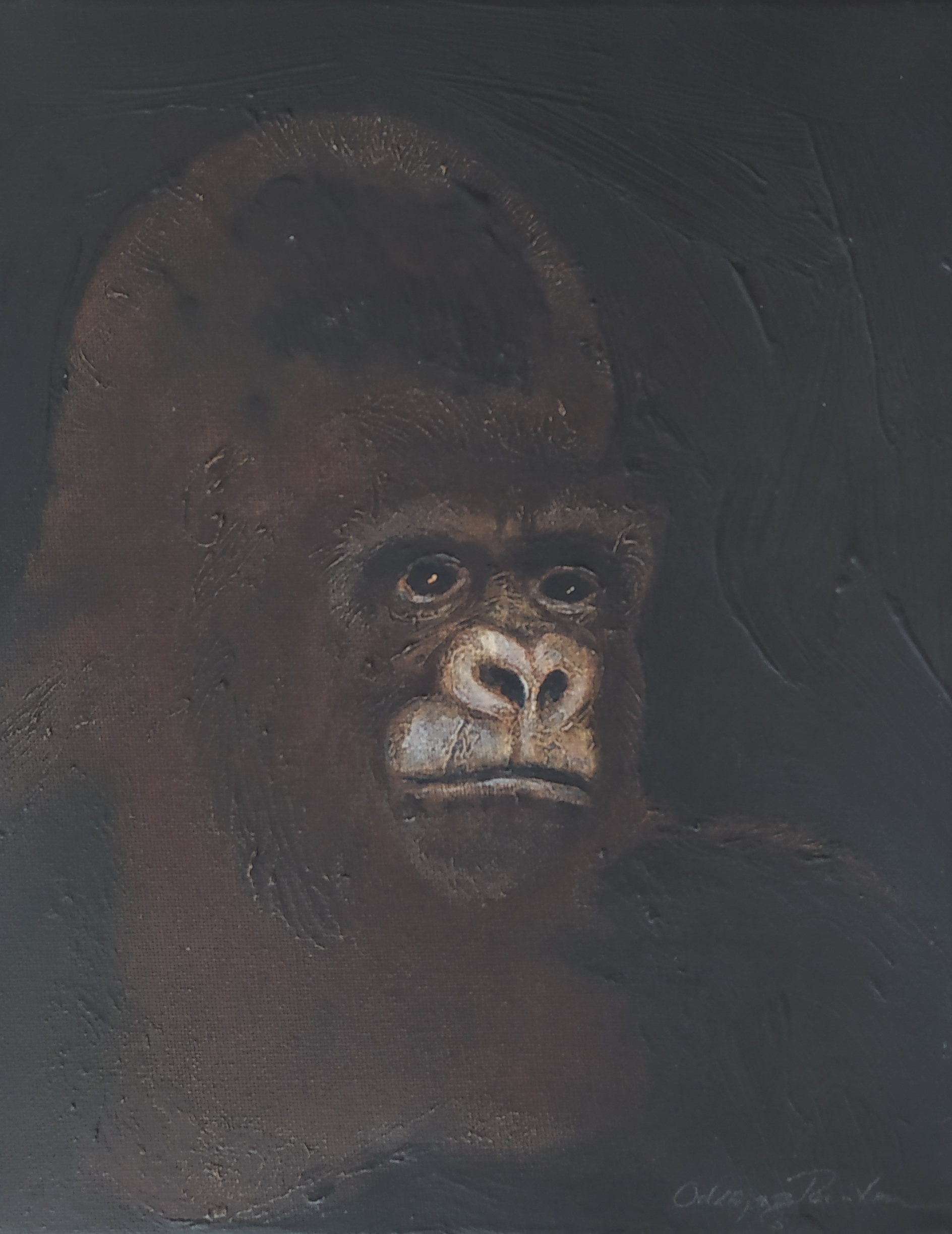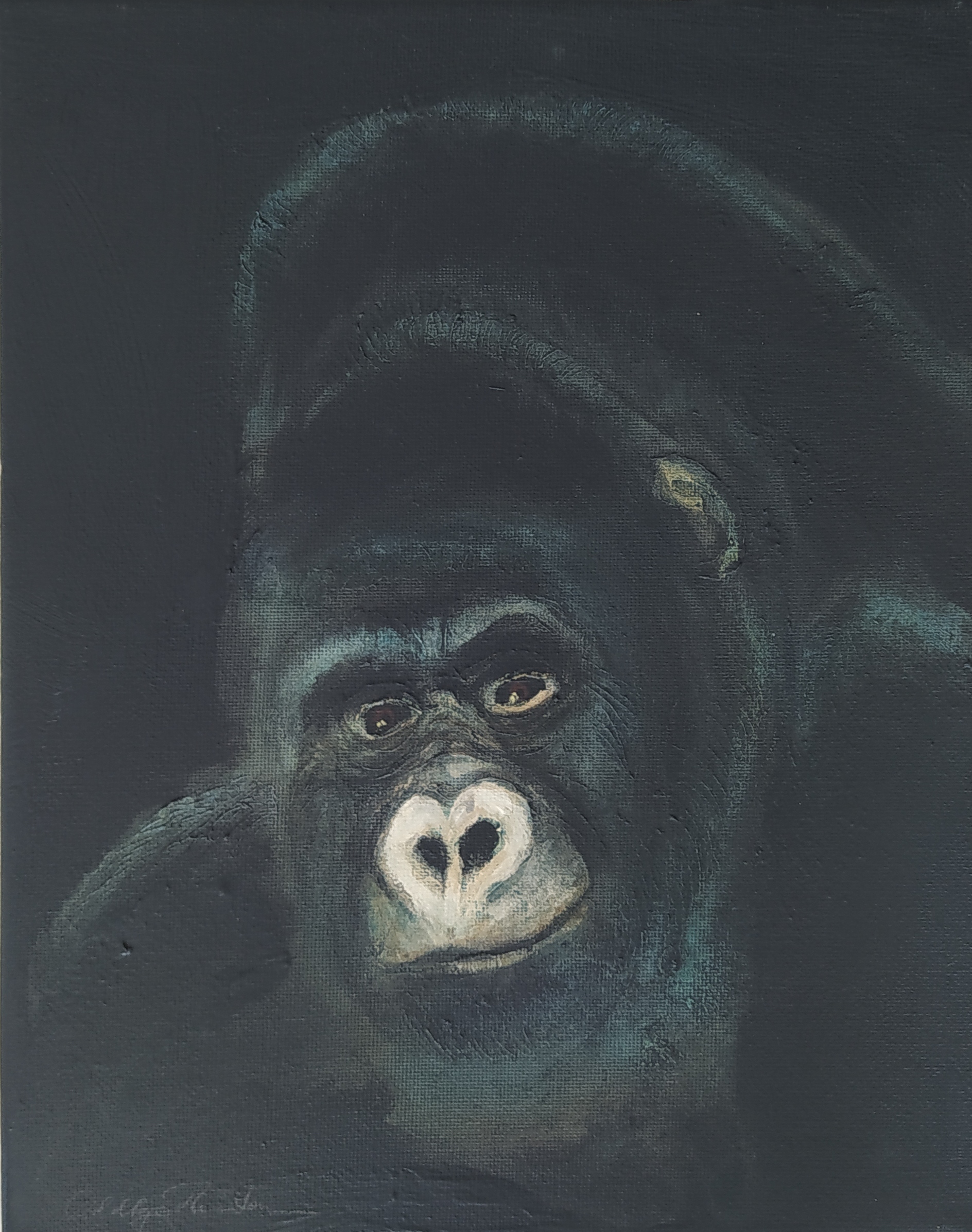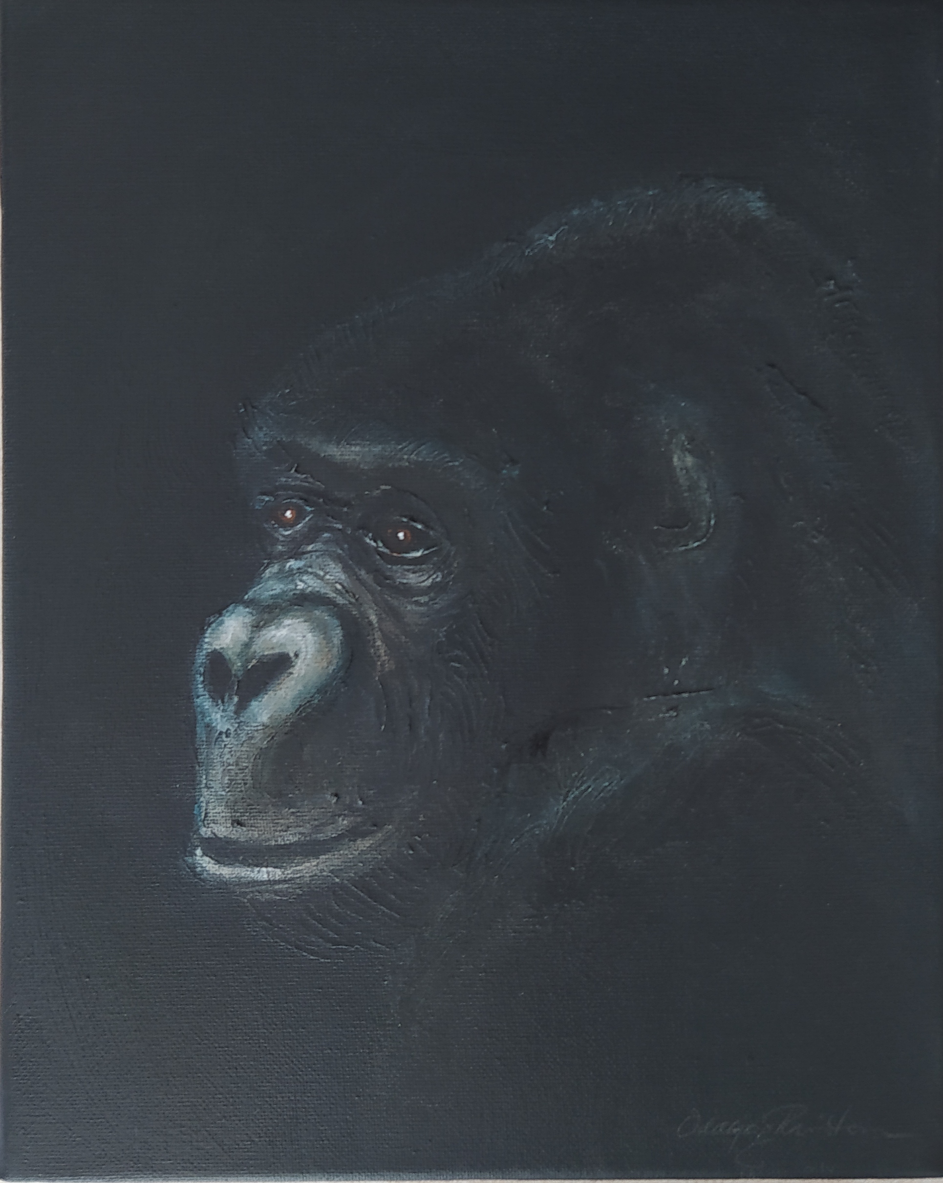 (...) Each painting pertains to a tradition of the portrait that painting notably passed on to photography at the turn of the 18th century – the composition, the pause, the light, focused on a part of the face, the gentle or intense look give the visitor the impression that every gorilla emerges from an endless dream or from a mysterious stasis magnified by the sublime black backgrounds which defines them all. O. Reinton thus honors each face like a notable member of a family who would care about telling their generational history thanks to the so-called “family portraits”. But, paradoxically, each portrait is also a print, the painting facsimile of a more ordinary kind of images – the photo ID, the one that you can get at a photo-robot for instance. Emotion then bursts out from this discrepancy between the two categories of images (...)