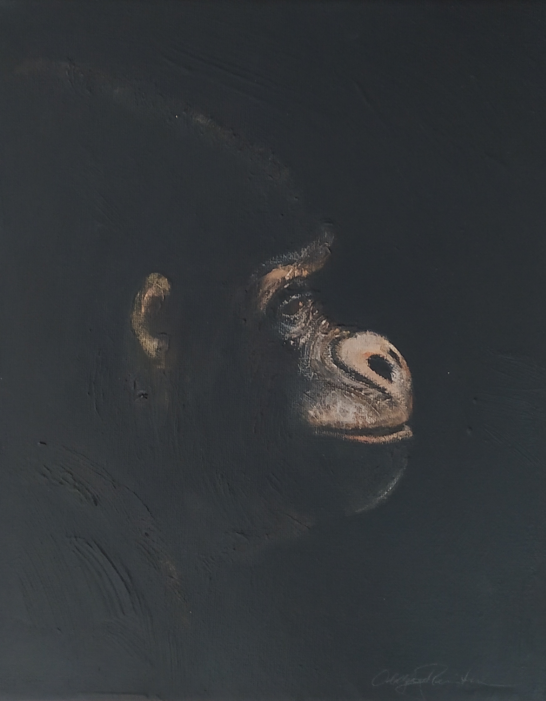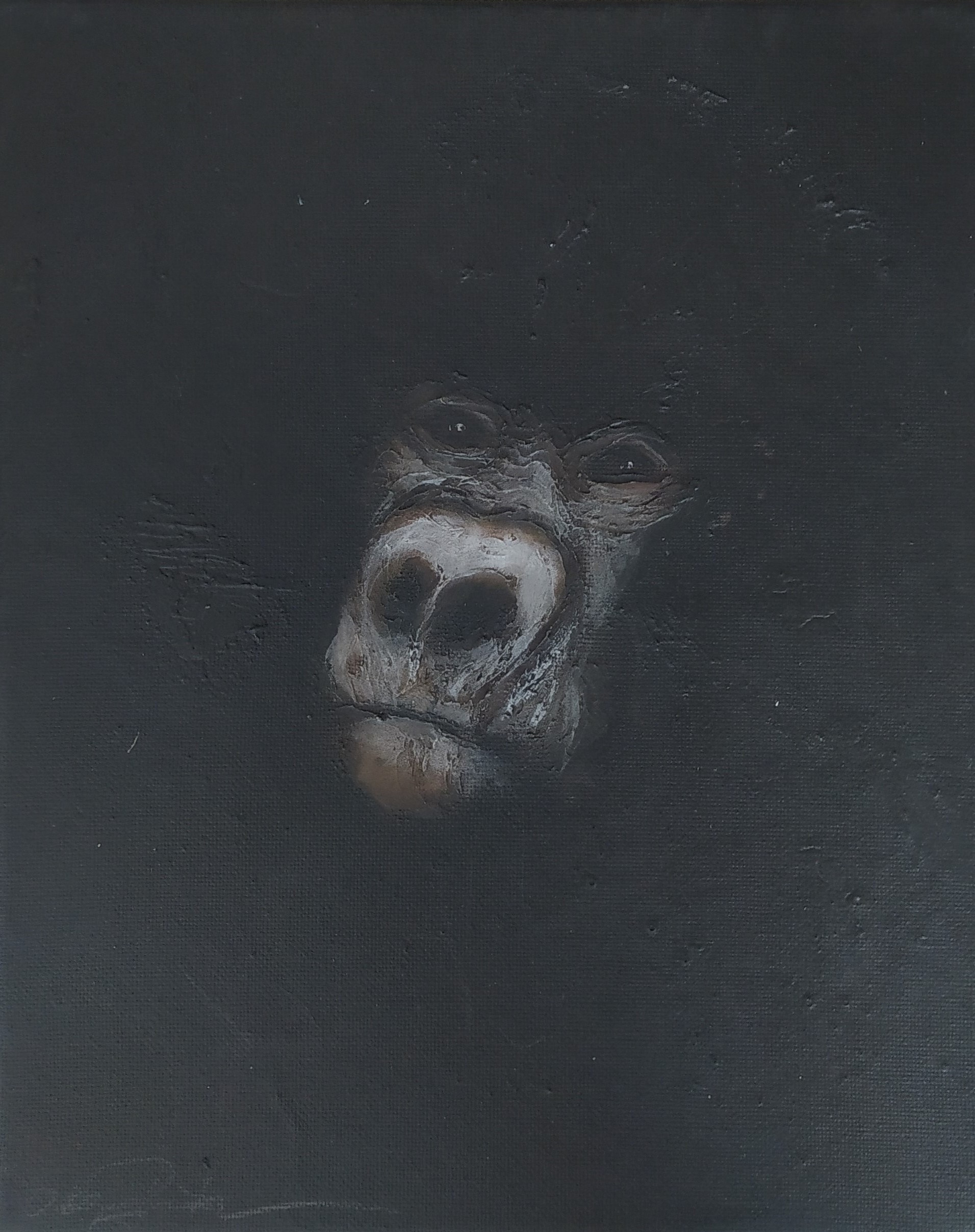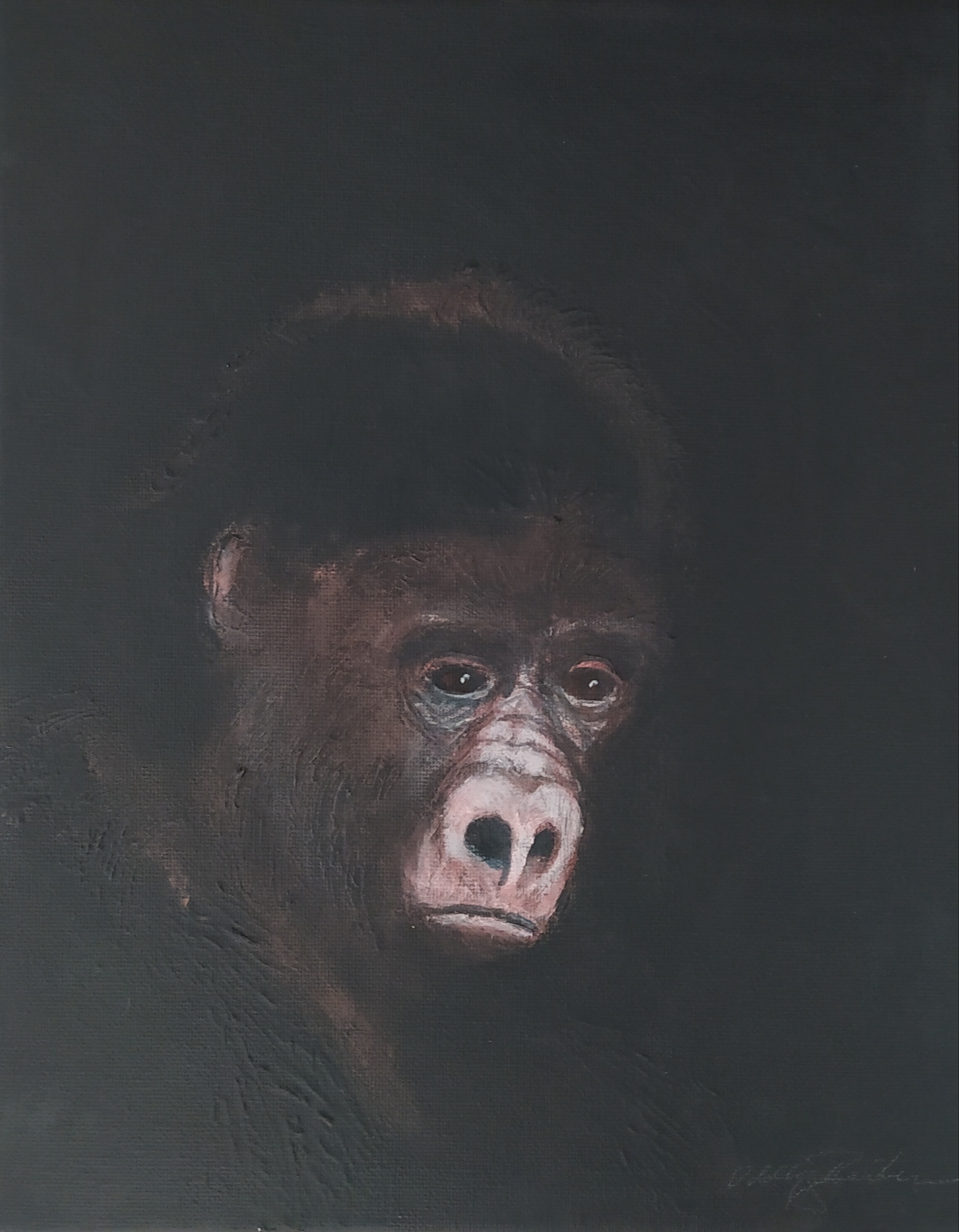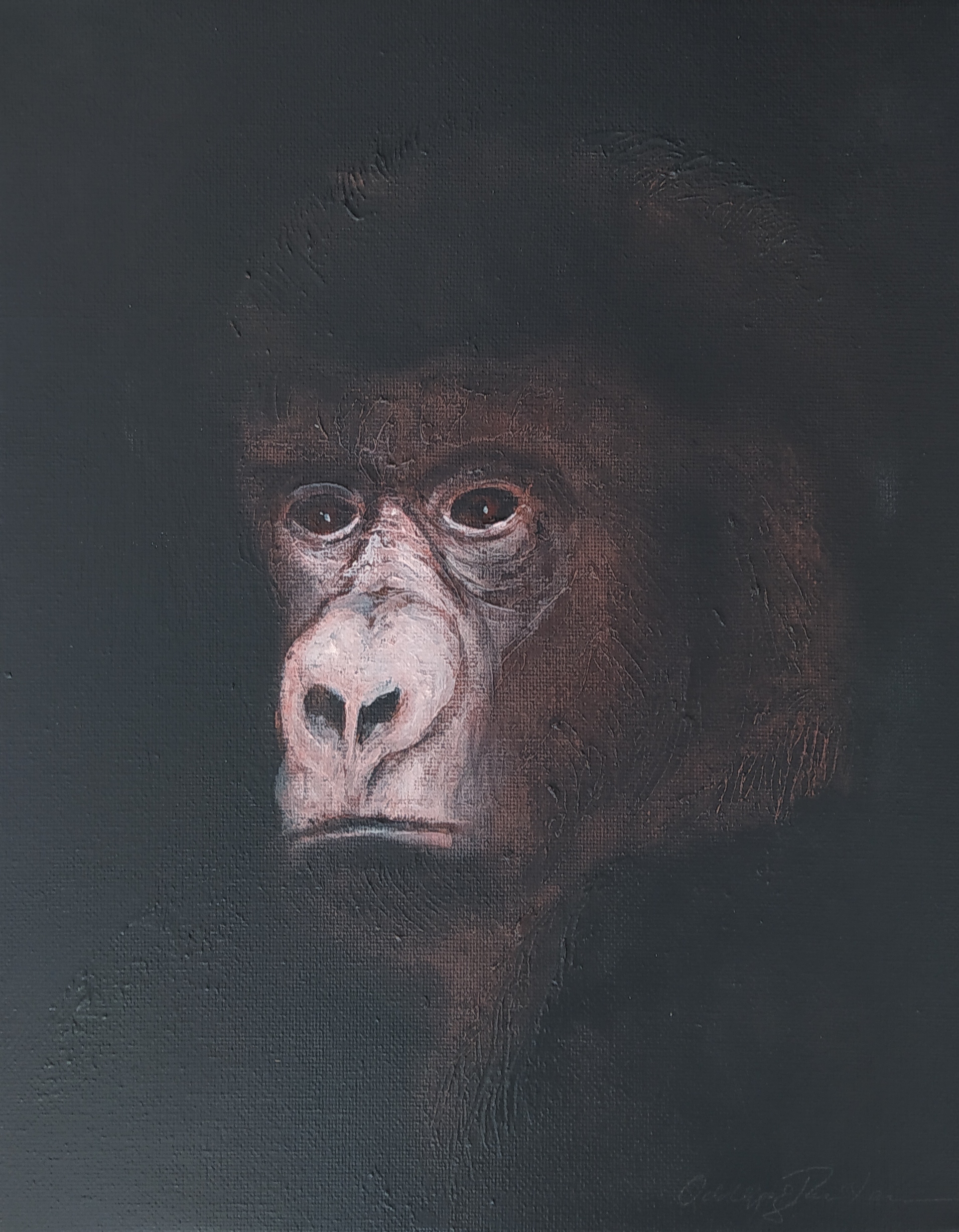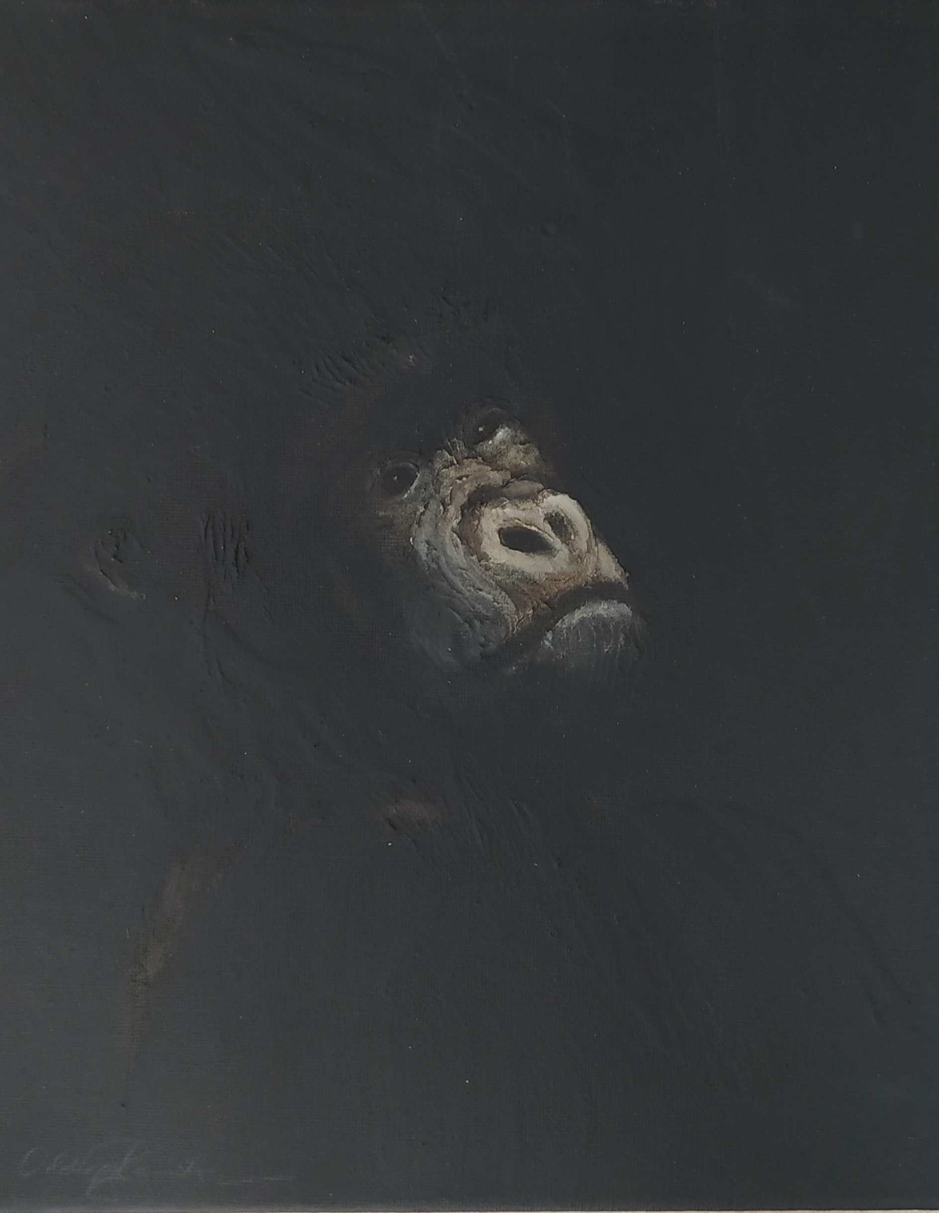 (...) Each painting pertains to a tradition of the portrait that painting notably passed on to photography at the turn of the 18th century – the composition, the pause, the light, focused on a part of the face, the gentle or intense look give the visitor the impression that every gorilla emerges from an endless dream or from a mysterious stasis magnified by the sublime black backgrounds which defines them all. O. Reinton thus honors each face like a notable member of a family who would care about telling their generational history thanks to the so-called “family portraits”. But, paradoxically, each portrait is also a print, the painting facsimile of a more ordinary kind of images – the photo ID, the one that you can get at a photo-robot for instance. Emotion then bursts out from this discrepancy between the two categories of images (...)