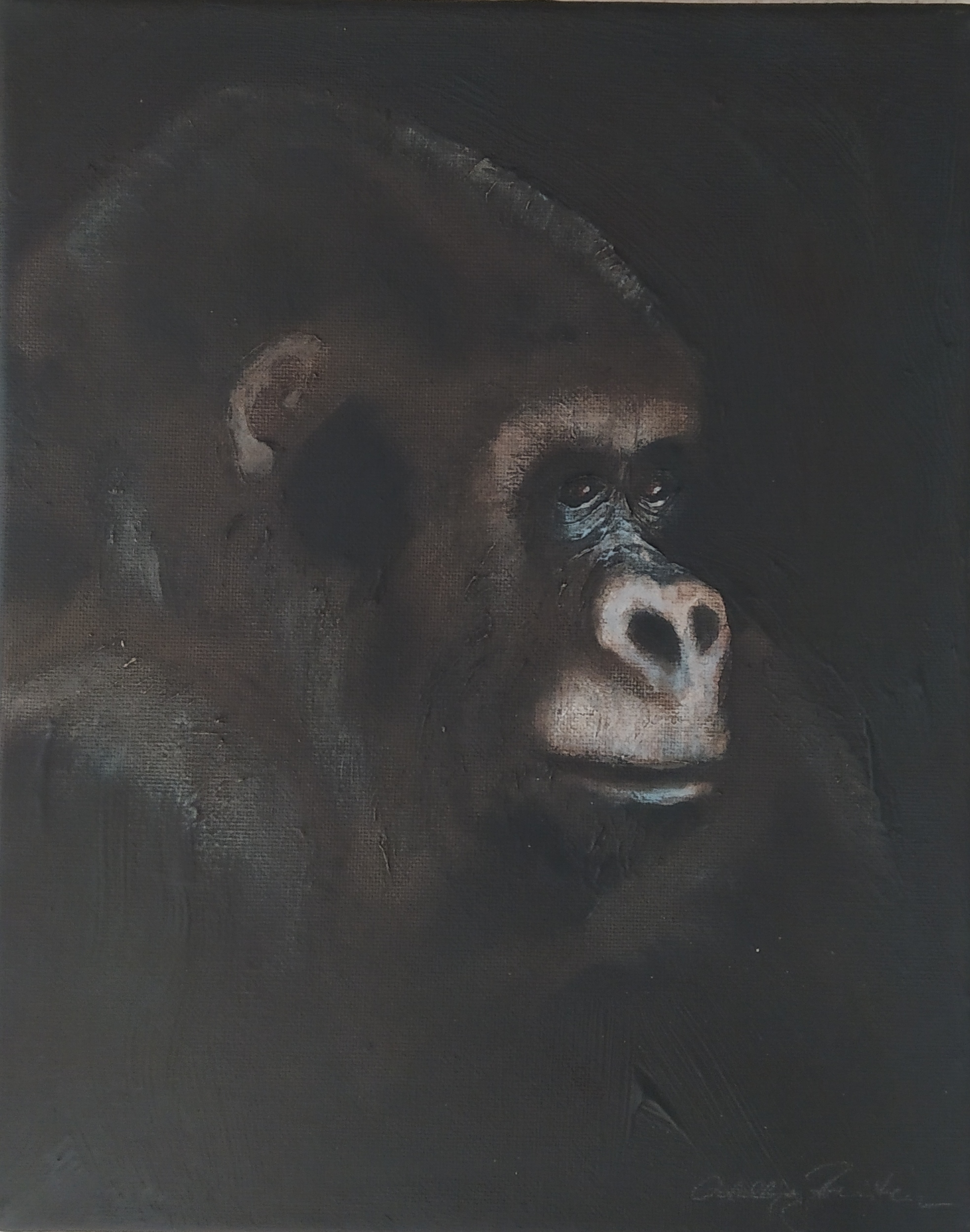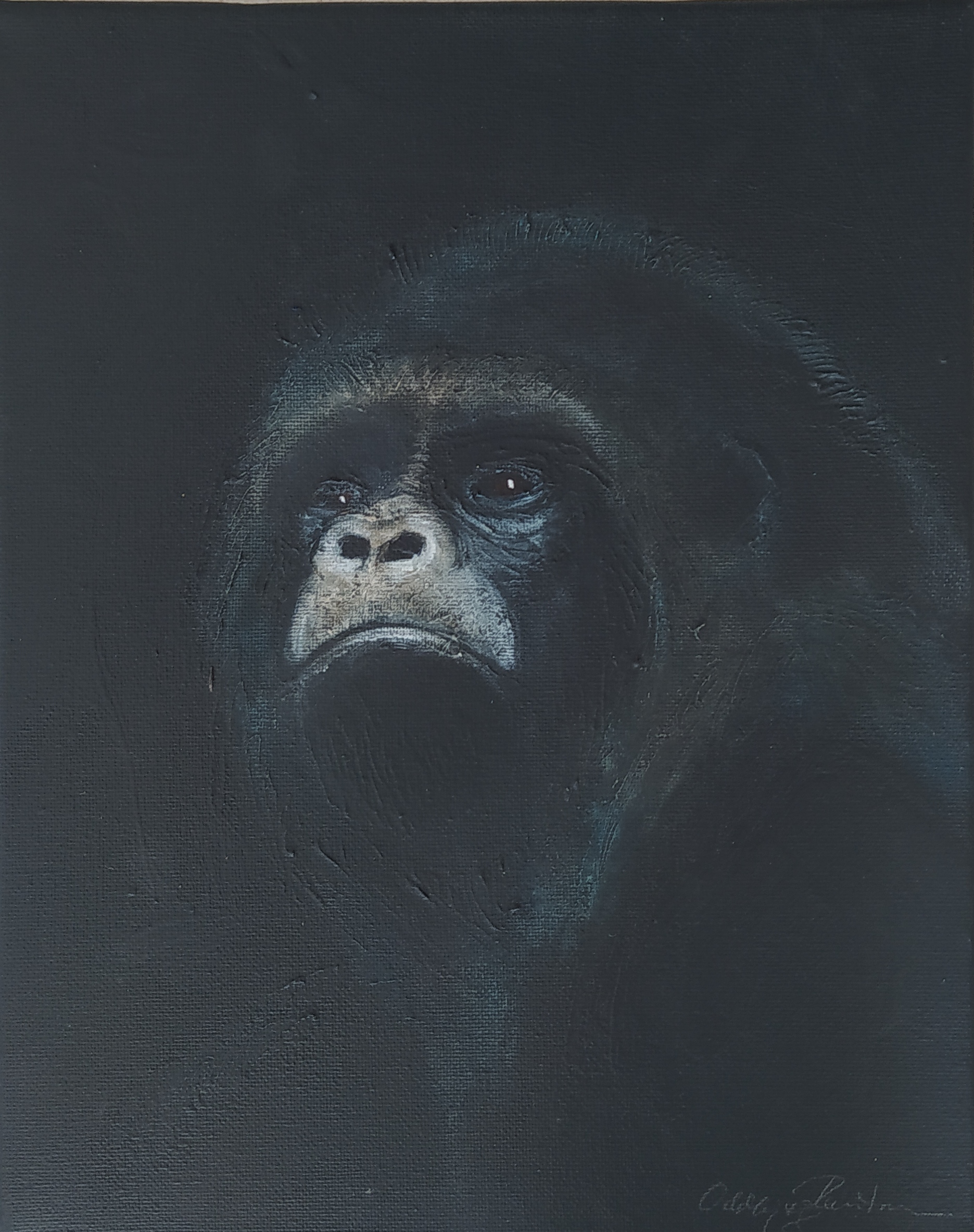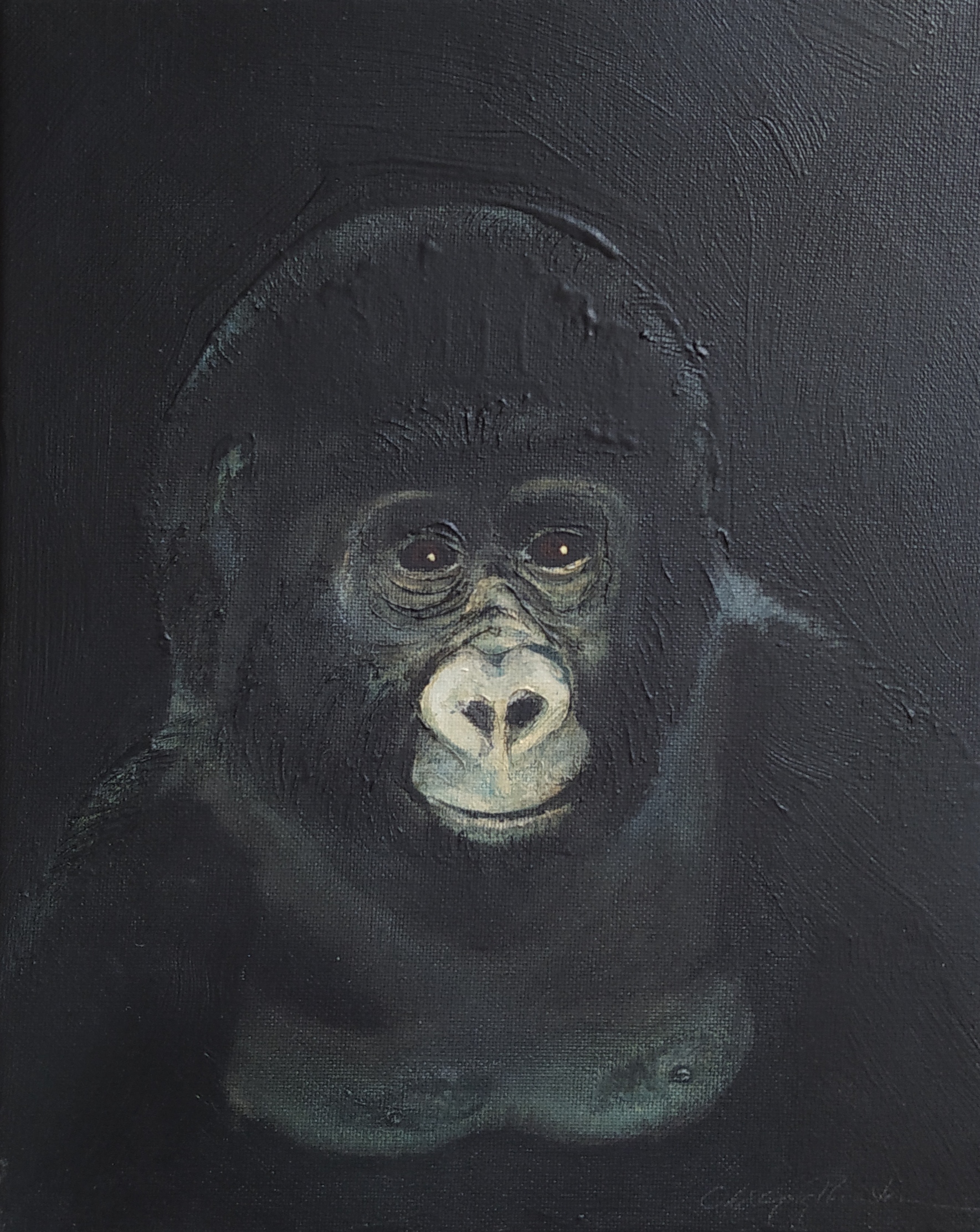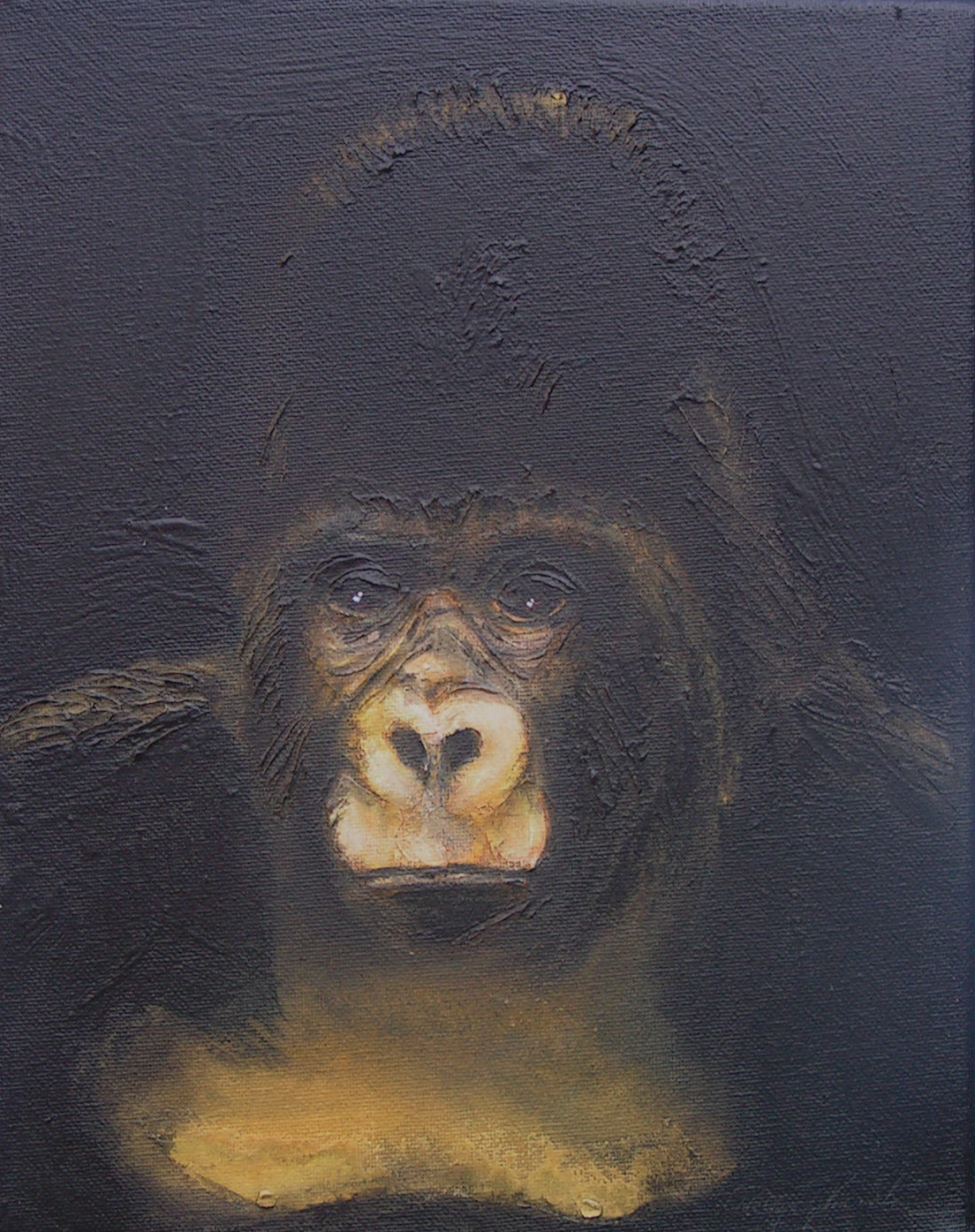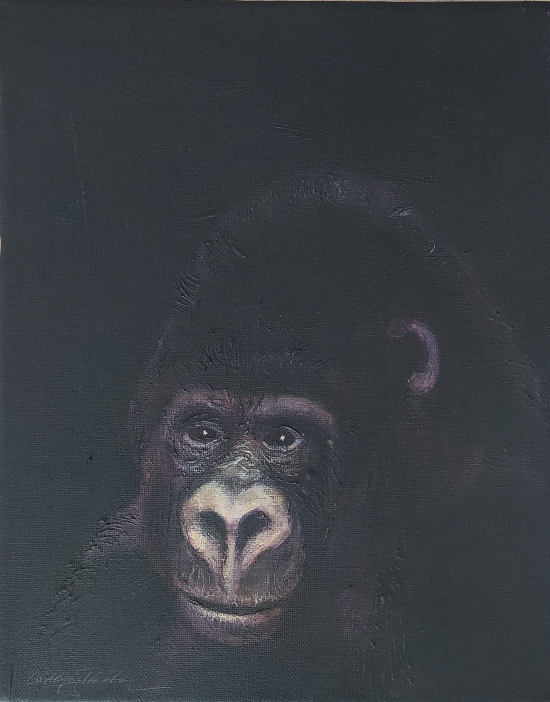 (...) Each painting pertains to a tradition of the portrait that painting notably passed on to photography at the turn of the 18th century – the composition, the pause, the light, focused on a part of the face, the gentle or intense look give the visitor the impression that every gorilla emerges from an endless dream or from a mysterious stasis magnified by the sublime black backgrounds which defines them all. O. Reinton thus honors each face like a notable member of a family who would care about telling their generational history thanks to the so-called “family portraits”. But, paradoxically, each portrait is also a print, the painting facsimile of a more ordinary kind of images – the photo ID, the one that you can get at a photo-robot for instance. Emotion then bursts out from this discrepancy between the two categories of images (...)