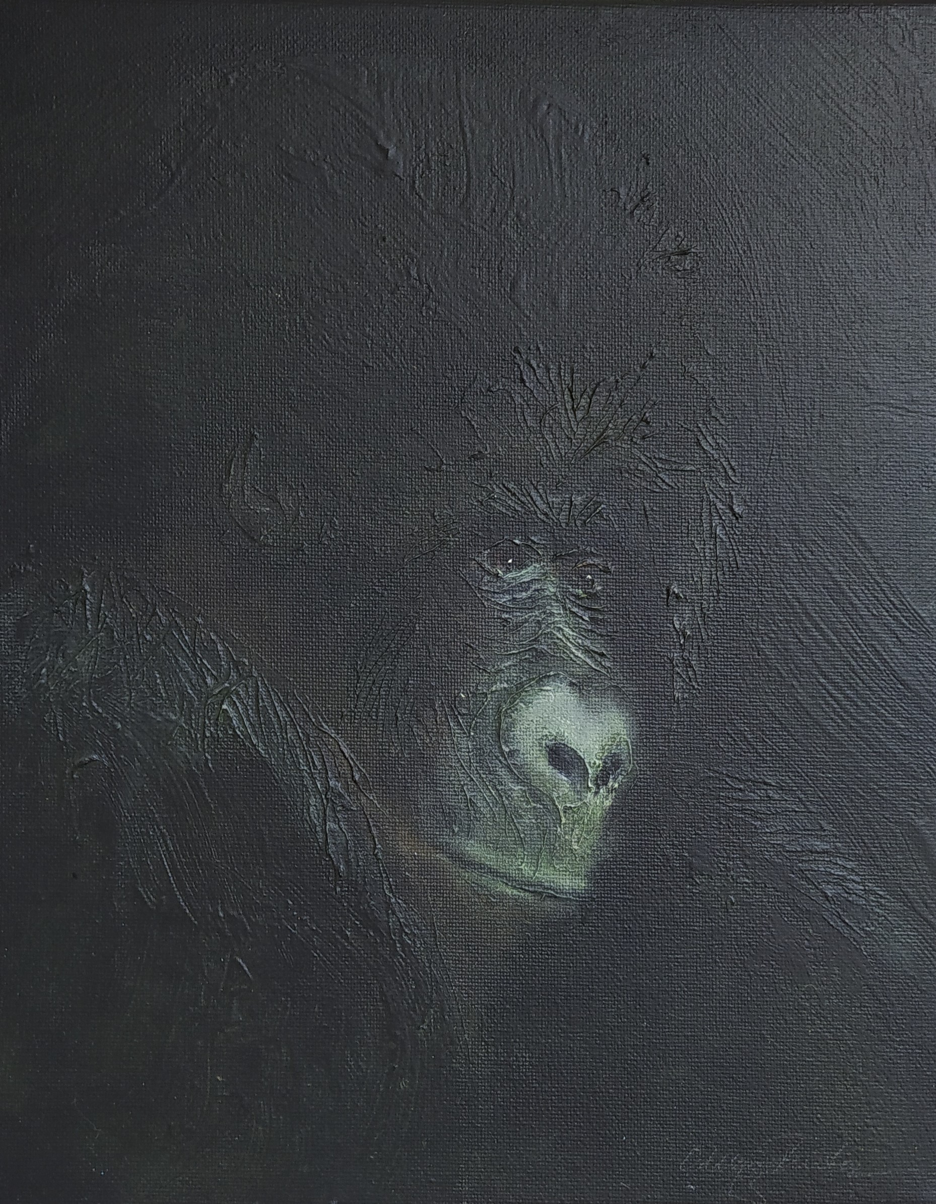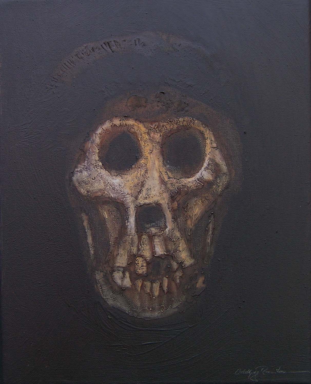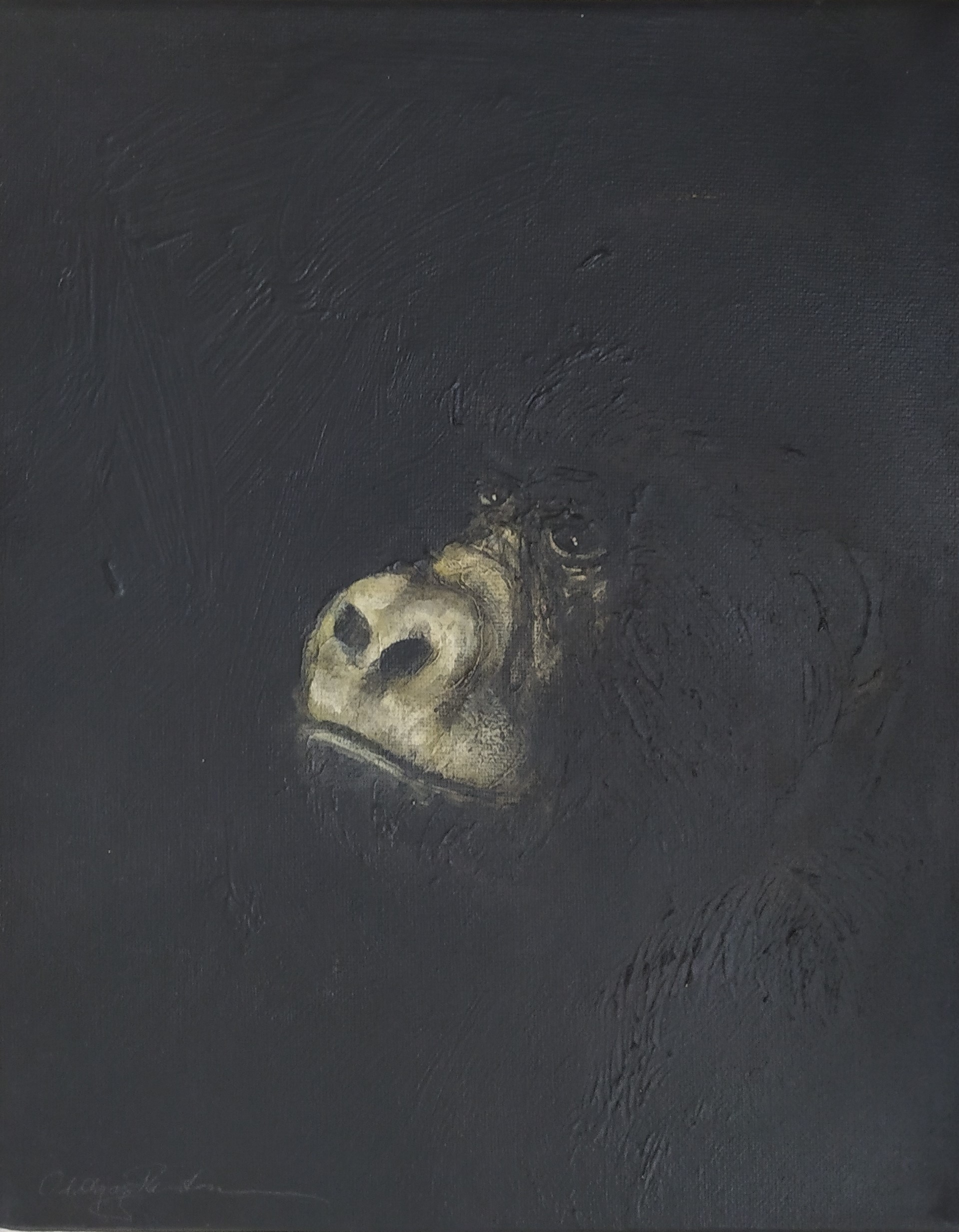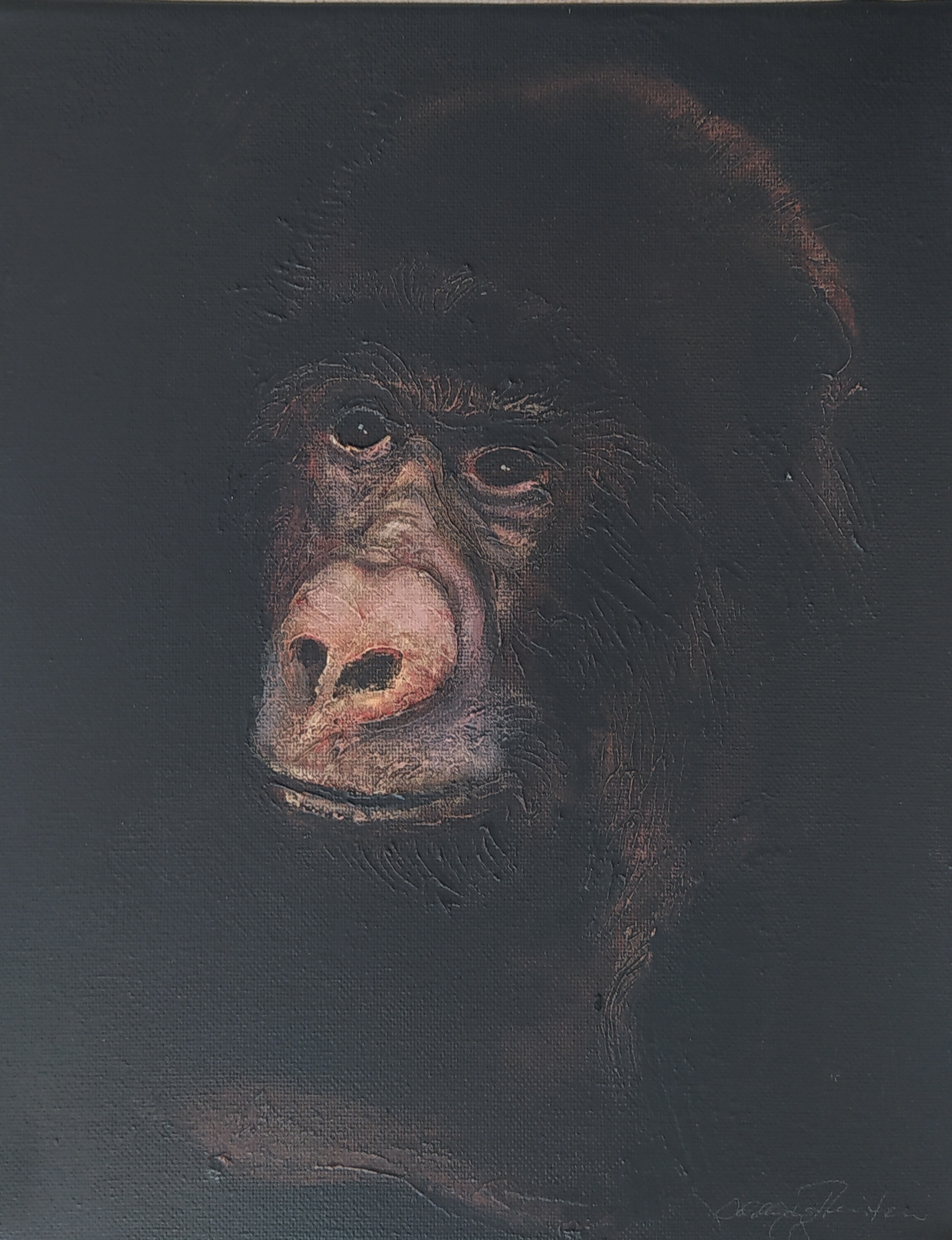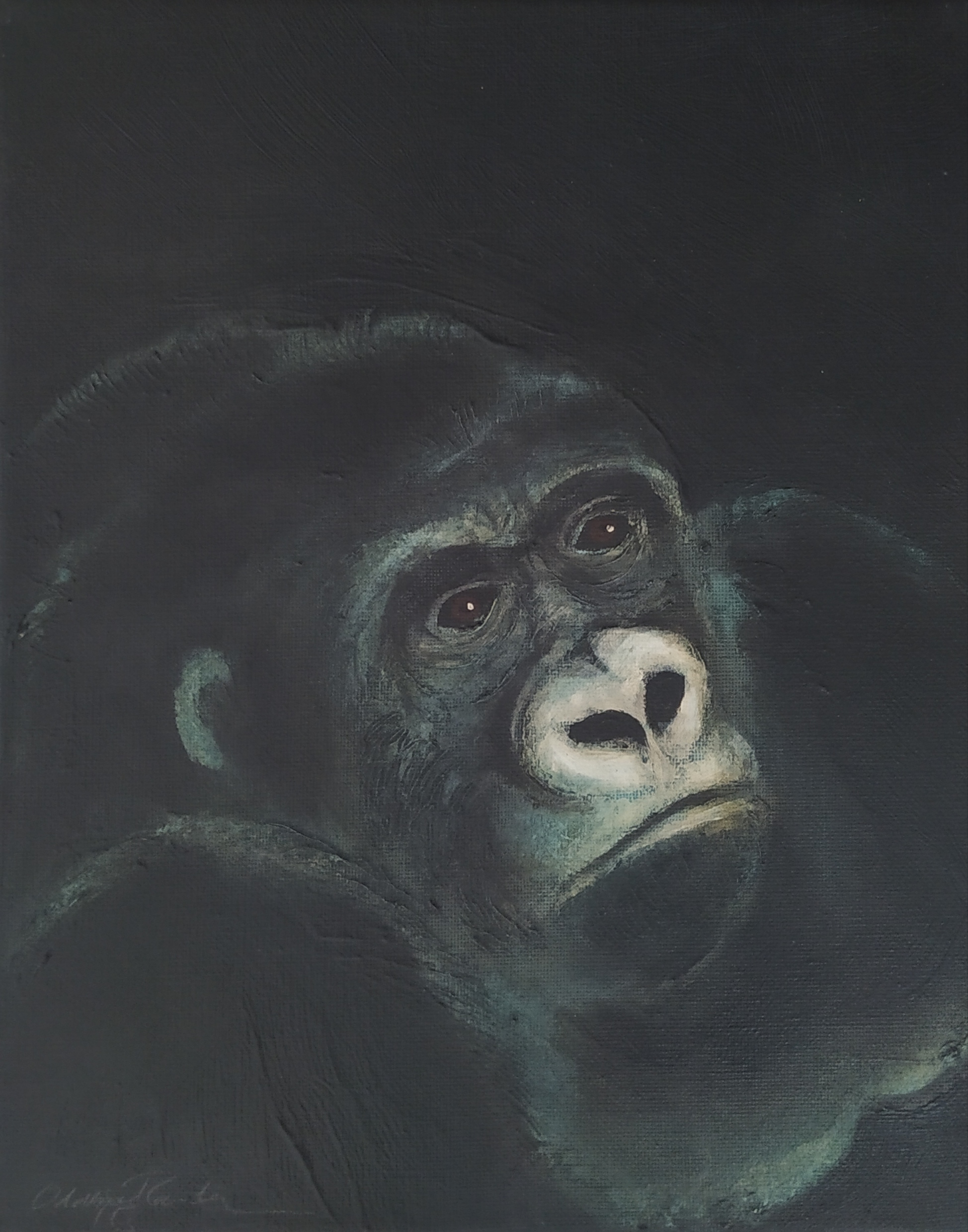 (...) Each painting pertains to a tradition of the portrait that painting notably passed on to photography at the turn of the 18th century – the composition, the pause, the light, focused on a part of the face, the gentle or intense look give the visitor the impression that every gorilla emerges from an endless dream or from a mysterious stasis magnified by the sublime black backgrounds which defines them all. O. Reinton thus honors each face like a notable member of a family who would care about telling their generational history thanks to the so-called “family portraits”. But, paradoxically, each portrait is also a print, the painting facsimile of a more ordinary kind of images – the photo ID, the one that you can get at a photo-robot for instance. Emotion then bursts out from this discrepancy between the two categories of images (...)
