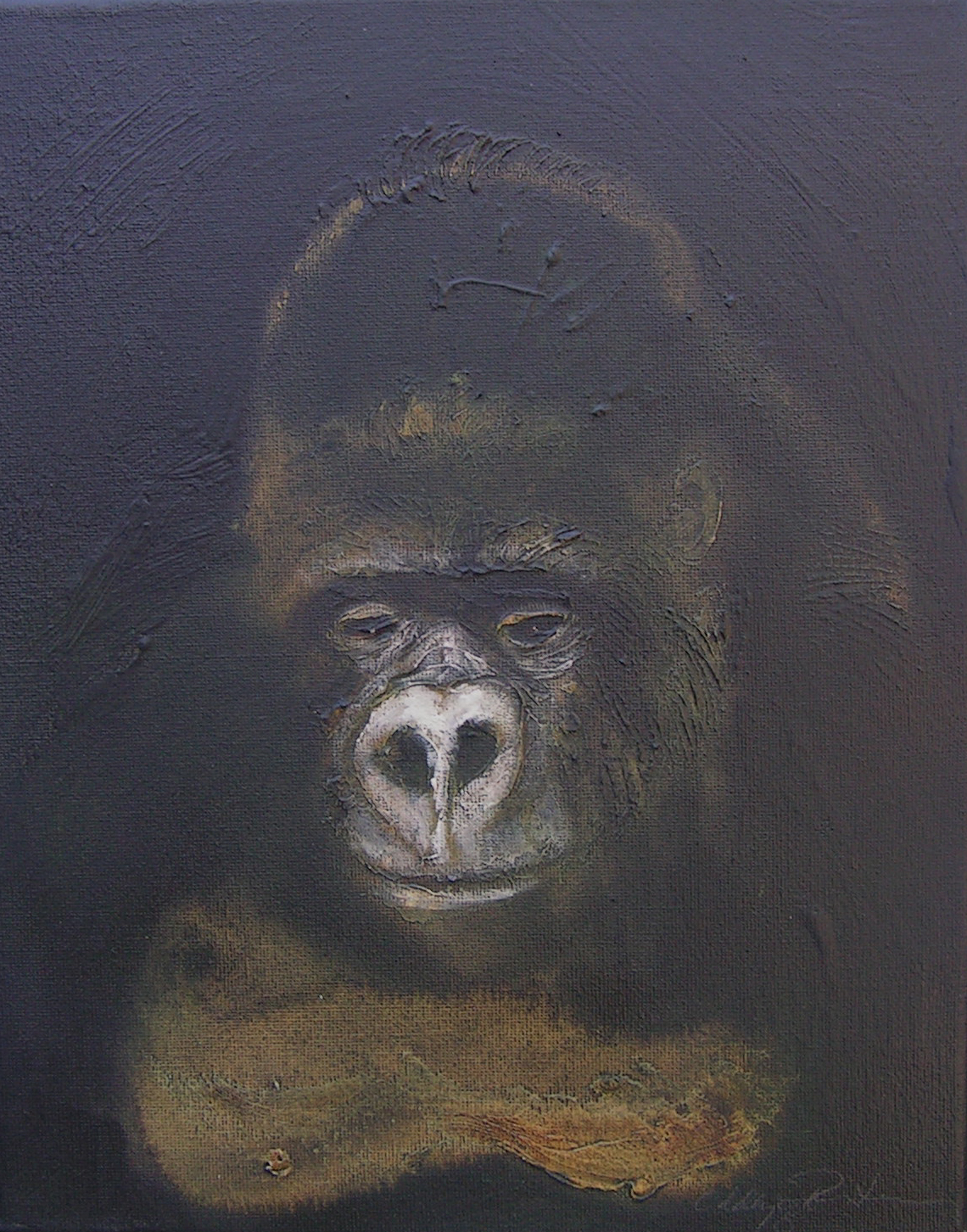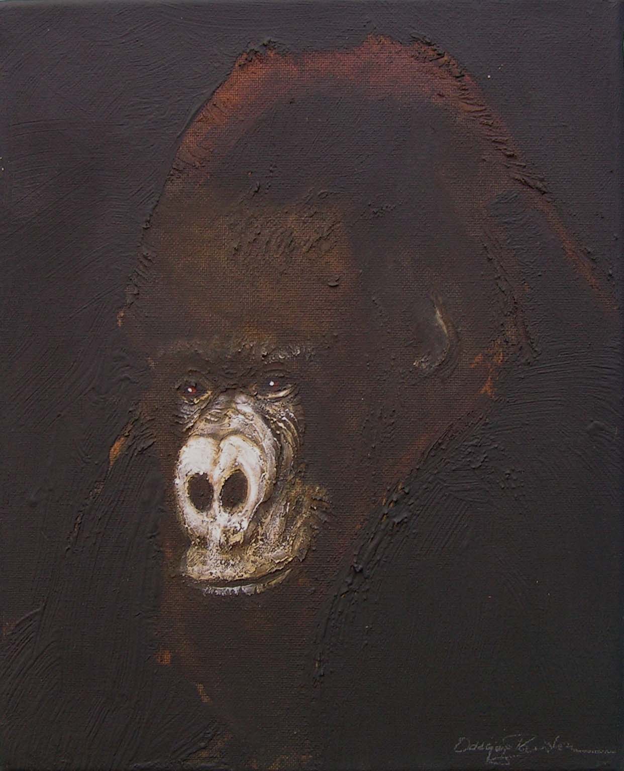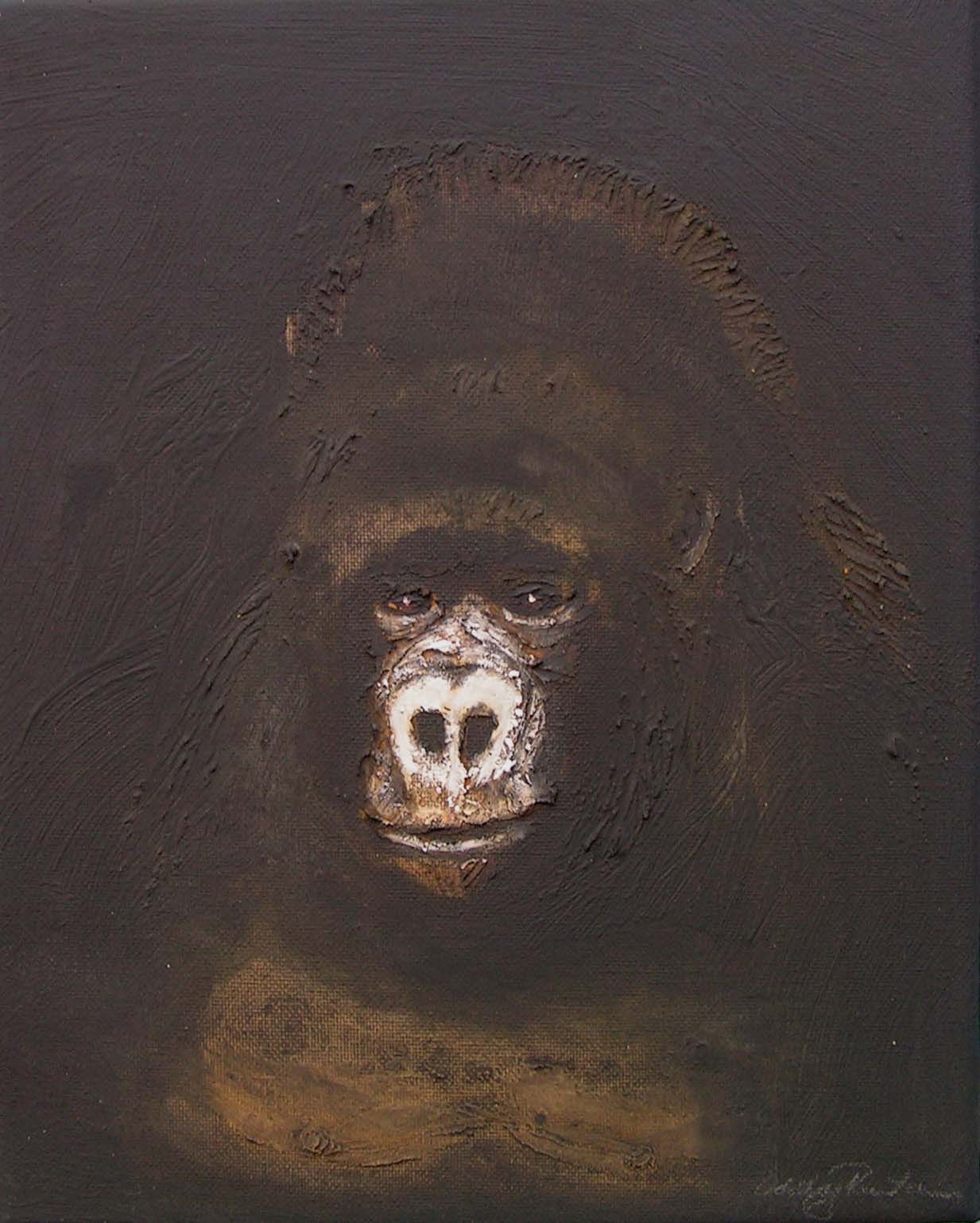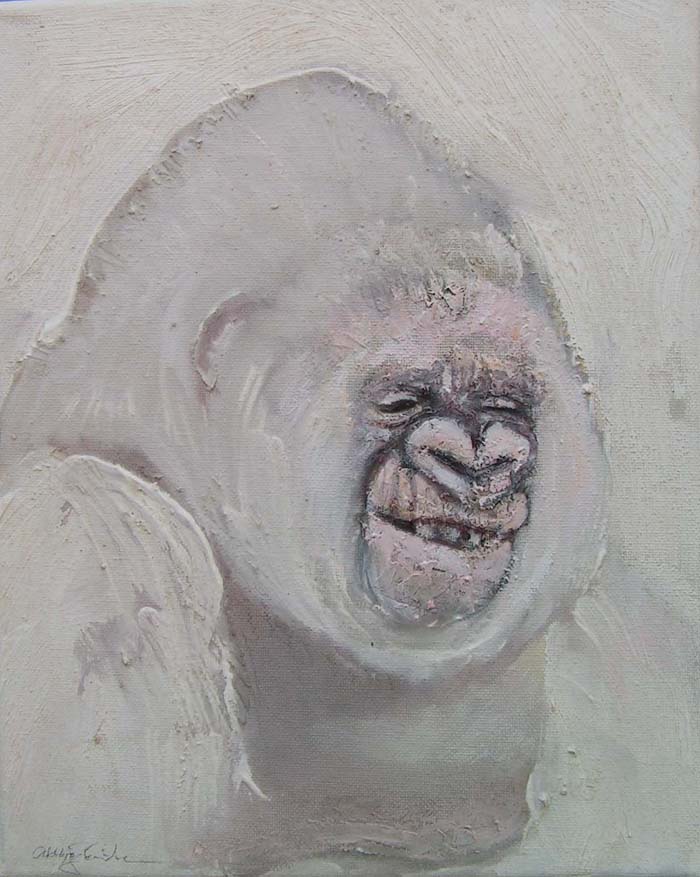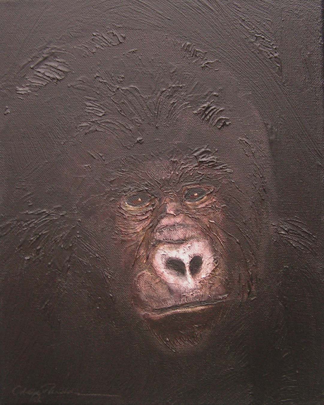 Between 2004 and 2006 I painted 200 small "portraits" (24 x 30 cm) of gorillas, much like photo ID, to refer to the Cross River gorilla (Nigeria and Cameroon), a subspecies of the western gorilla. At that time there were about 200 individuals left in the wild and the portraits were meant to represent a symbolic conservation measure for this animal in an attempt to make people aware of the looming extinction.