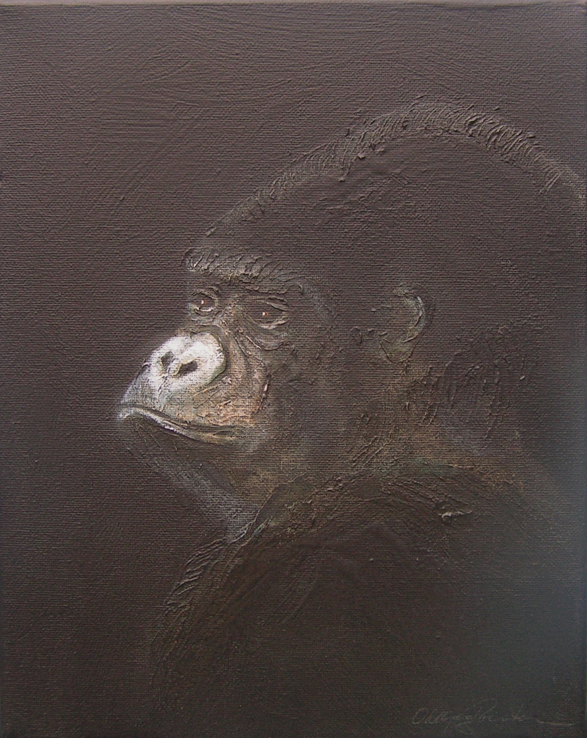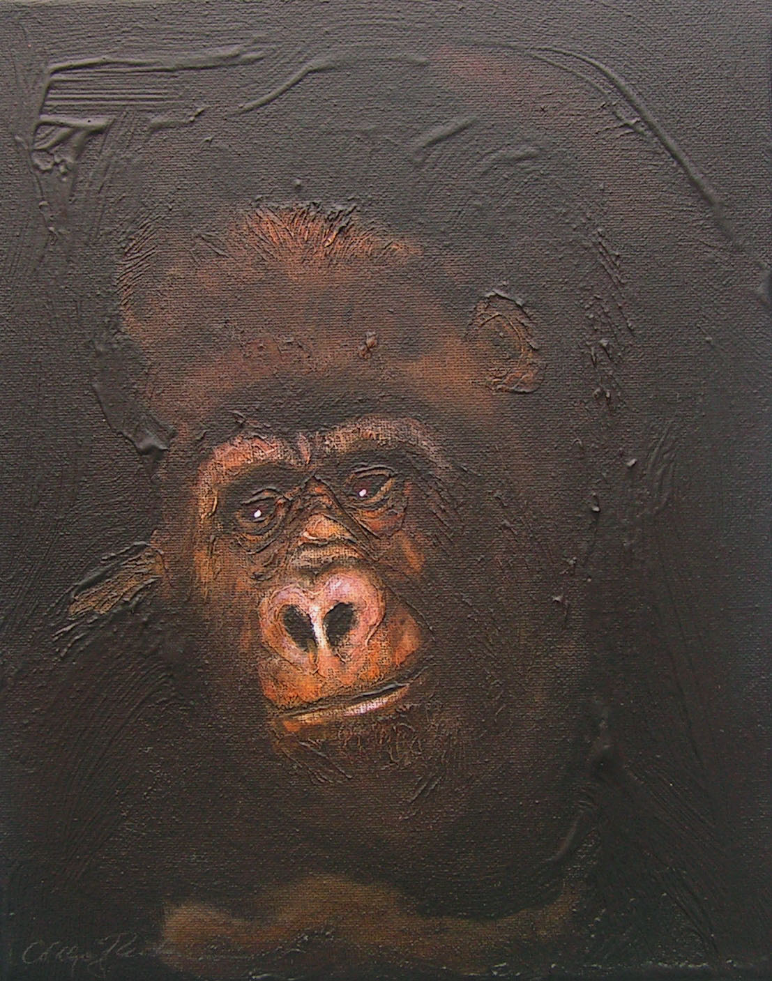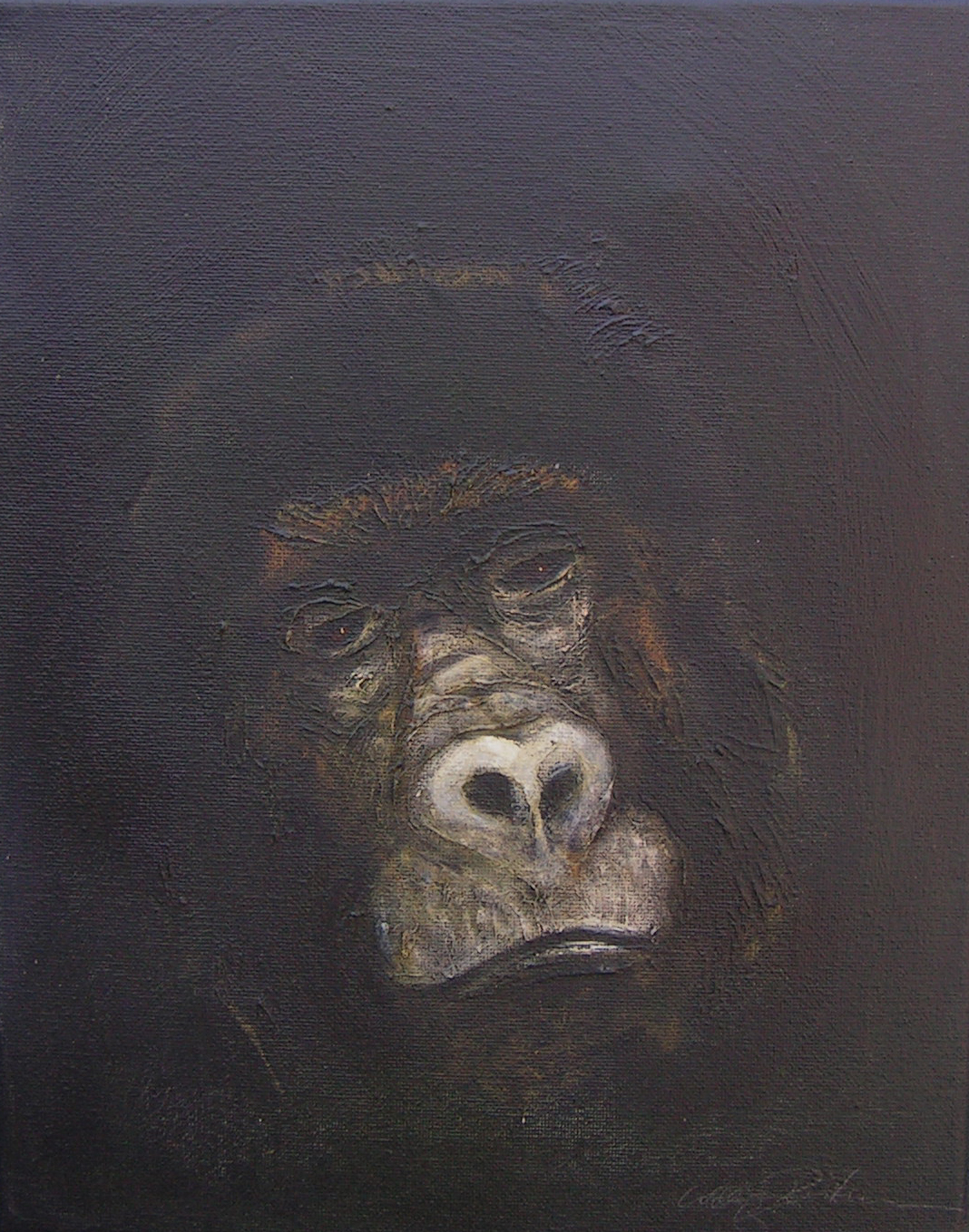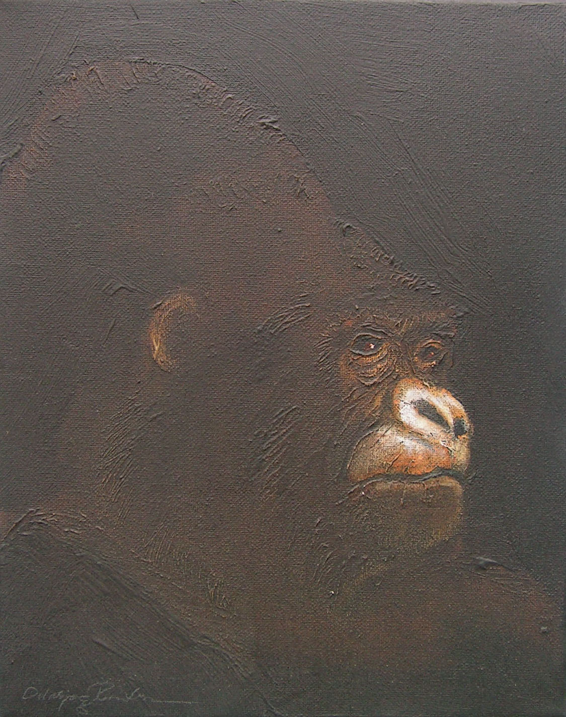 Between 2004 and 2006 I painted 200 small "portraits" (24 x 30 cm) of gorillas, much like photo ID, to refer to the Cross River gorilla (Nigeria and Cameroon), a subspecies of the western gorilla. At that time there were about 200 individuals left in the wild and the portraits were meant to represent a symbolic conservation measure for this animal in an attempt to make people aware of the looming extinction.