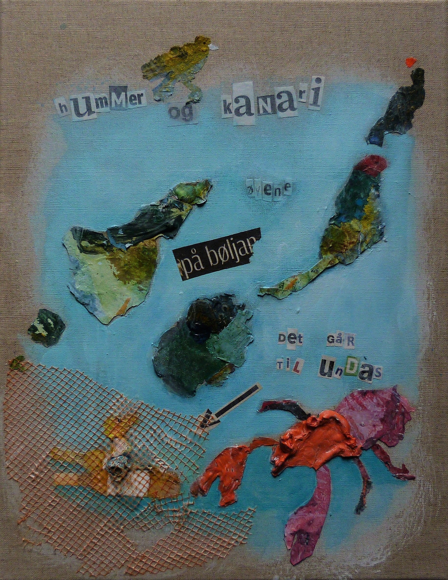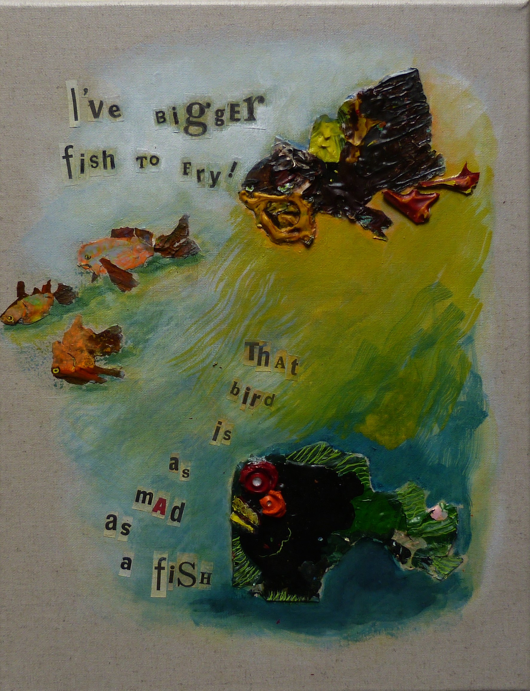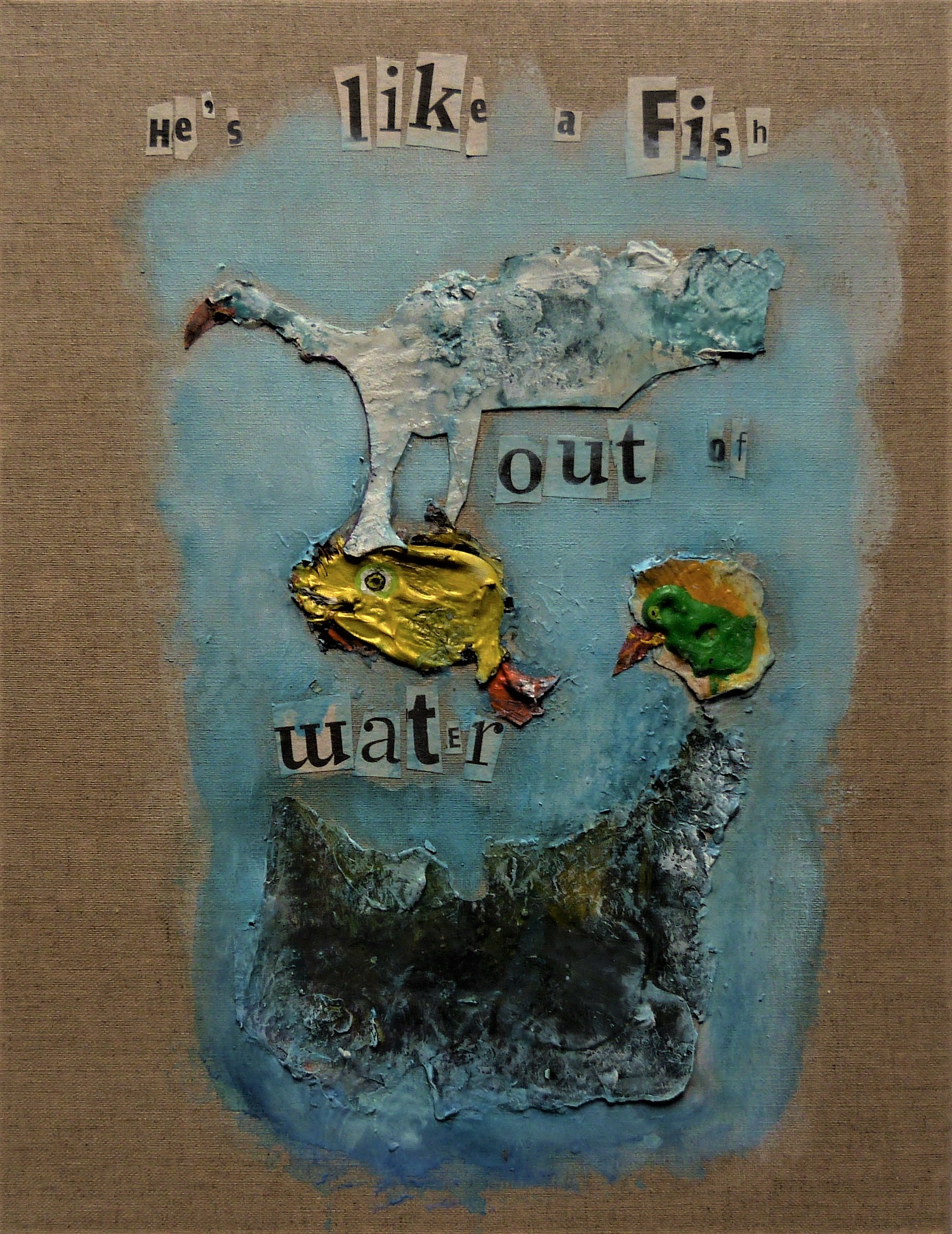 Pour une exposition entre mer et terre, au phare Ryvarden en Norvège en 2017, j’ai créé une série de collages sur toiles de lin que j'ai intitulée Impressions et expressions anonymes / Neither Fish nor Fowl en utilisant et en comparant des expressions et dictons norvégiens, anglophones et / ou français autour de poissons et d'oiseaux.