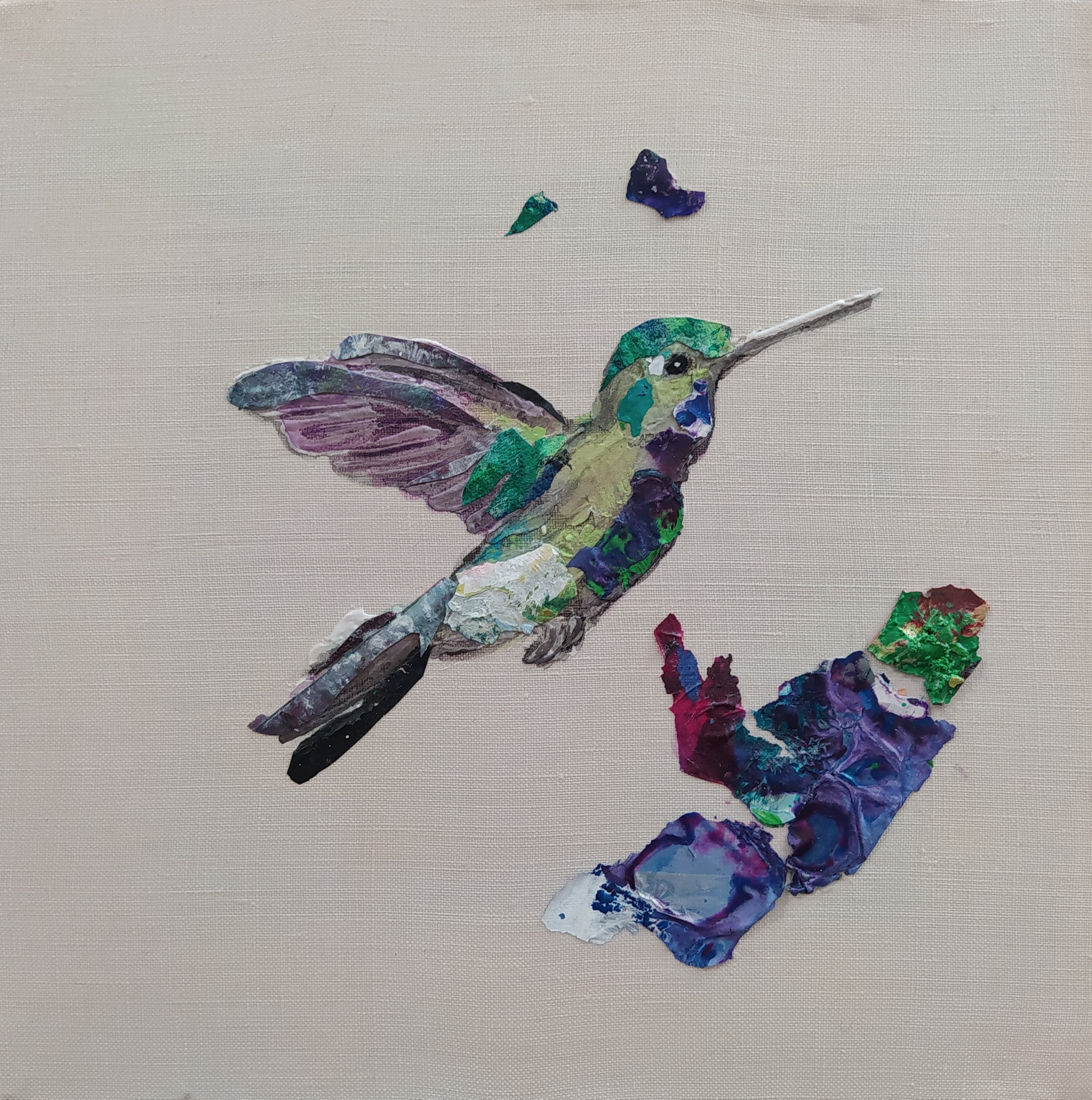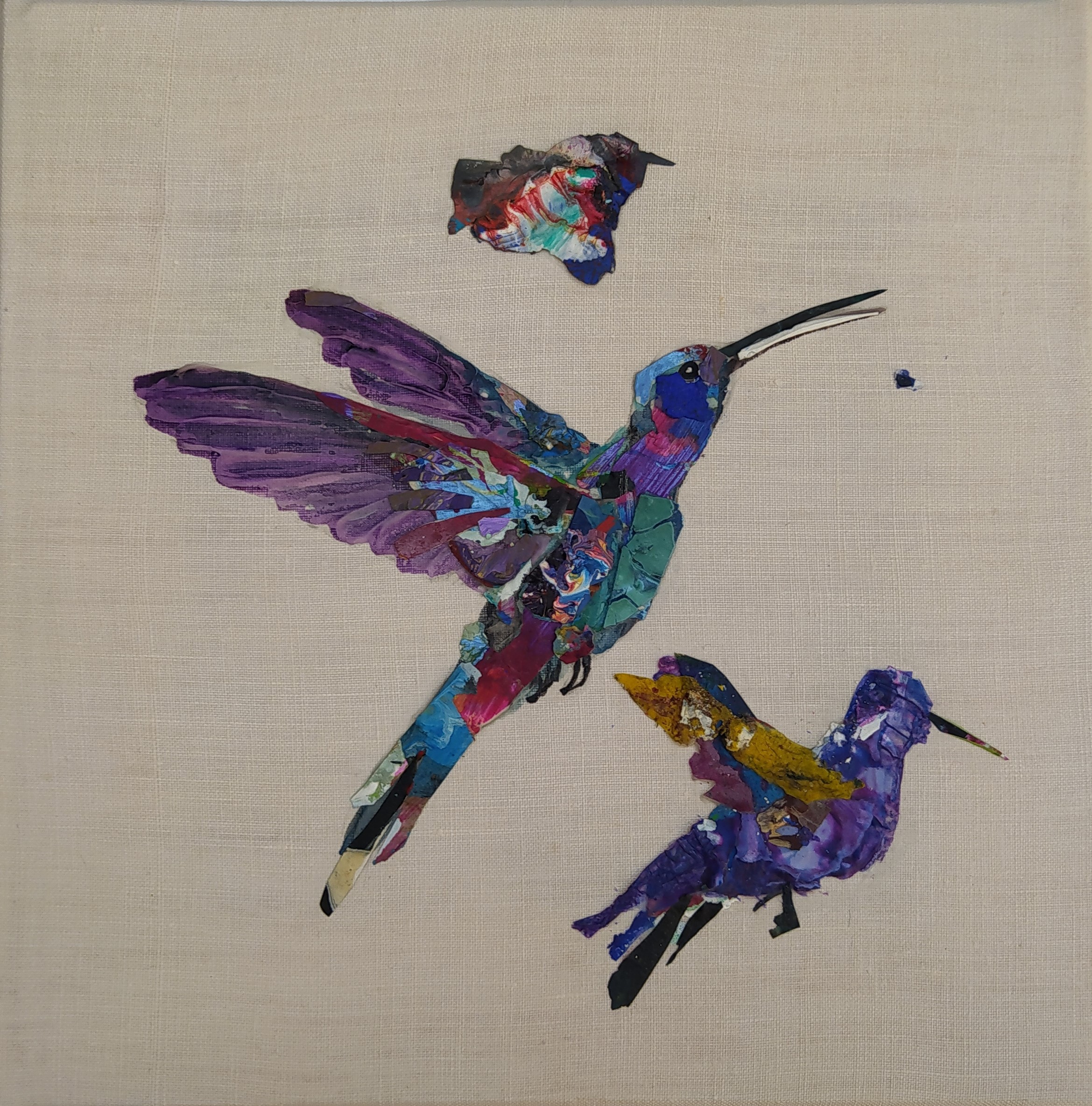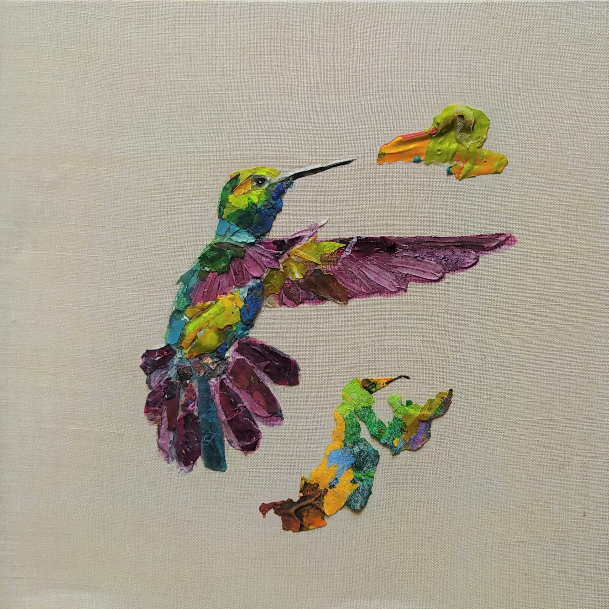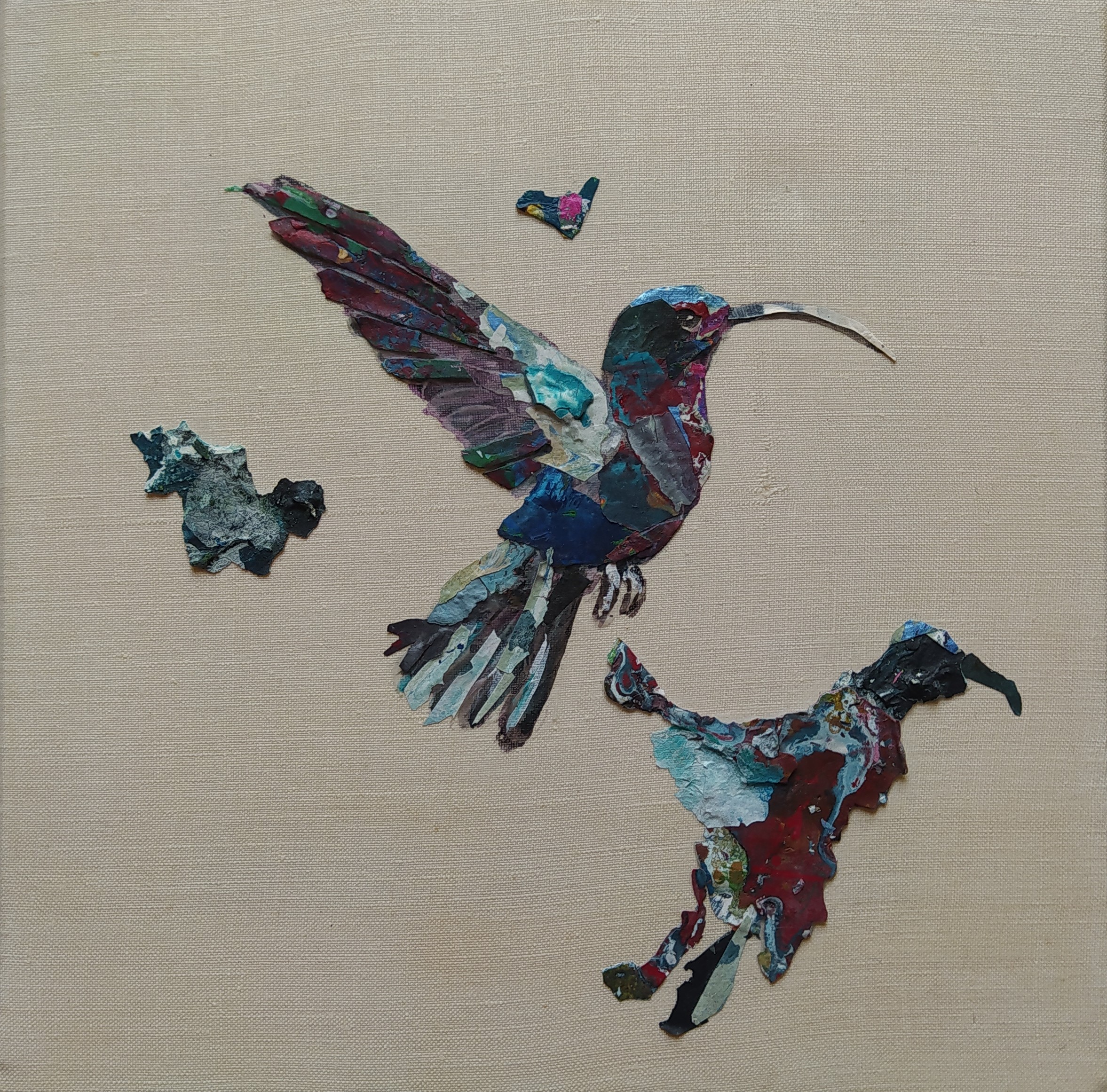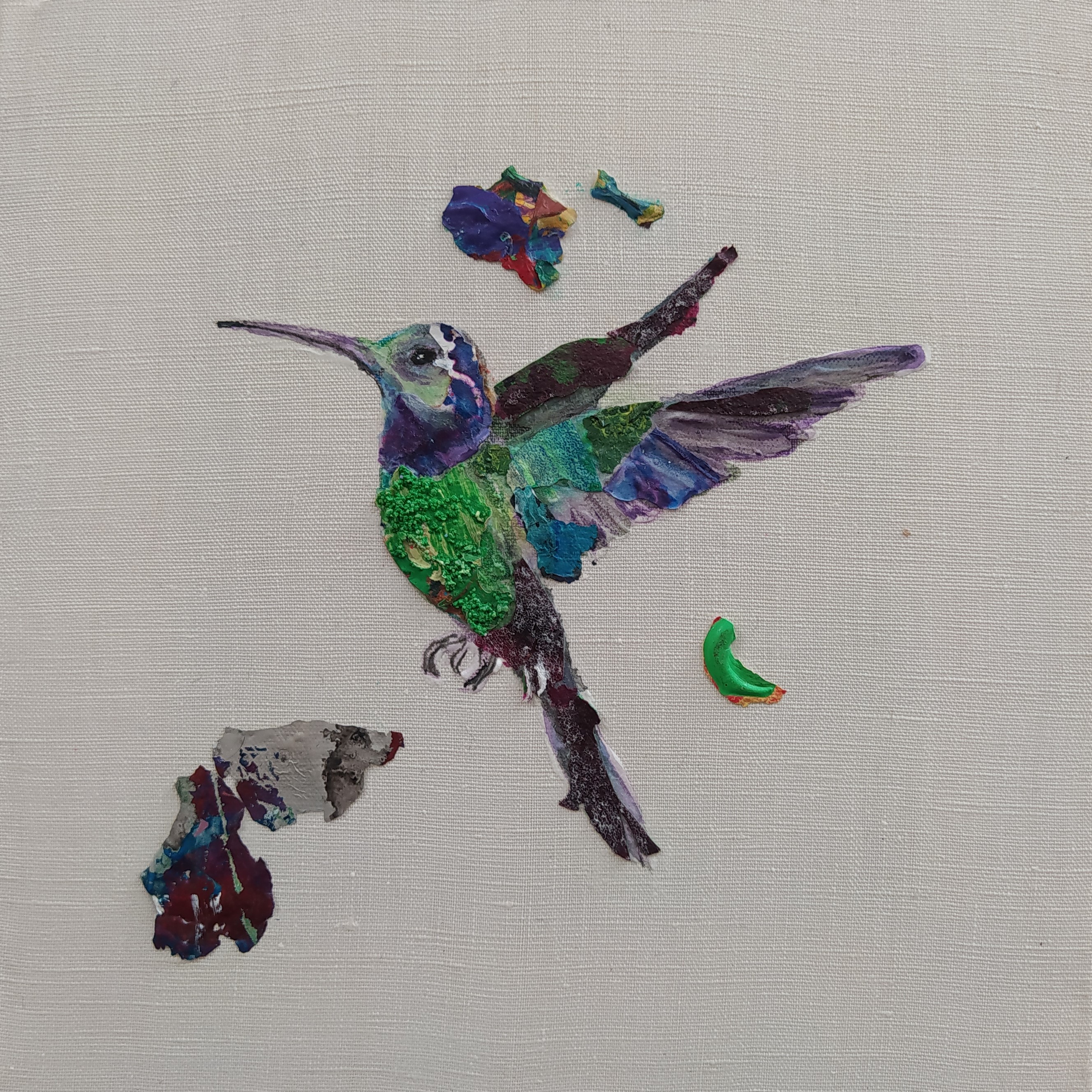 Except for the stretchers made of responsible wood, my overarching goal of producing as little waste as possible, through recycling and transforming the various materials that I already have at hand, has been respected : The paint scraps are leftover acrylic skins from when I had students in my studio, and the linen canvas is a precious gift; a fabric woven some one hundred years ago in France.