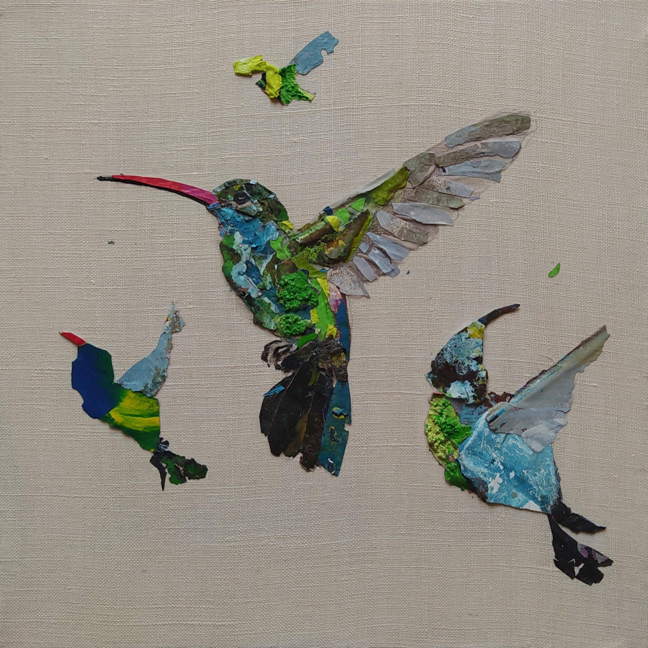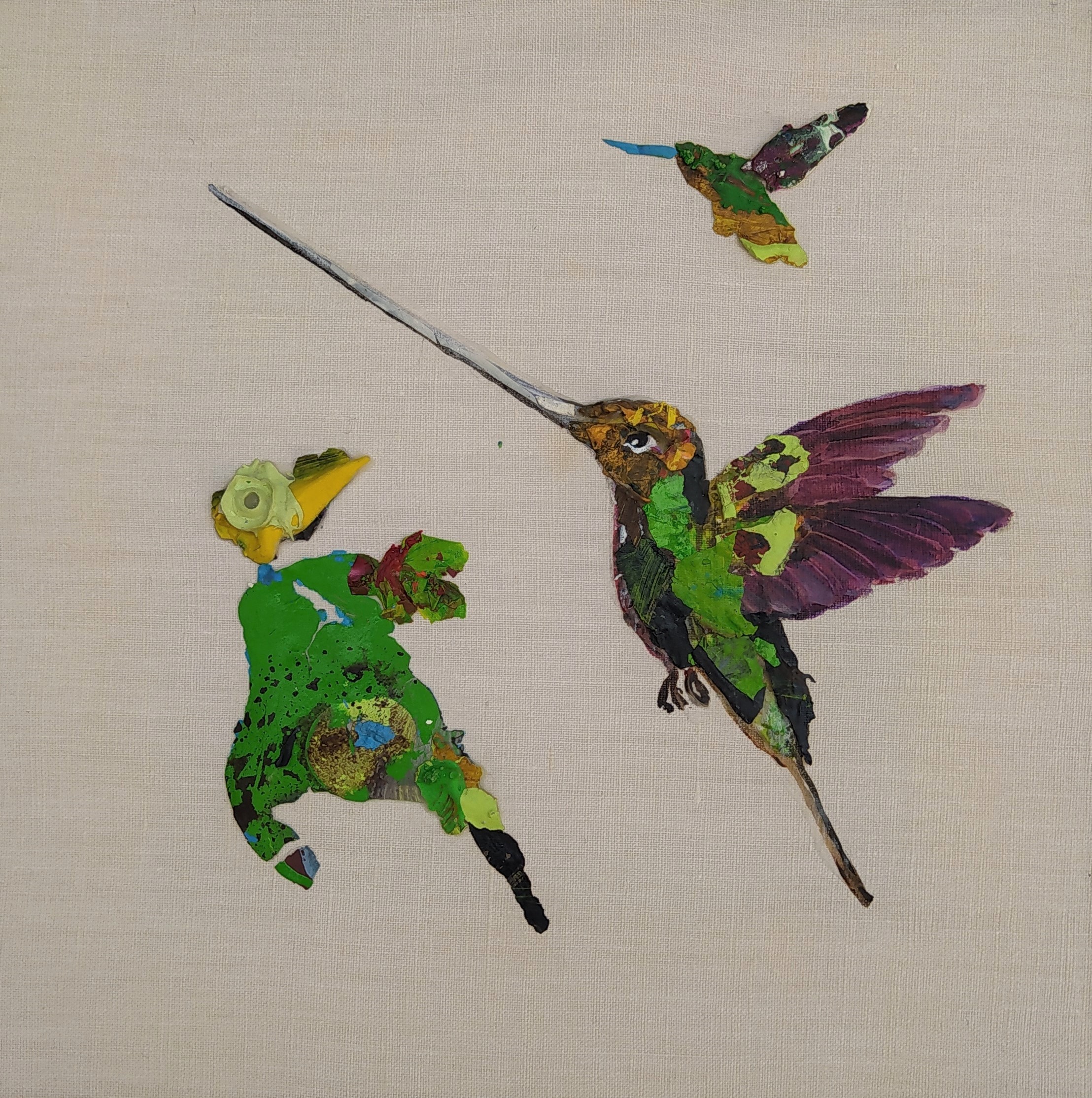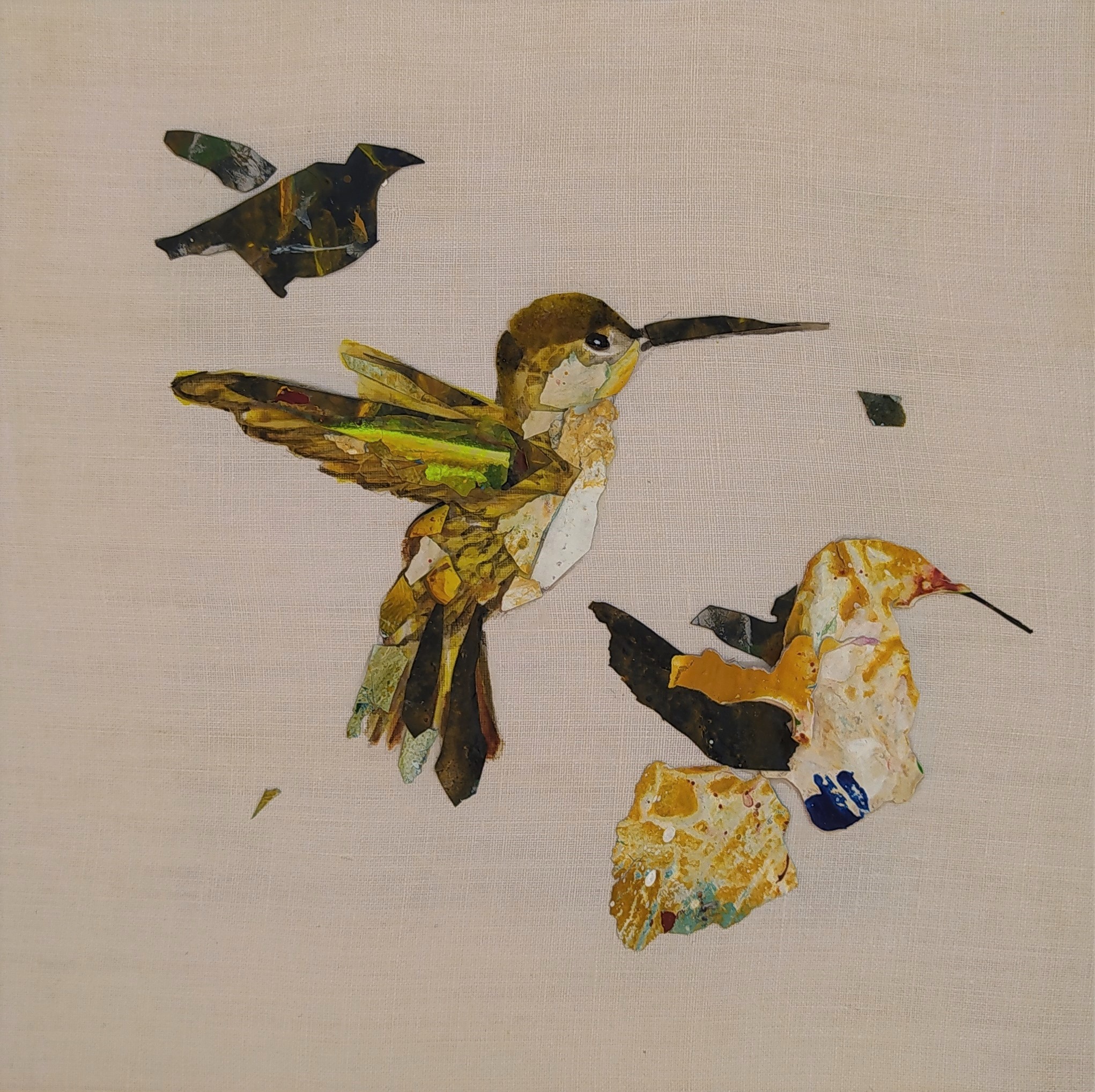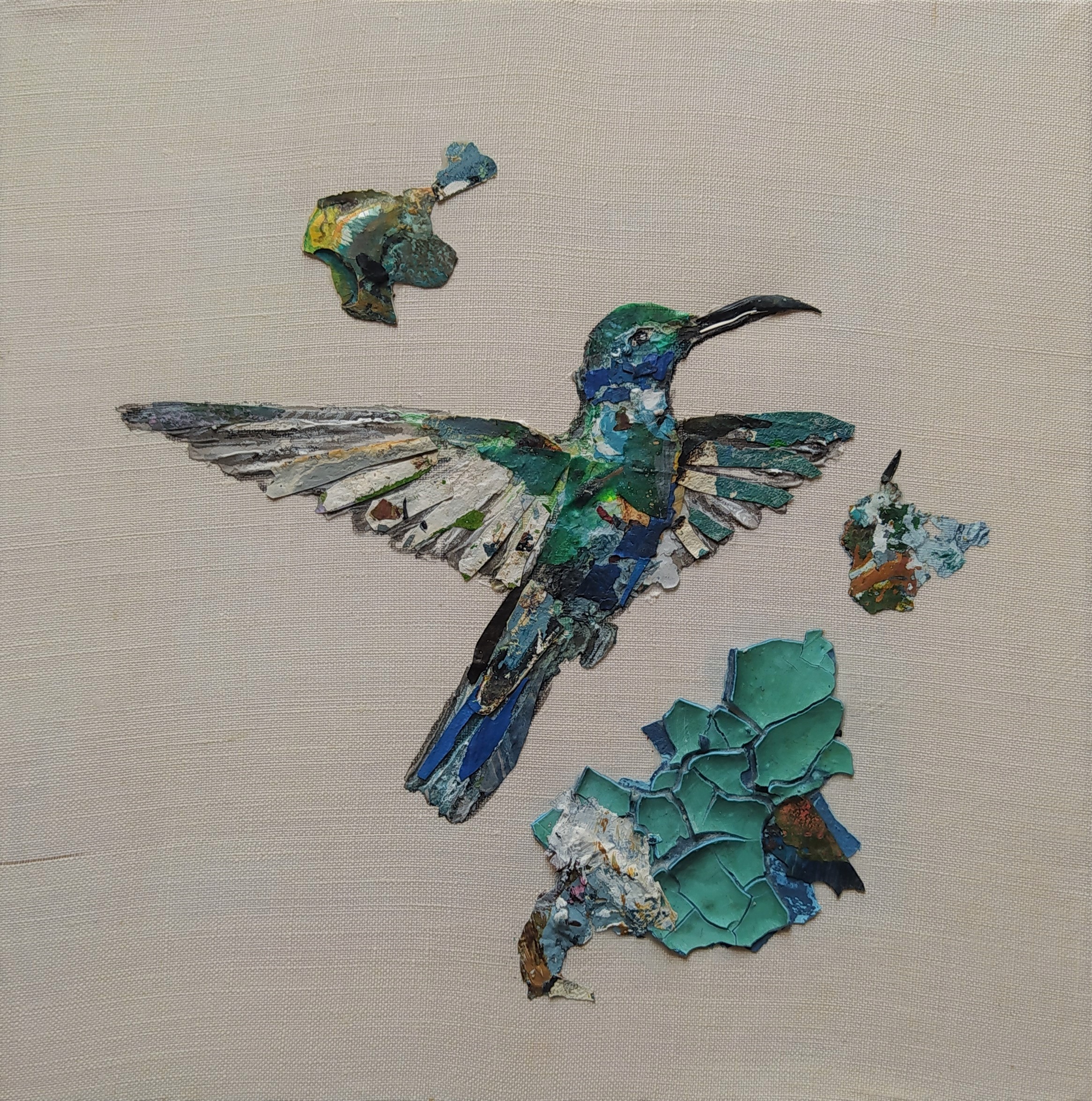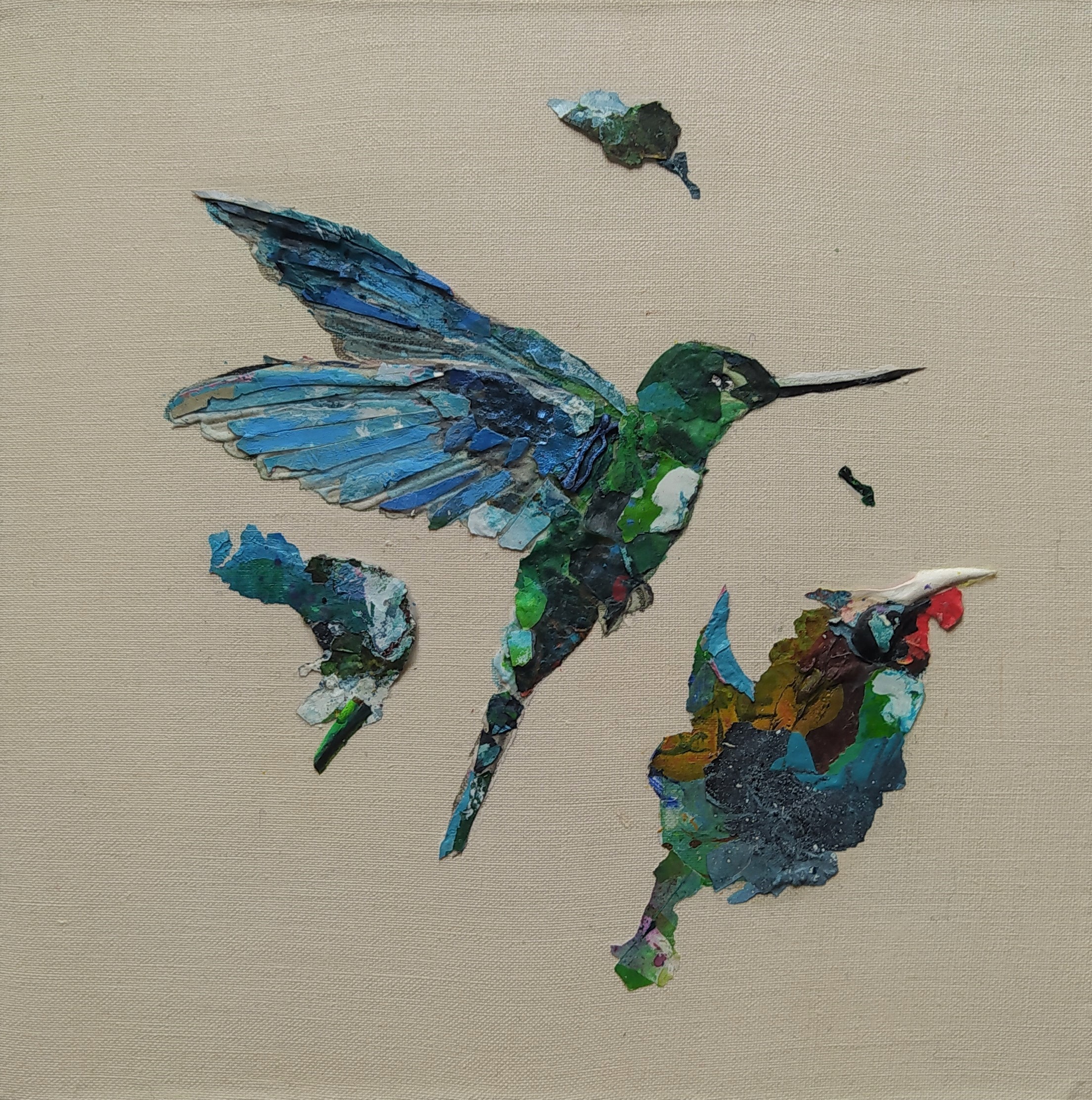 Except for the stretchers made of responsible wood, my overarching goal of producing as little waste as possible, through recycling and transforming the various materials that I already have at hand, has been respected : The paint scraps are leftover acrylic skins from when I had students in my studio, and the linen canvas is a precious gift; a fabric woven some one hundred years ago in France.