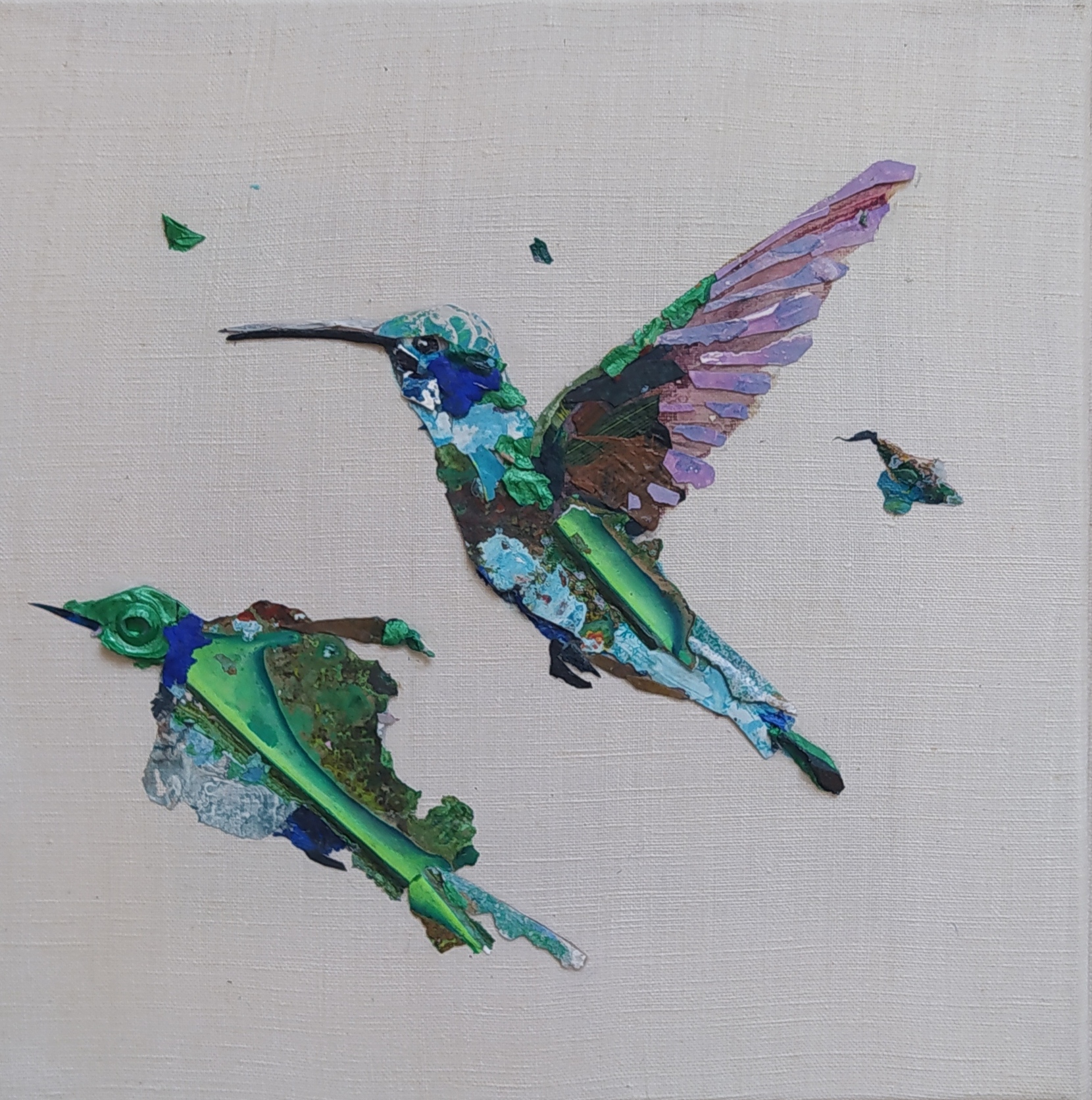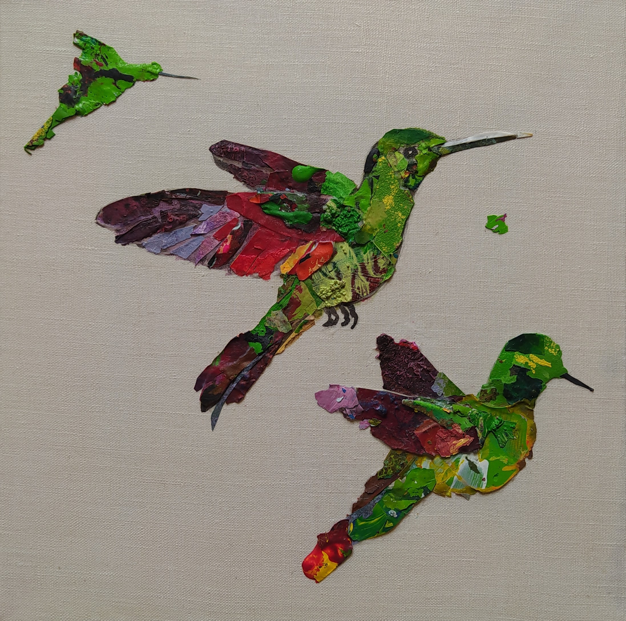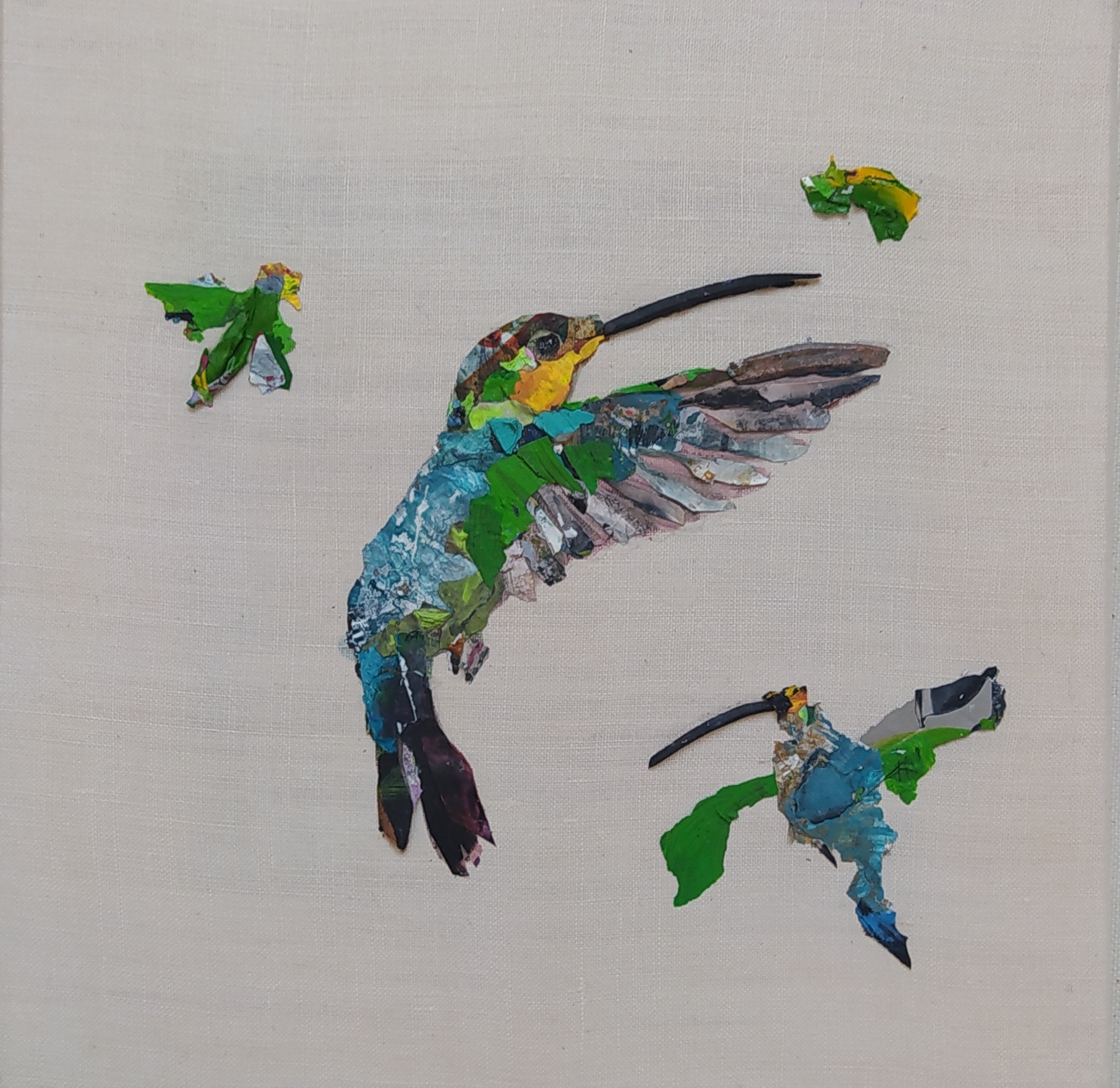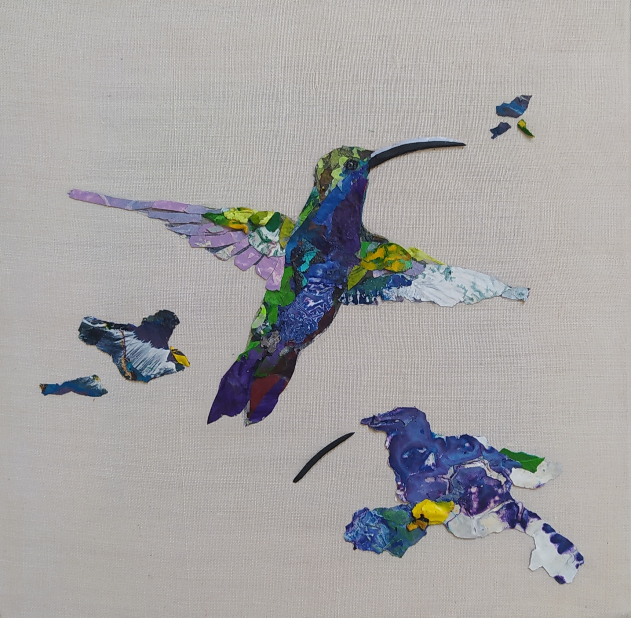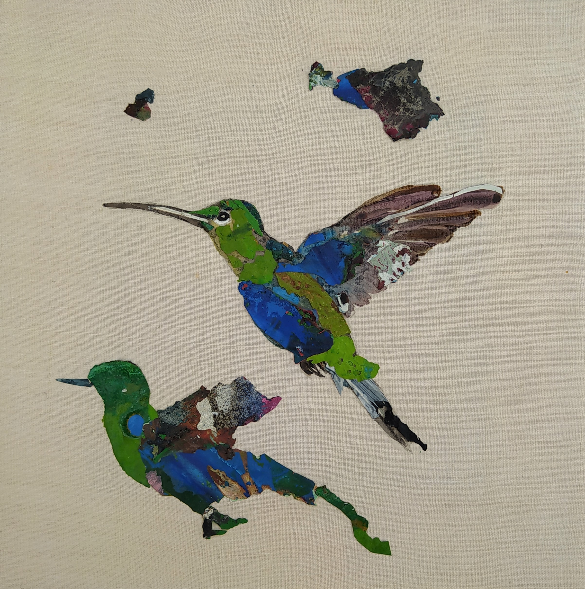 Except for the stretchers made of responsible wood, my overarching goal of producing as little waste as possible, through recycling and transforming the various materials that I already have at hand, has been respected : The paint scraps are leftover acrylic skins from when I had students in my studio, and the linen canvas is a precious gift; a fabric woven some one hundred years ago in France.