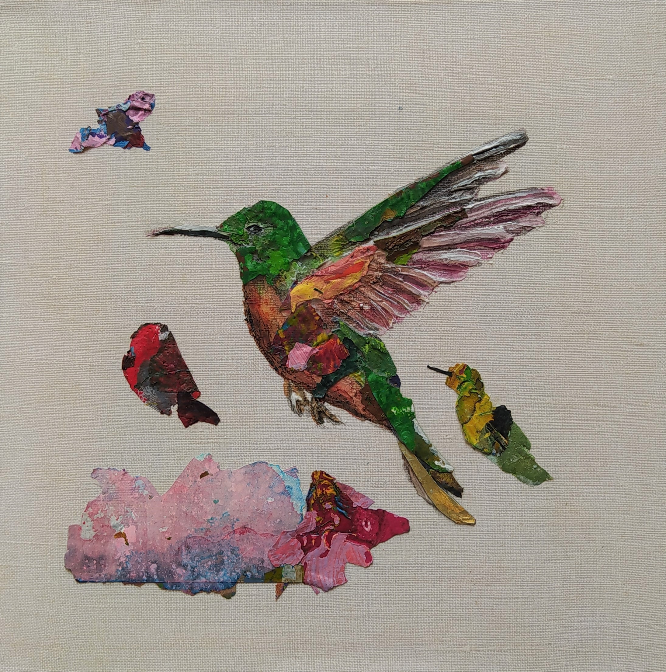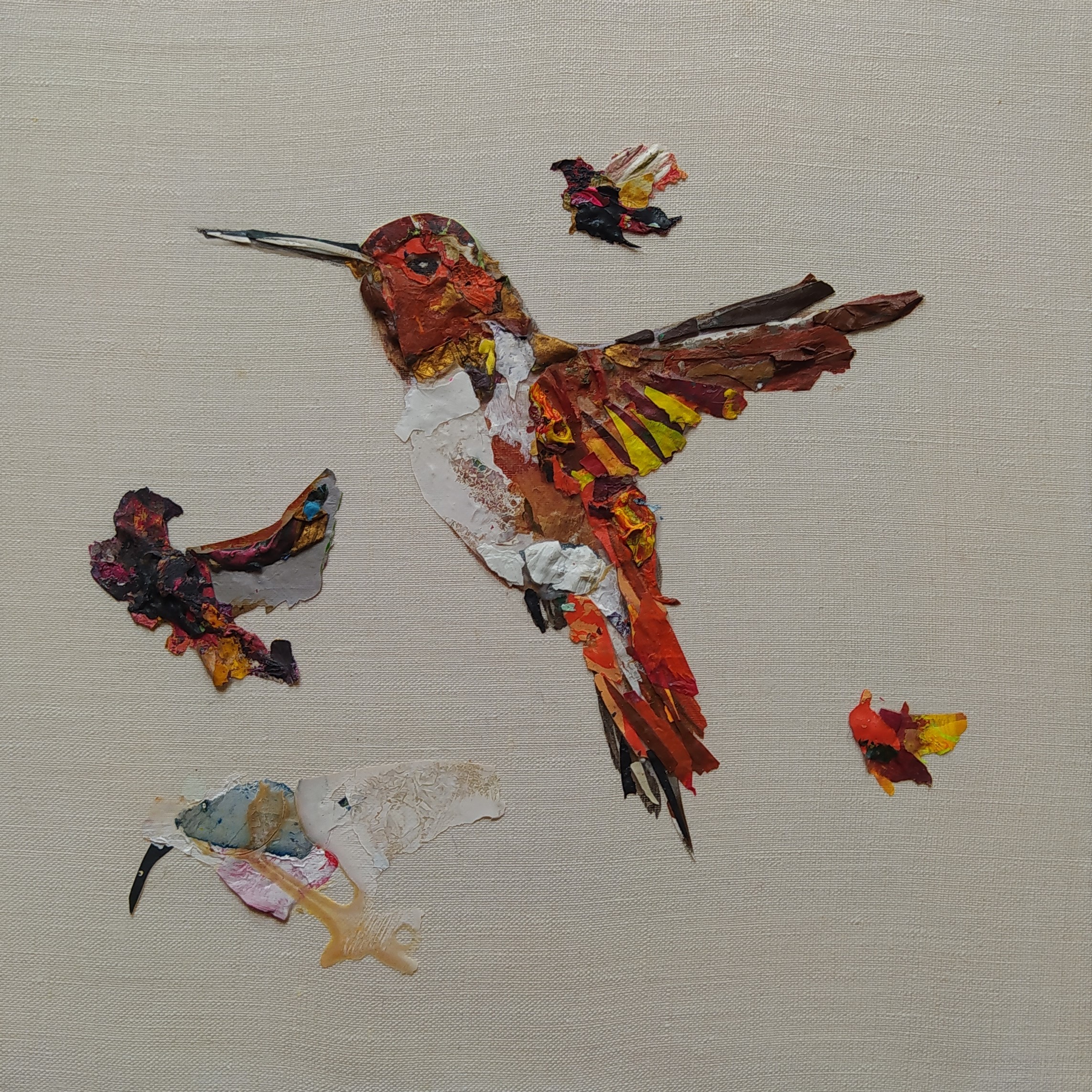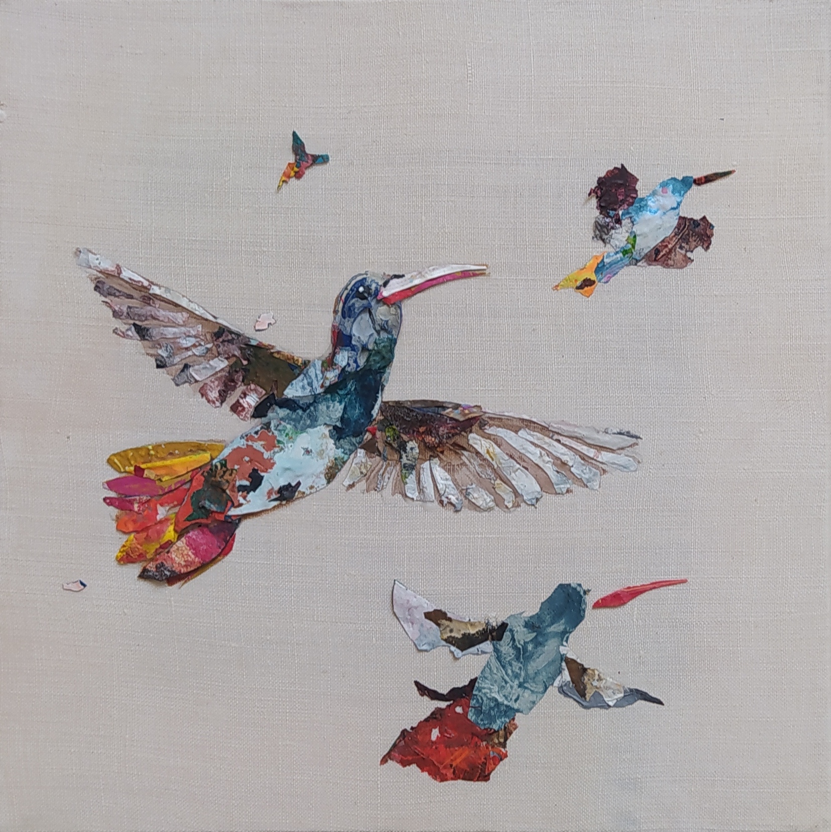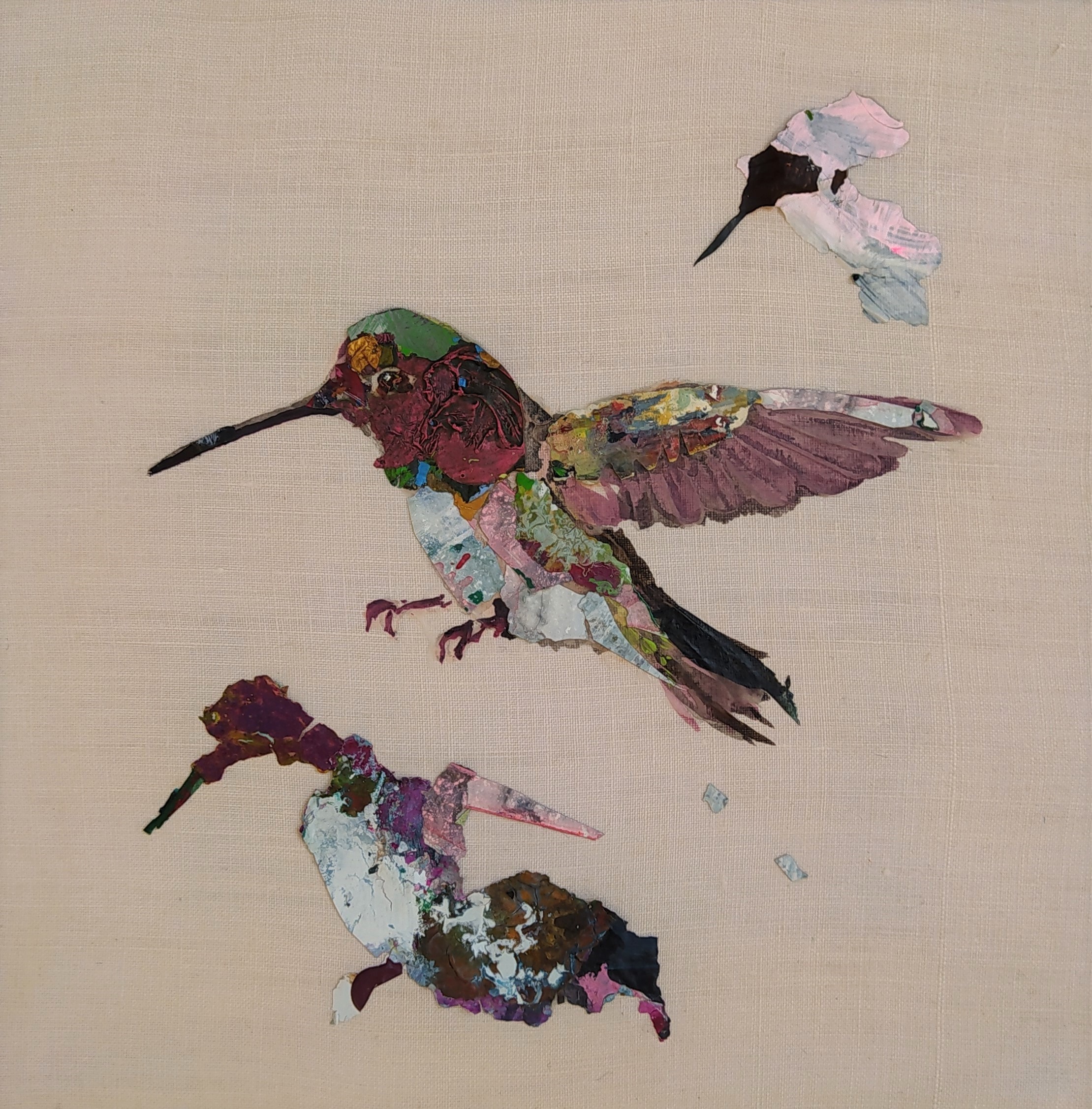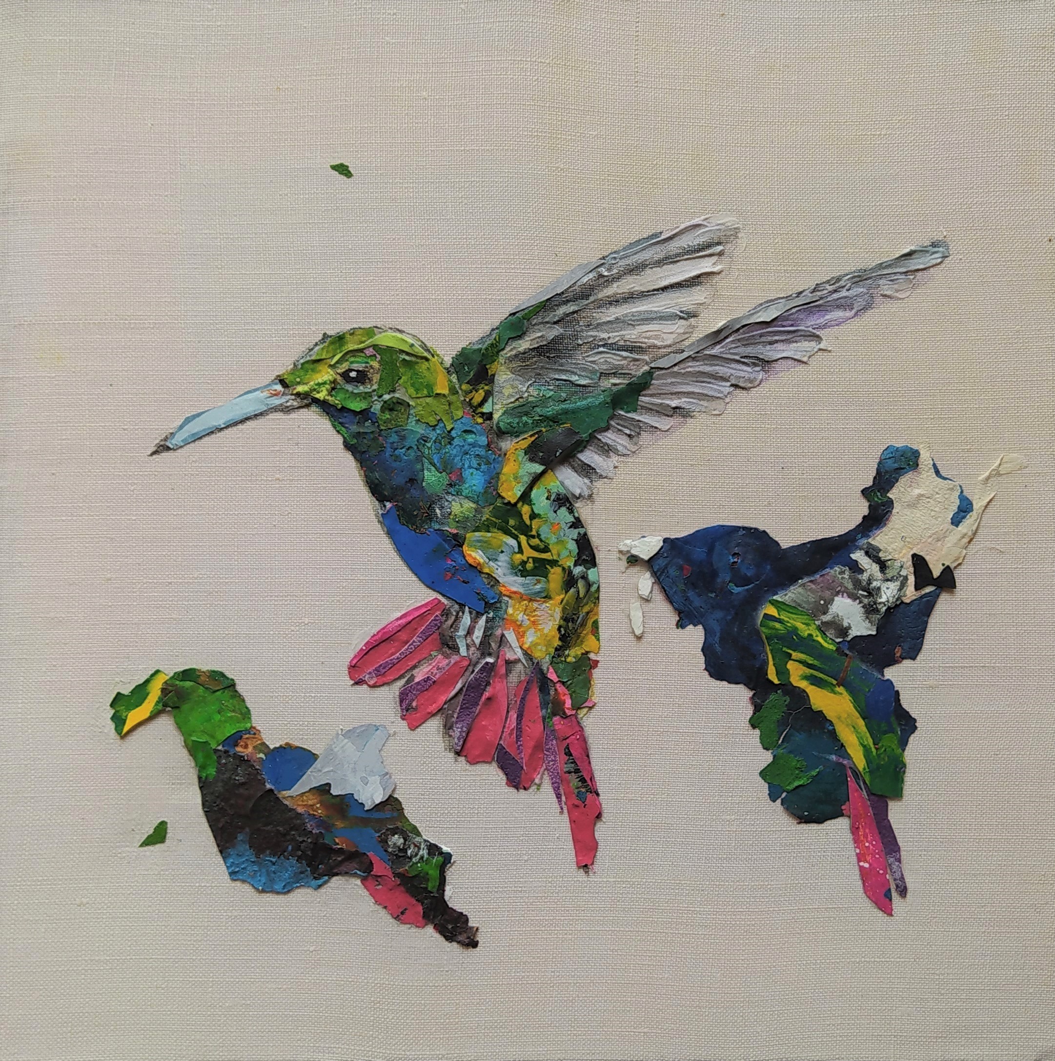 Except for the stretchers made of responsible wood, my overarching goal of producing as little waste as possible, through recycling and transforming the various materials that I already have at hand, has been respected : The paint scraps are leftover acrylic skins from when I had students in my studio, and the linen canvas is a precious gift; a fabric woven some one hundred years ago in France.