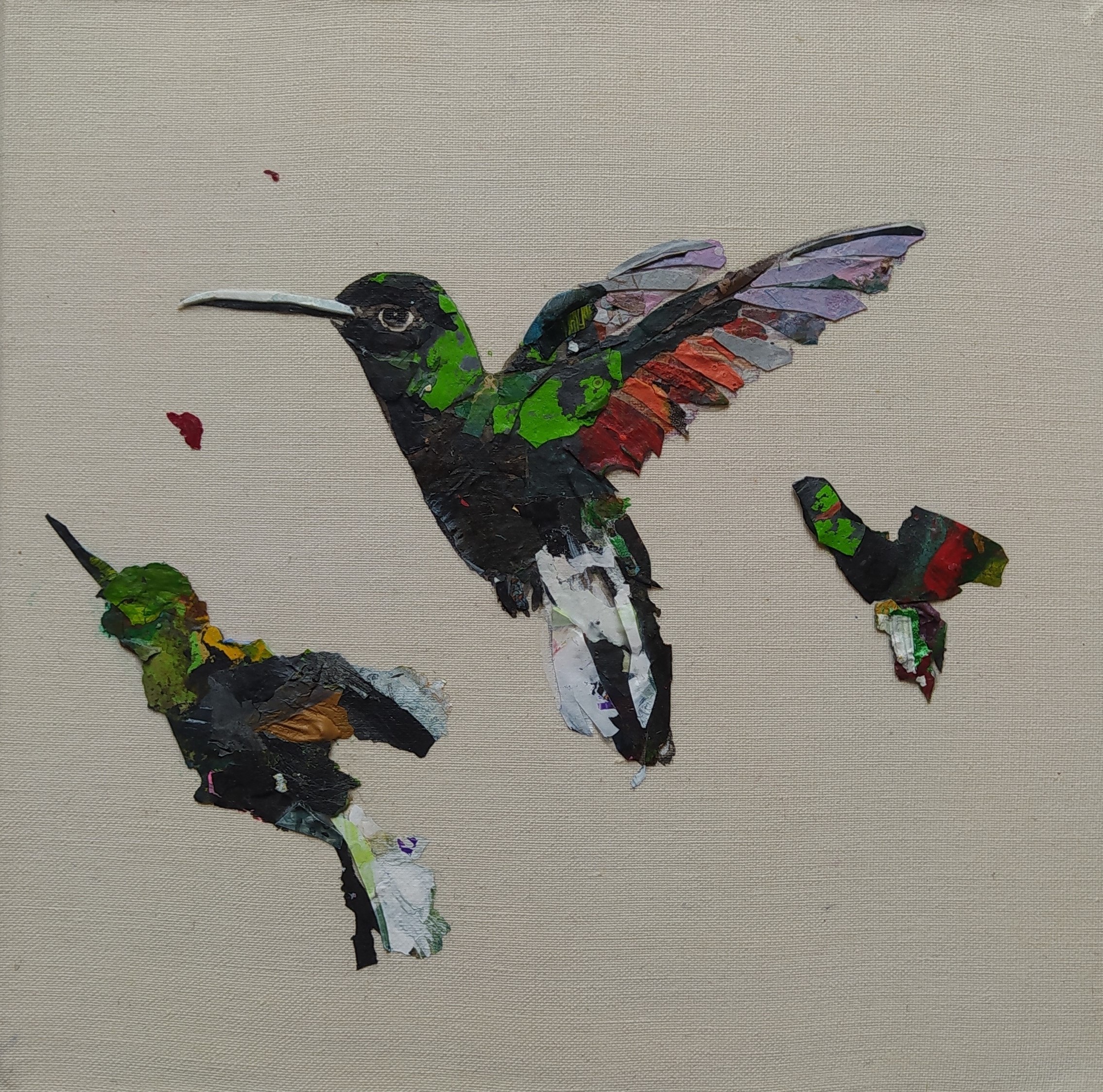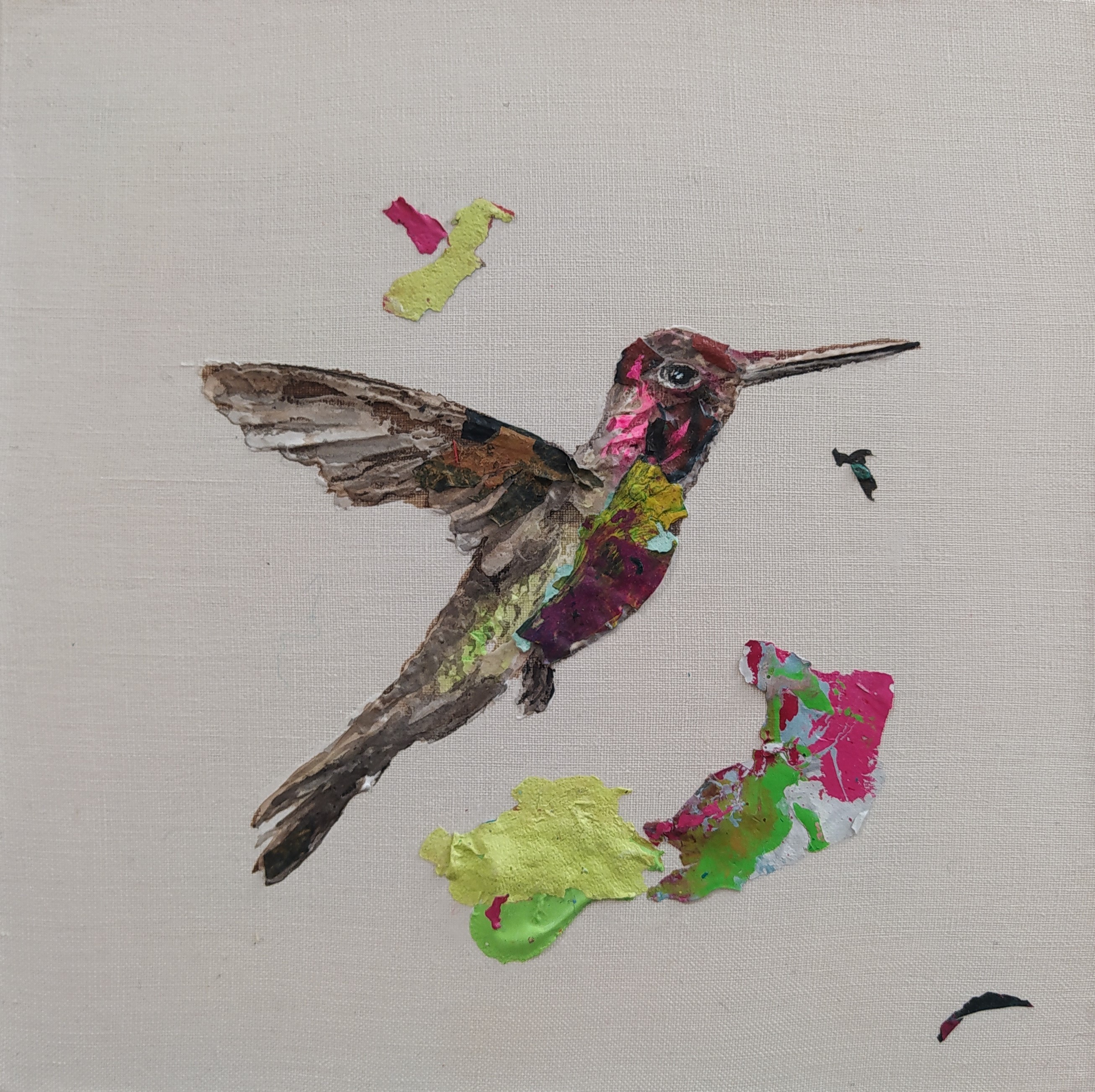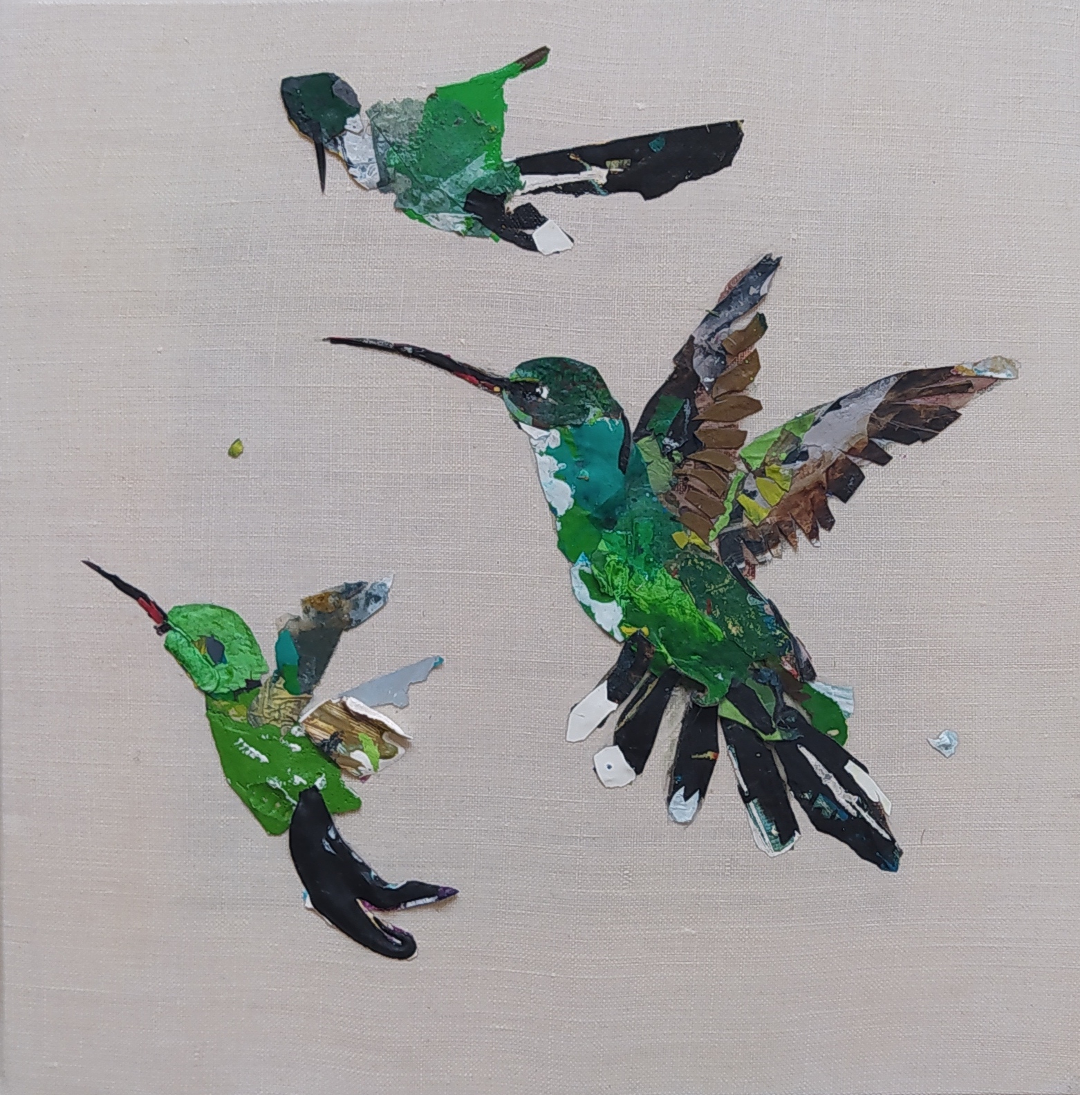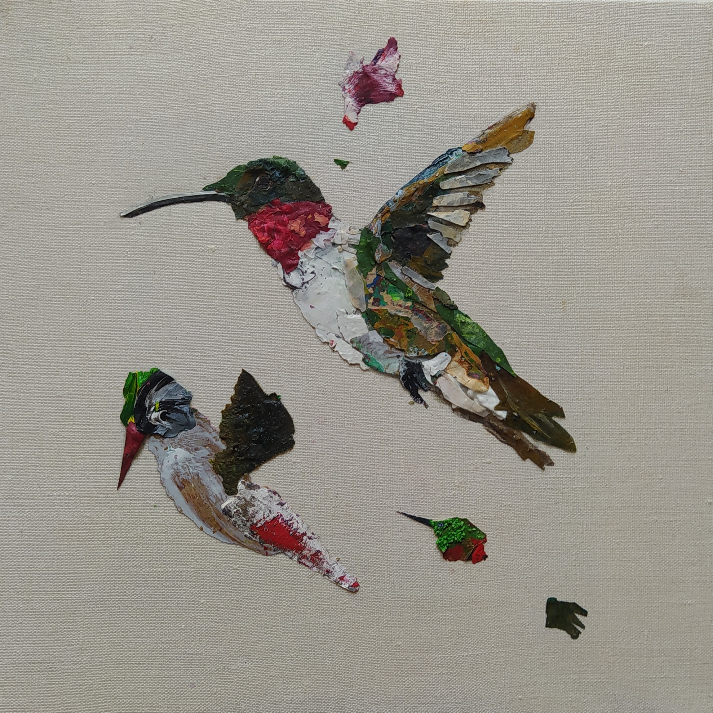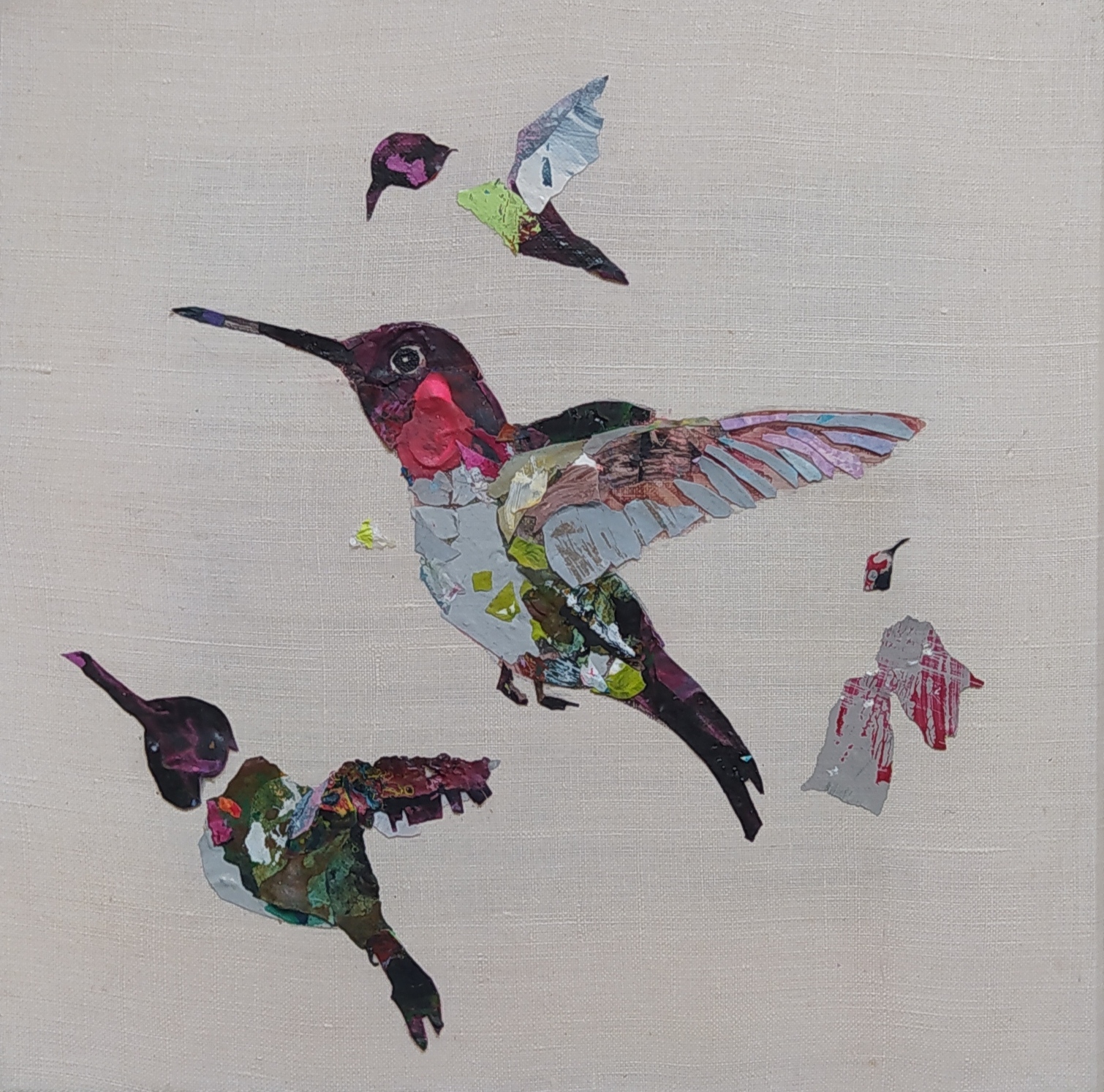 Except for the stretchers made of responsible wood, my overarching goal of producing as little waste as possible, through recycling and transforming the various materials that I already have at hand, has been respected : The paint scraps are leftover acrylic skins from when I had students in my studio, and the linen canvas is a precious gift; a fabric woven some one hundred years ago in France.