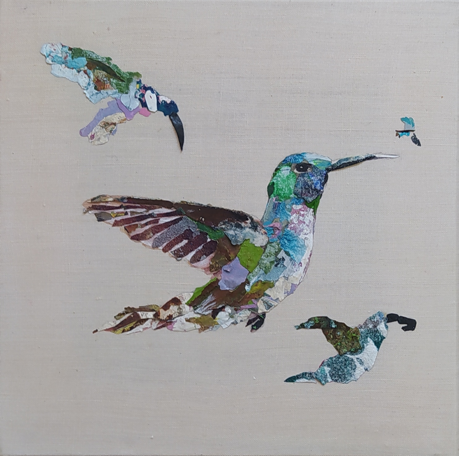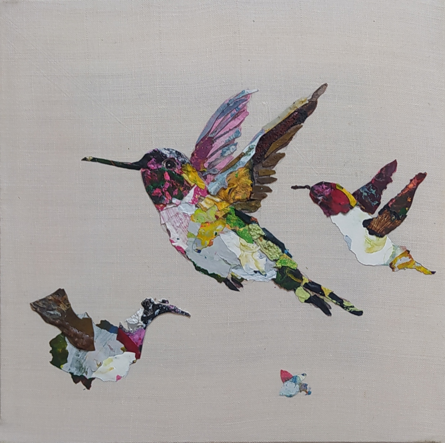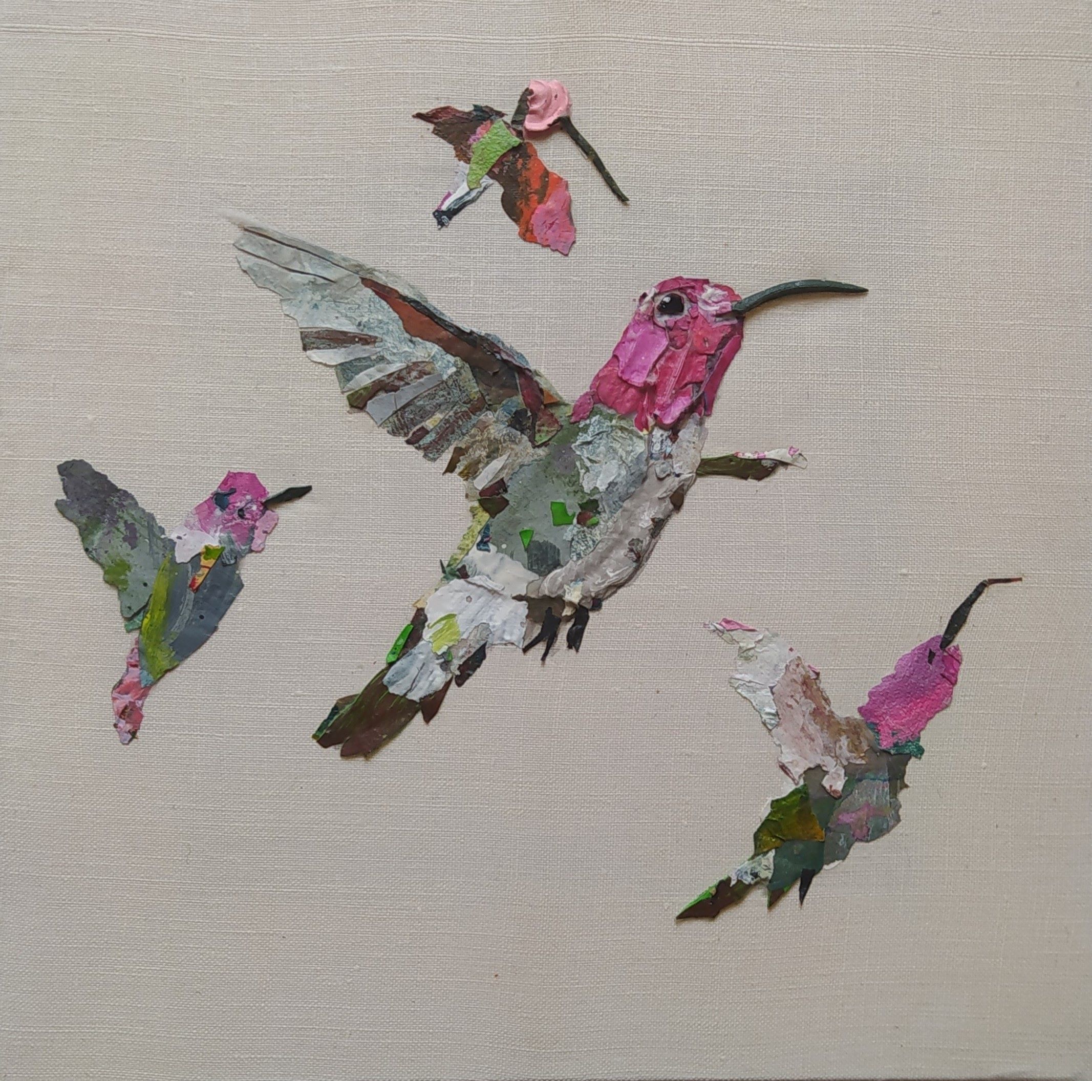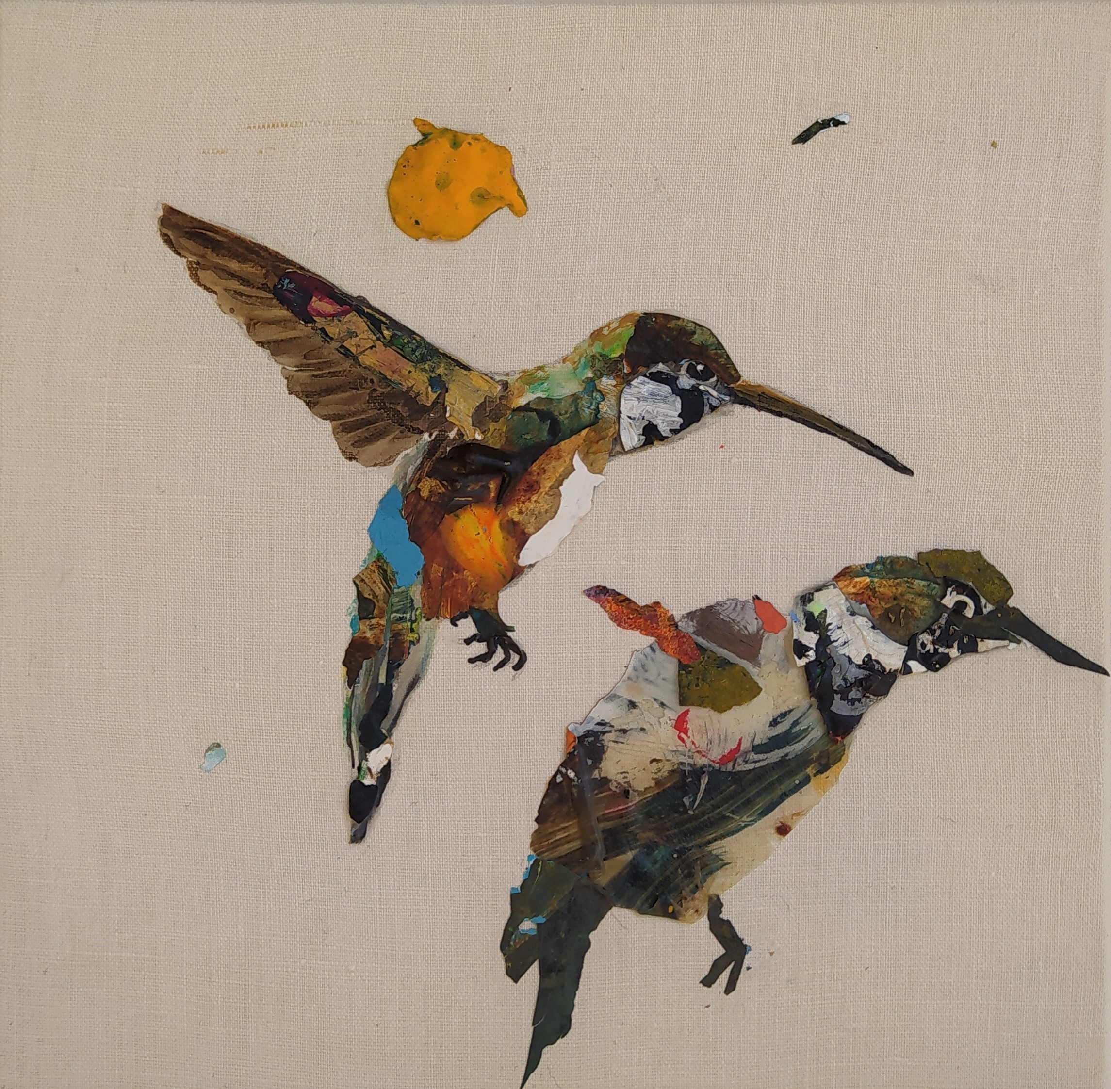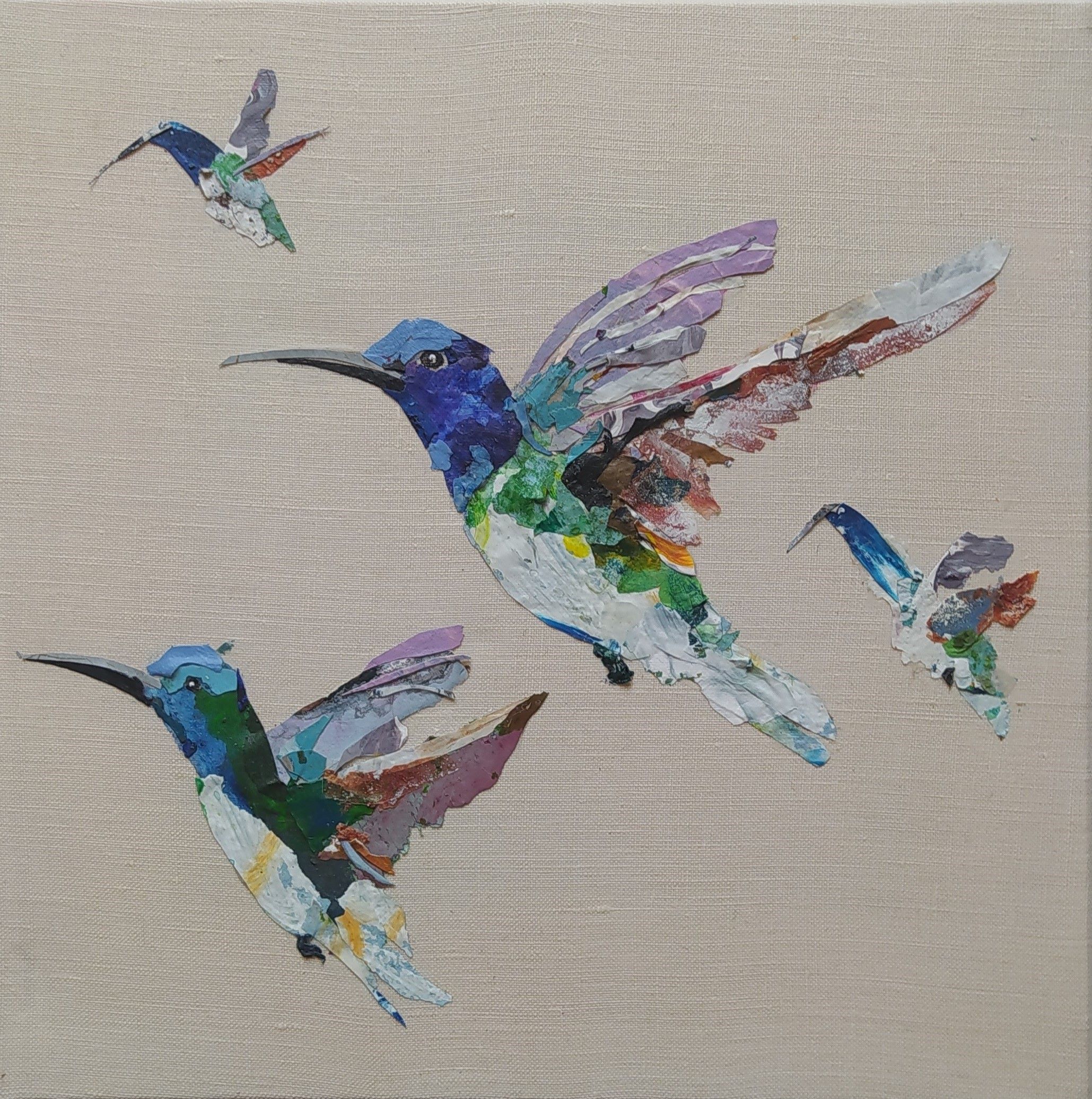 Except for the stretchers made of responsible wood, my overarching goal of producing as little waste as possible, through recycling and transforming the various materials that I already have at hand, has been respected : The paint scraps are leftover acrylic skins from when I had students in my studio, and the linen canvas is a precious gift; a fabric woven some one hundred years ago in France.
